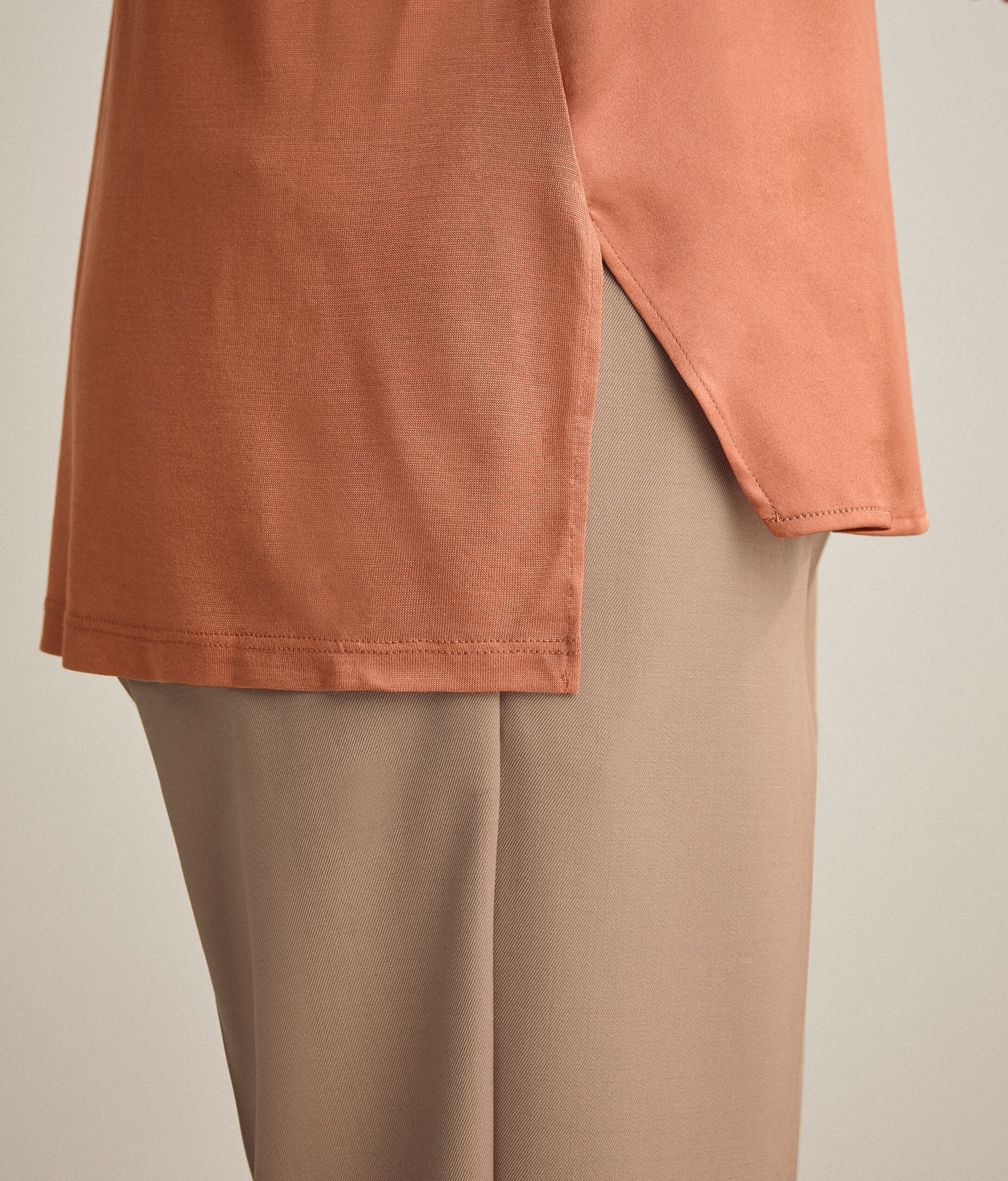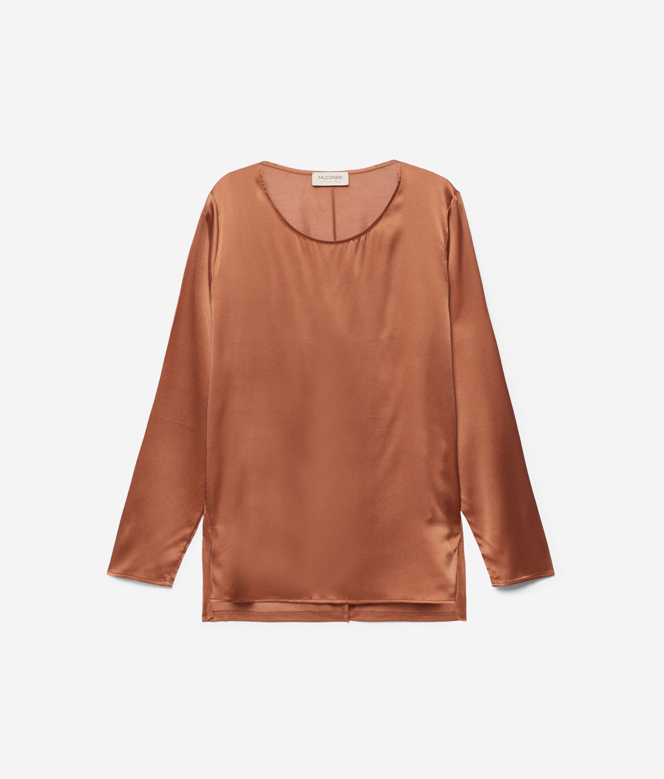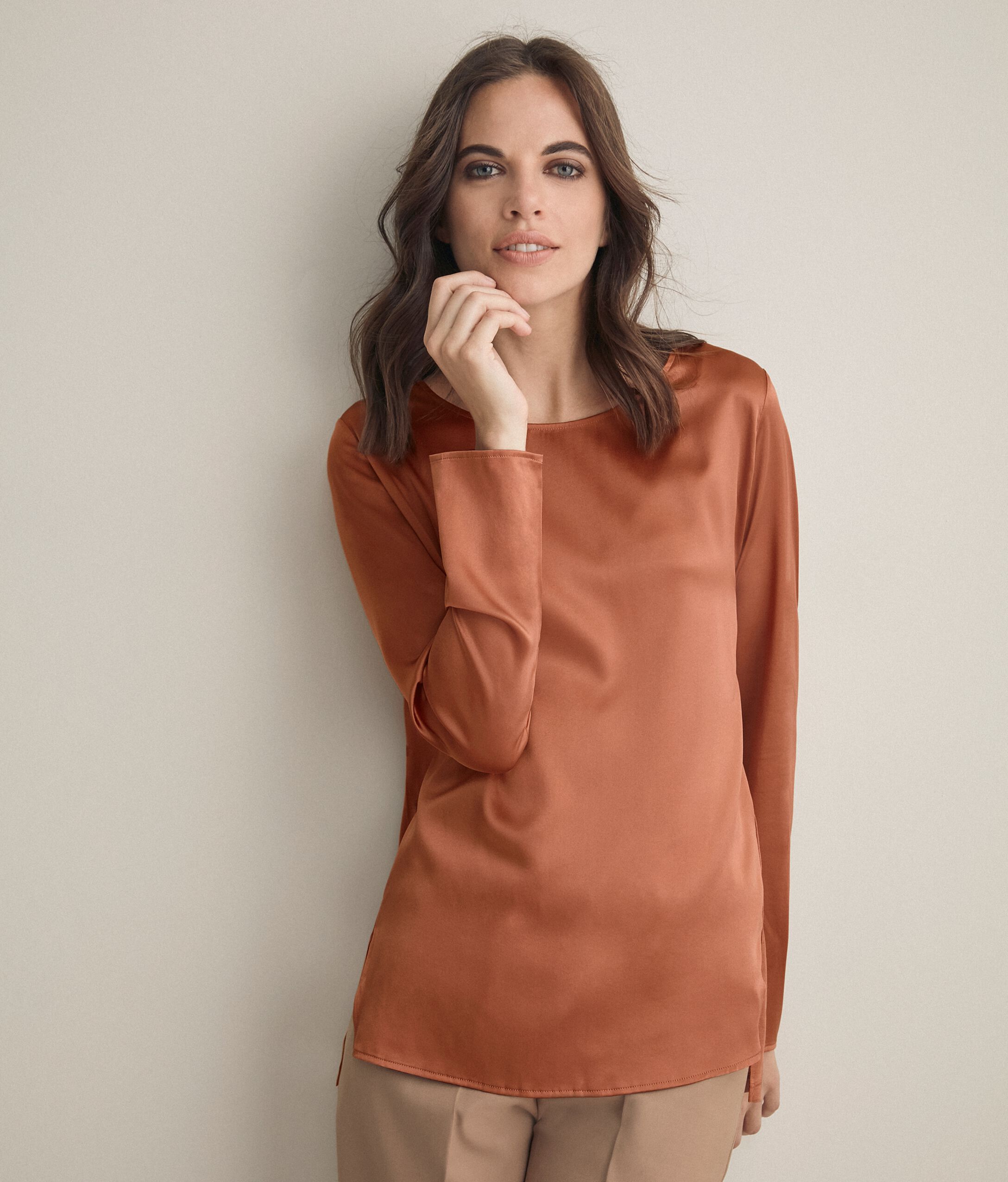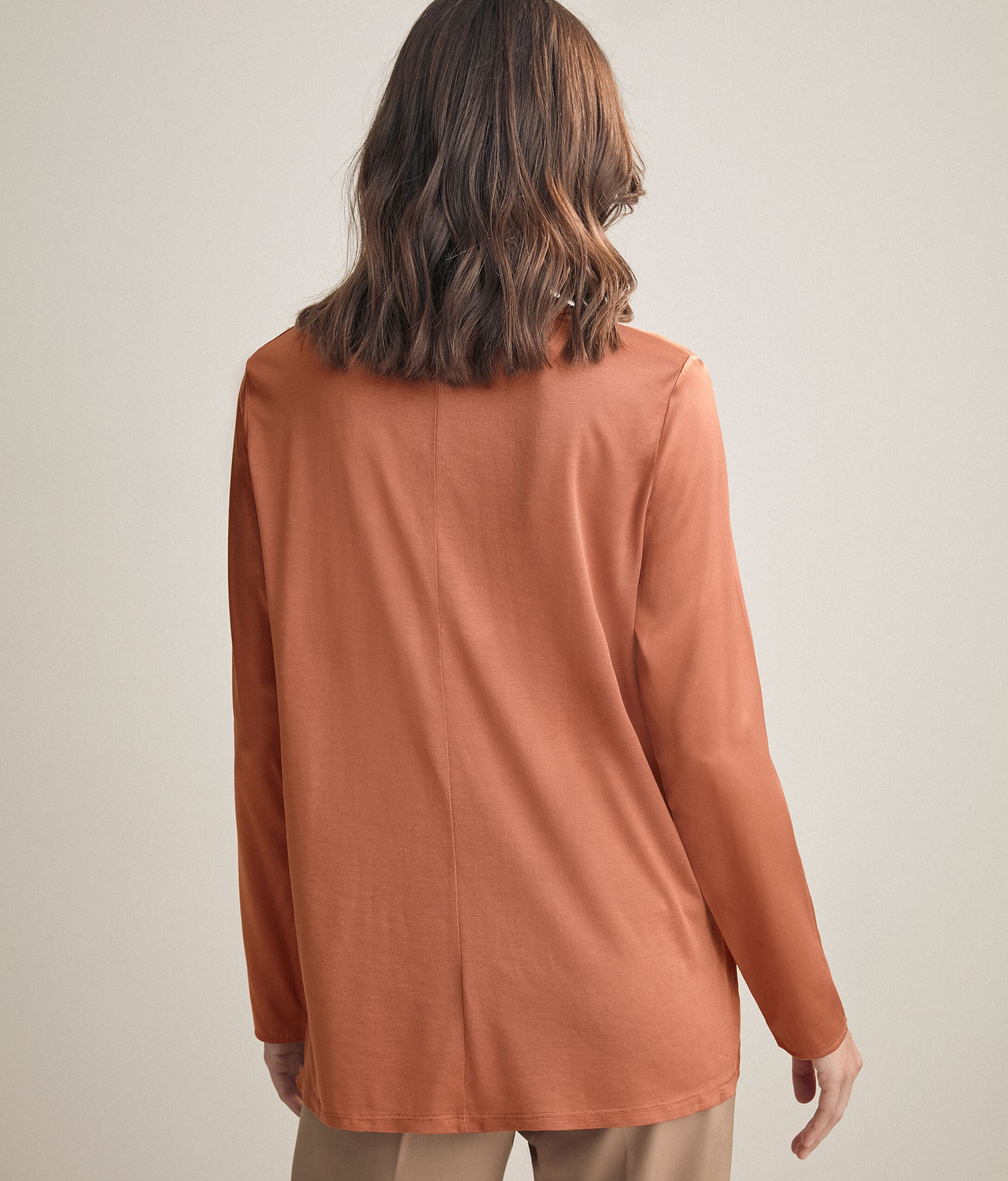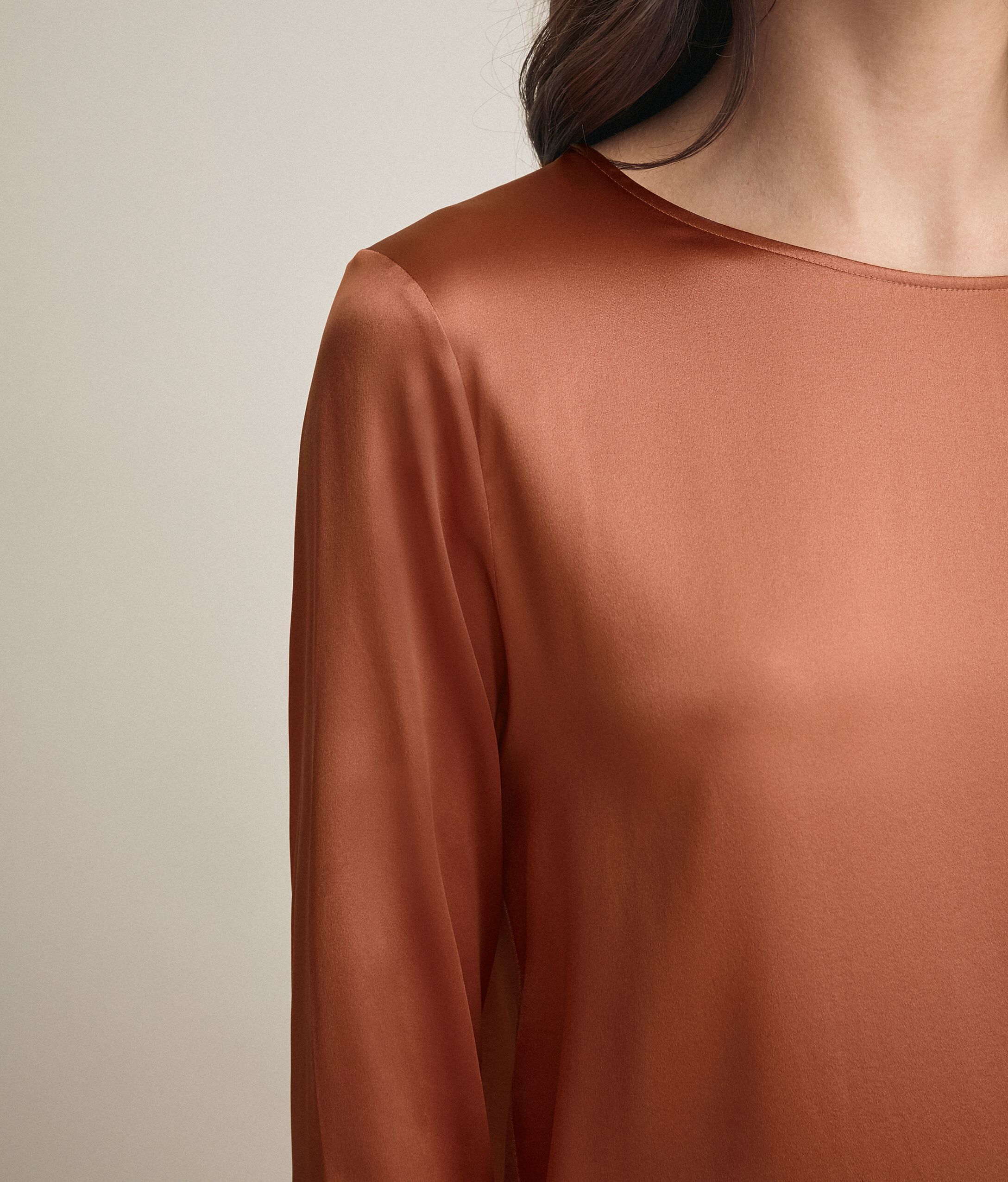 Blusa con scollo a barchetta realizzata in raso di seta sul davanti e in jersey di seta sul retro. È caratterizzata da due spacchi sulla parte frontale e da un taglio leggermente asimmetrico. Capo perfetto da indossare come sottogiacca. La modella è alta 179cm e veste una taglia MPetto: 88cm / Vita: 67cm / Fianchi: 94cm