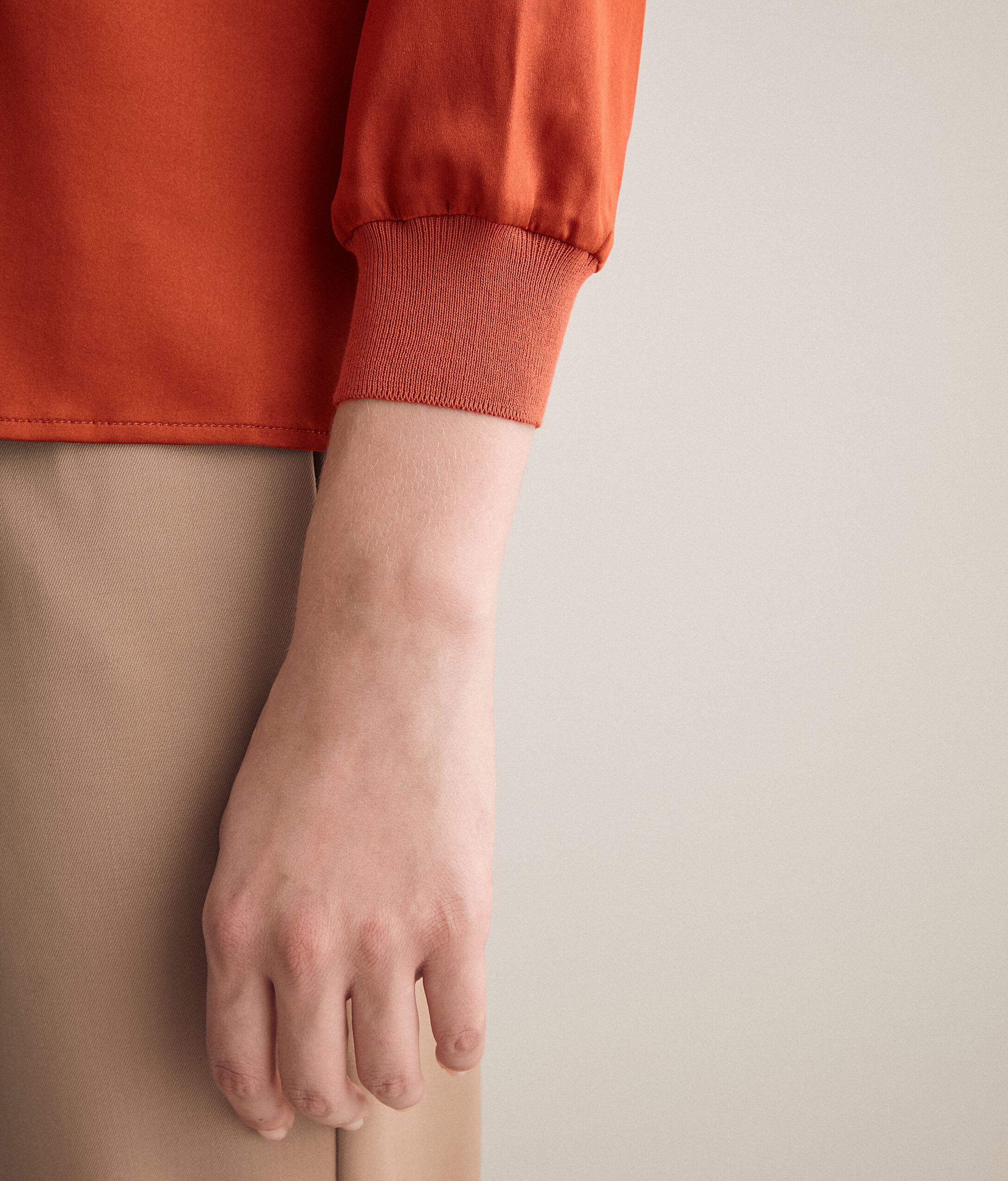Per chi cerca uno look sofisticato capace di valorizzare i dettagli di stile, Falconeri propone una blusa interamente realizzata in raso di seta sapientemente disegnata per enfatizzare le morbide linee del tessuto. I volumi più generosi e fluidi permettono un indosso confortevole ed i dettagli sartoriali come i polsi in maglia di cotone ne rendono più grintoso lo stile. La modella è alta 179 cm e veste una taglia MPetto: 88cm / Vita: 67cm / Fianchi: 94cm