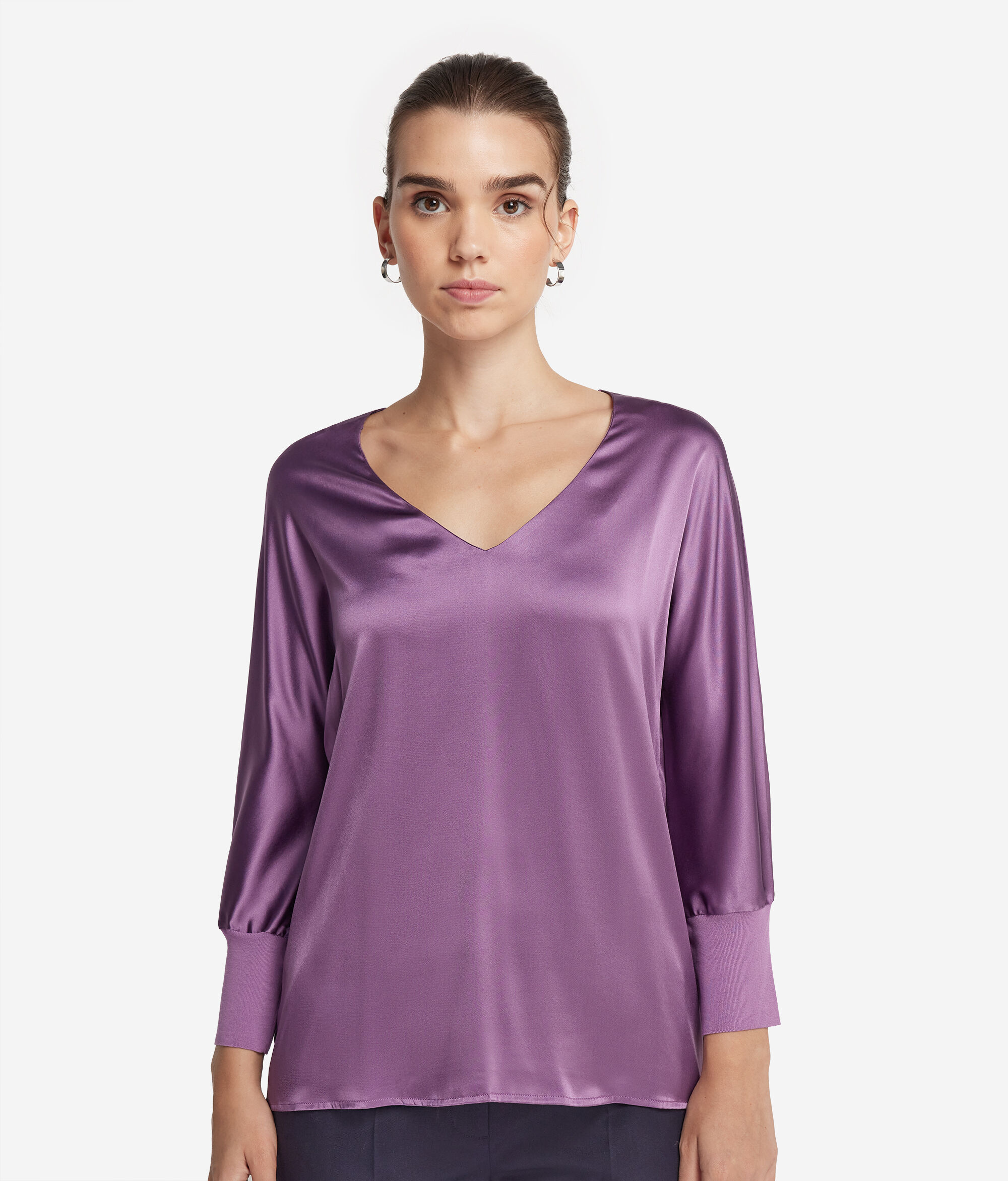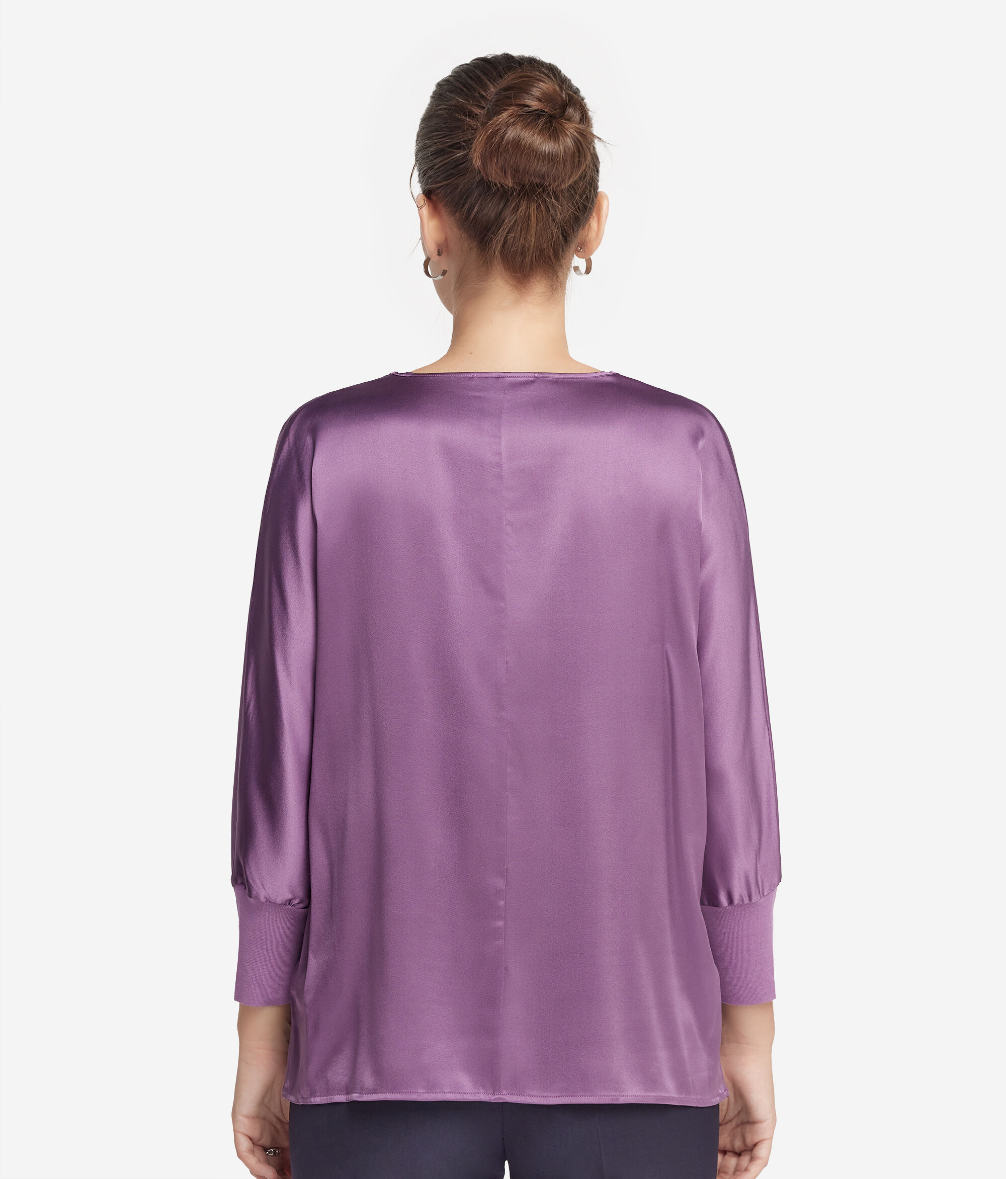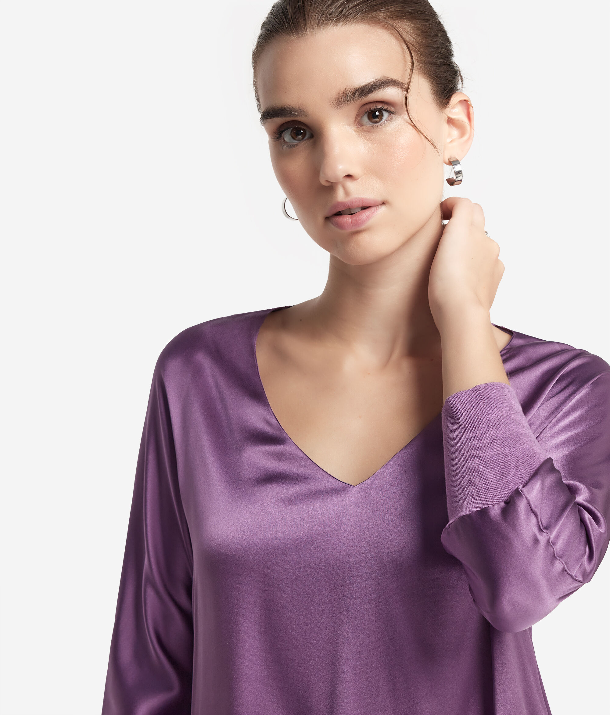 Per chi cerca uno look sofisticato capace di valorizzare i dettagli di stile, Falconeri propone una blusa interamente realizzata in raso di seta sapientemente disegnata per enfatizzare le morbide linee del tessuto. I volumi più generosi e fluidi permettono un indosso confortevole ed i dettagli sartoriali come i polsi in maglia di cotone e lo scollo a V ne rendono più grintoso lo stile.