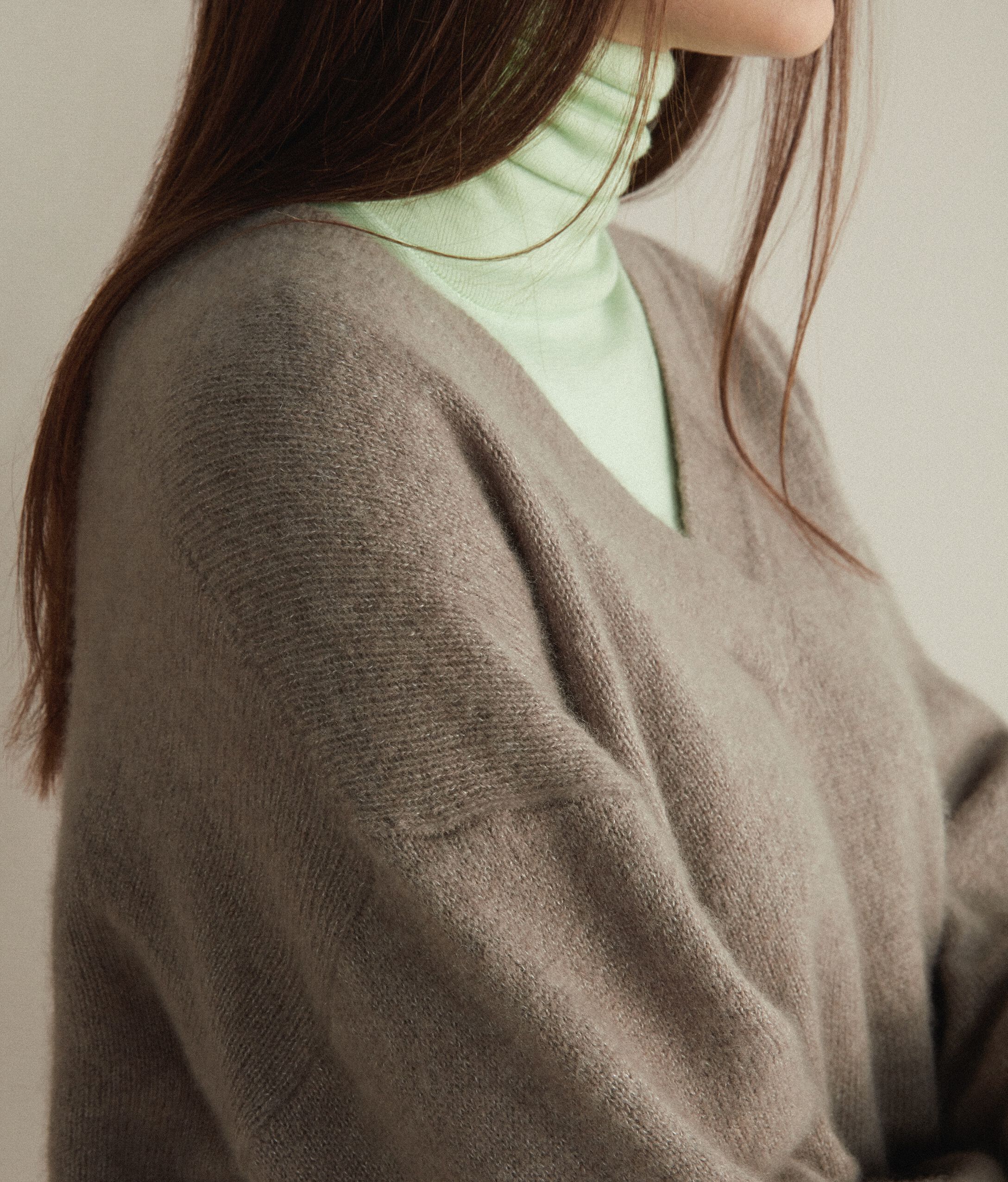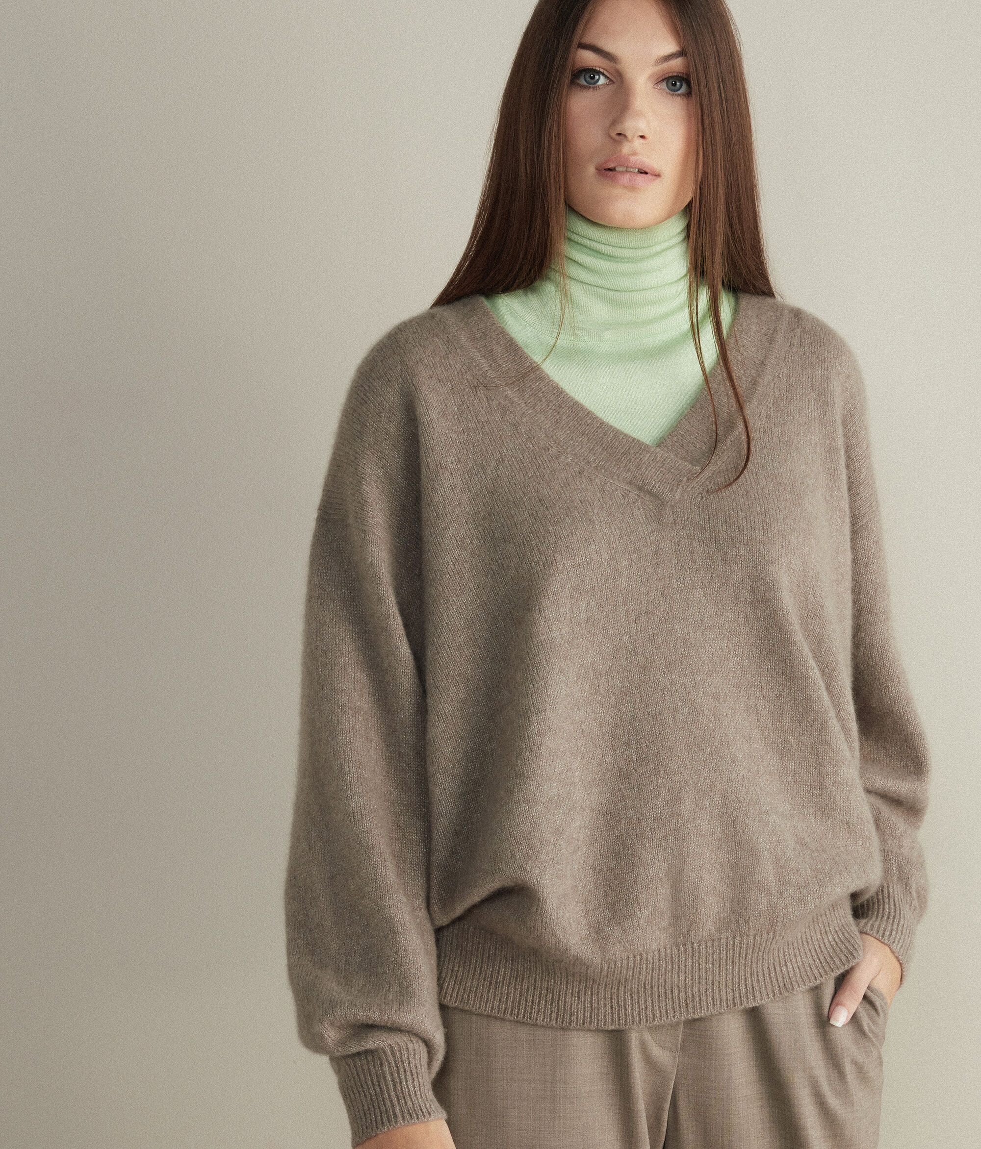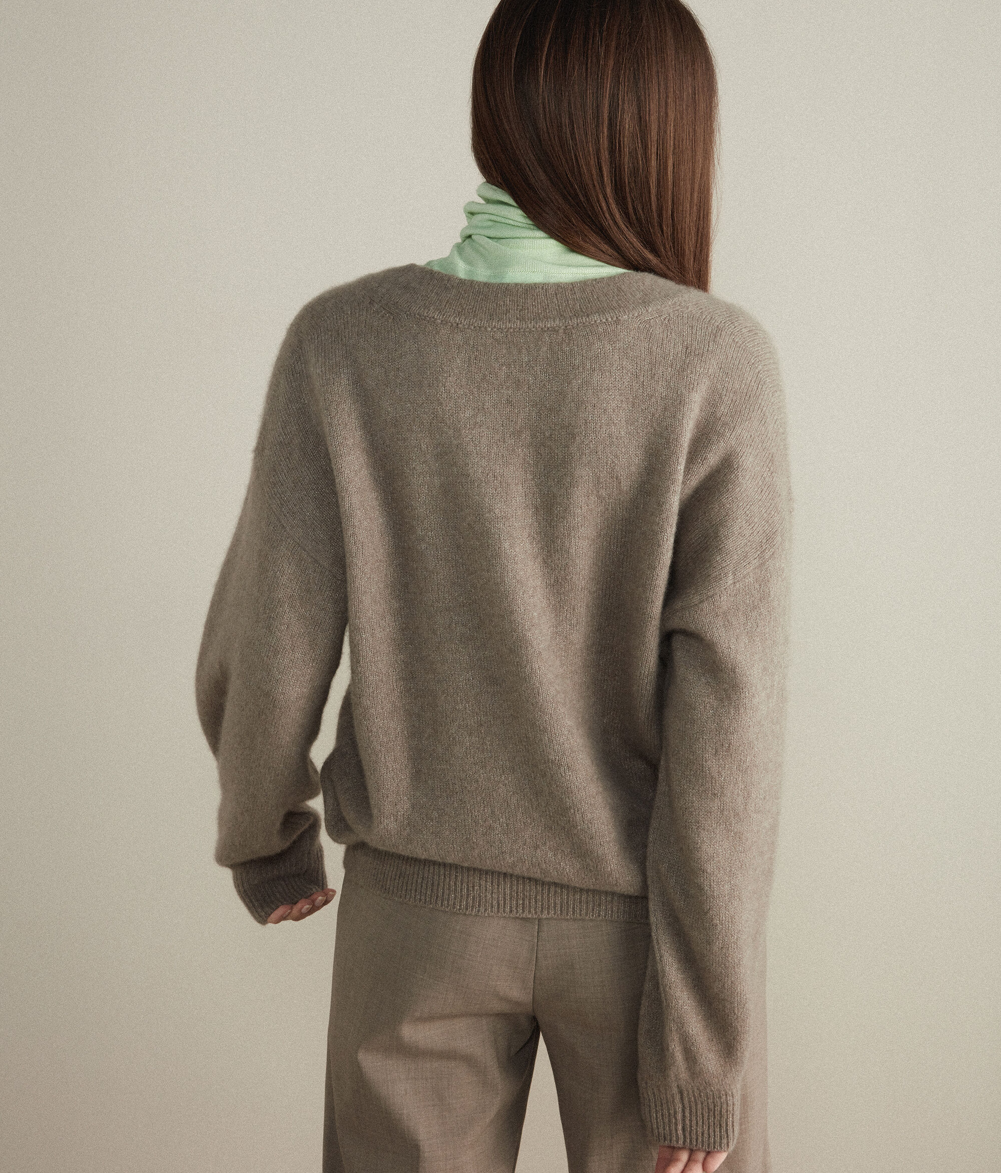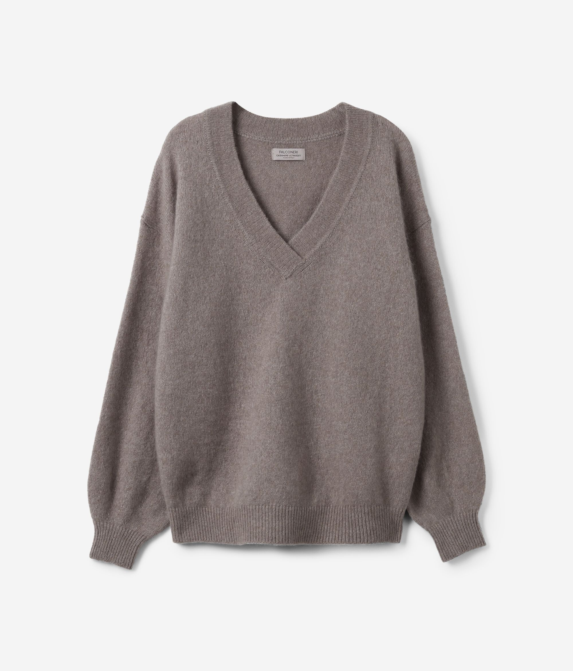 Maglia con scollo a V profondo sormontato in pregiato filato di cashmere e seta. Spalle leggermente scese e maniche ampie. Polsini e fondo a costine.