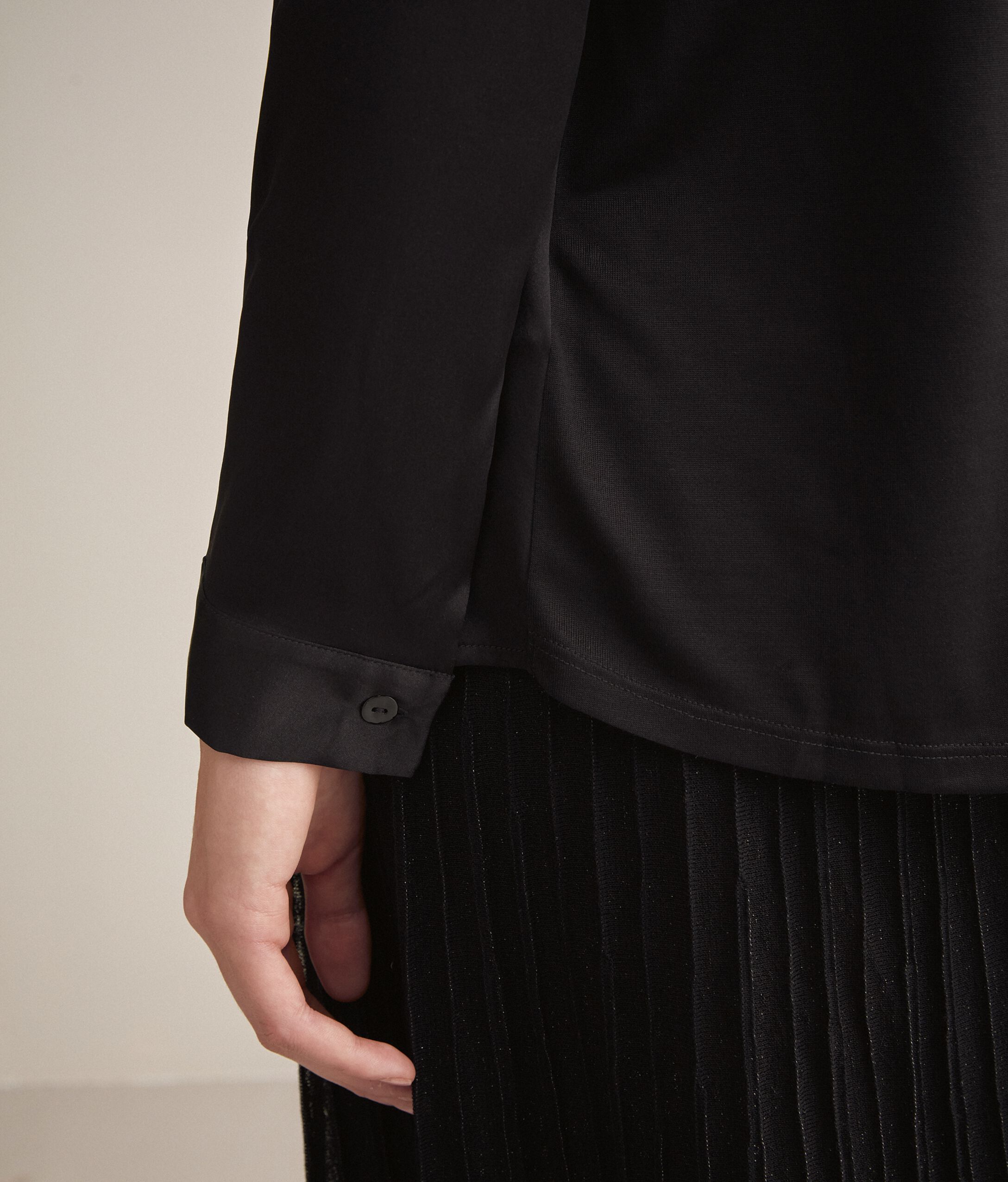 Camicia in raso di seta con collo alla coreana e scollo a V profondo chiuso da un bottoncino. Spalla leggermente scesa. La parte anteriore del capo è in raso di seta mentre la parte posteriore è in jersey di seta. Capo molto raffinato ed elegante. La modella è alta 179cm e veste una taglia MPetto: 88cm / Vita: 67cm / Fianchi: 94cm