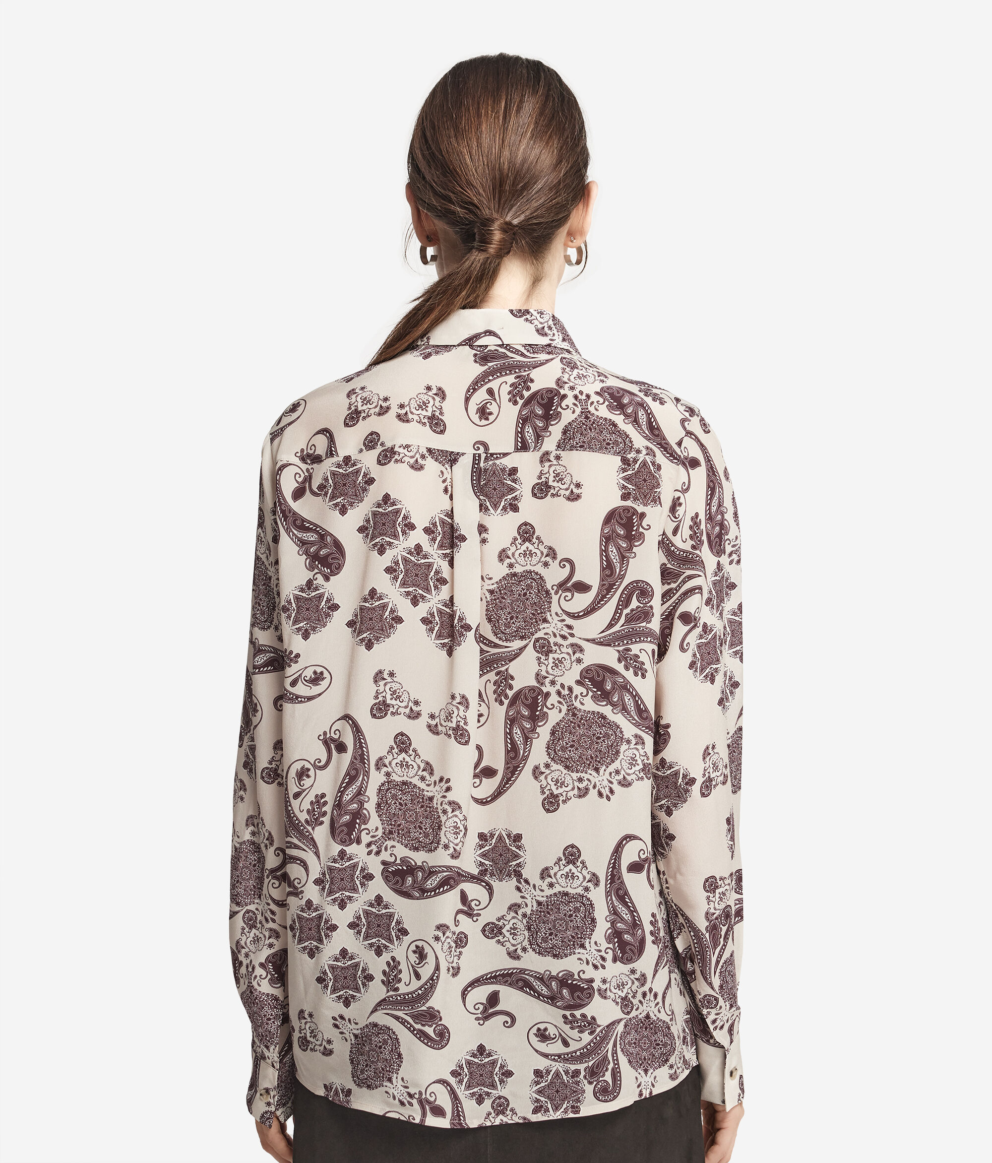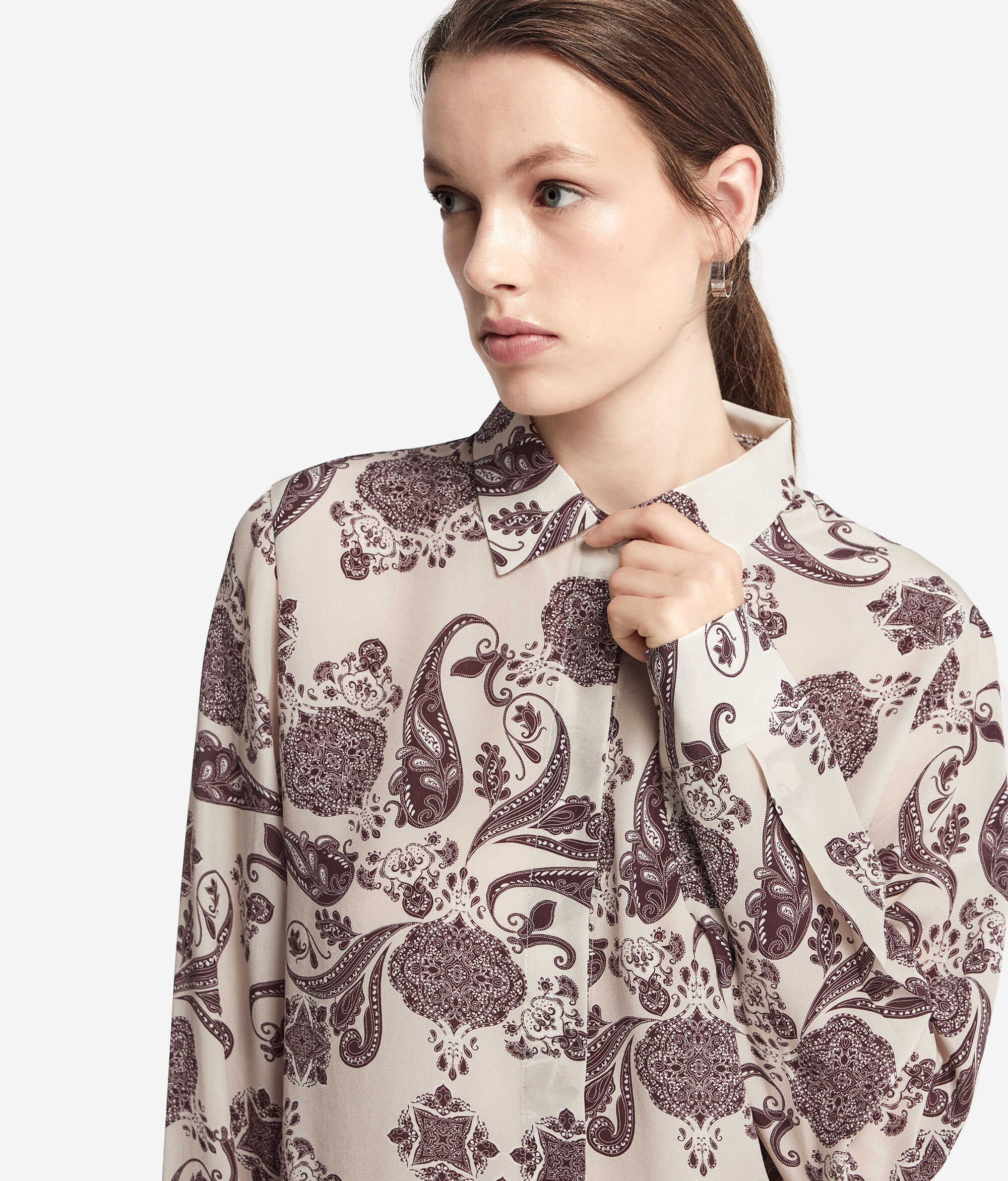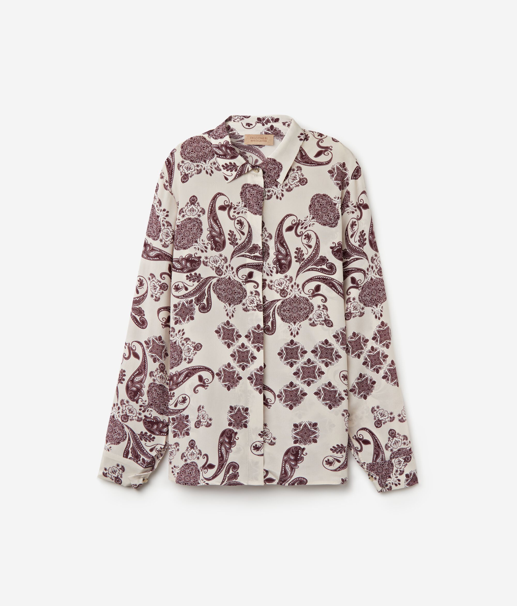 Realizzata in seta stampata, questa camicia offre un look distintivo e raffinato, perfetto per le occasioni in cui si desidera emergere con stile. Il tessuto offre un'eleganza naturale, arricchita da motivi che aggiungono personalità al capo. Il colletto classico completa il design tradizionale mentre la chiusura con bottoni a scomparsa contribuisce a mantenere una linea minimale e ordinata. Una scelta ideale per chi ama l'eleganza della seta combinata con dettagli sartoriali attentamente pensat