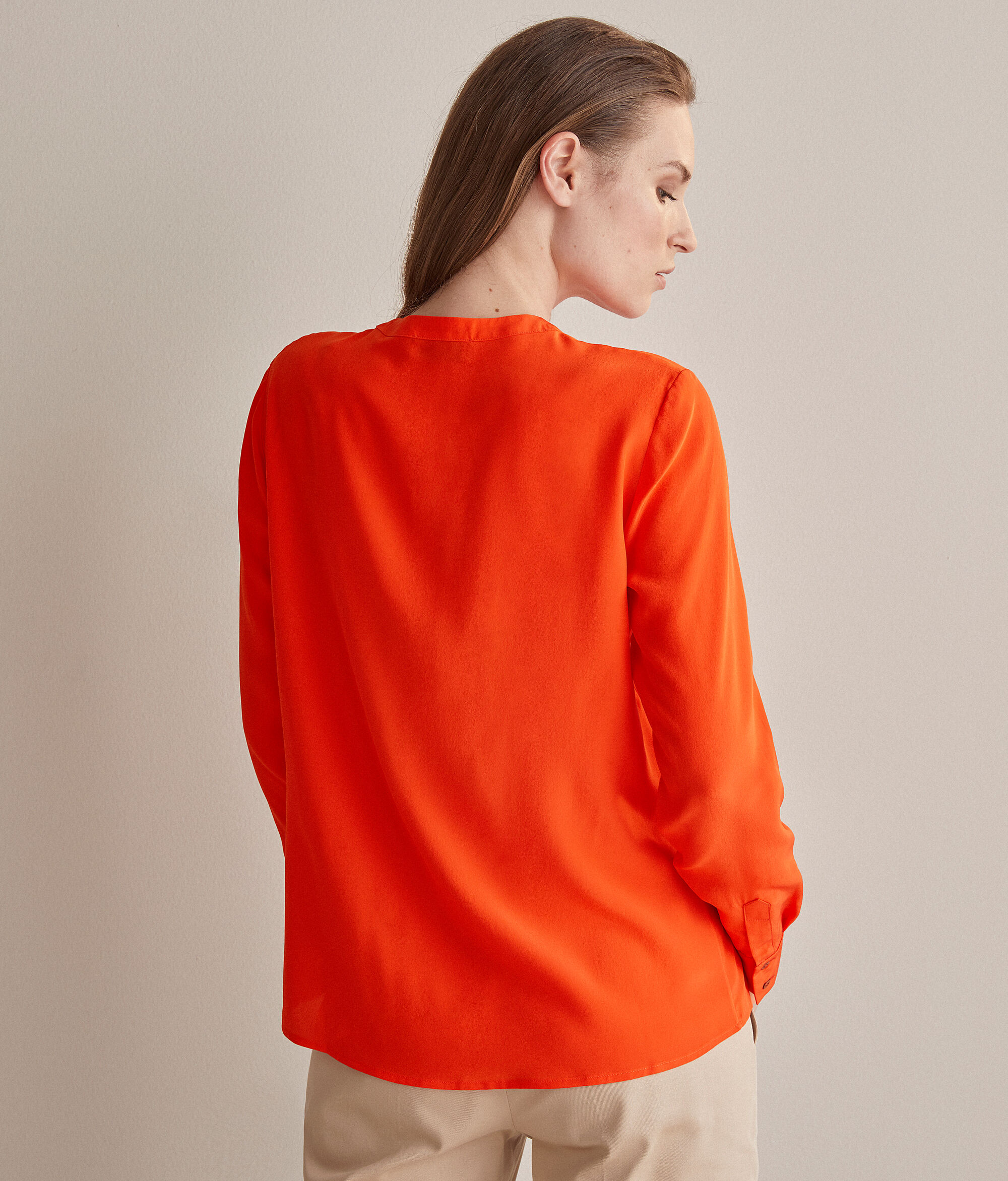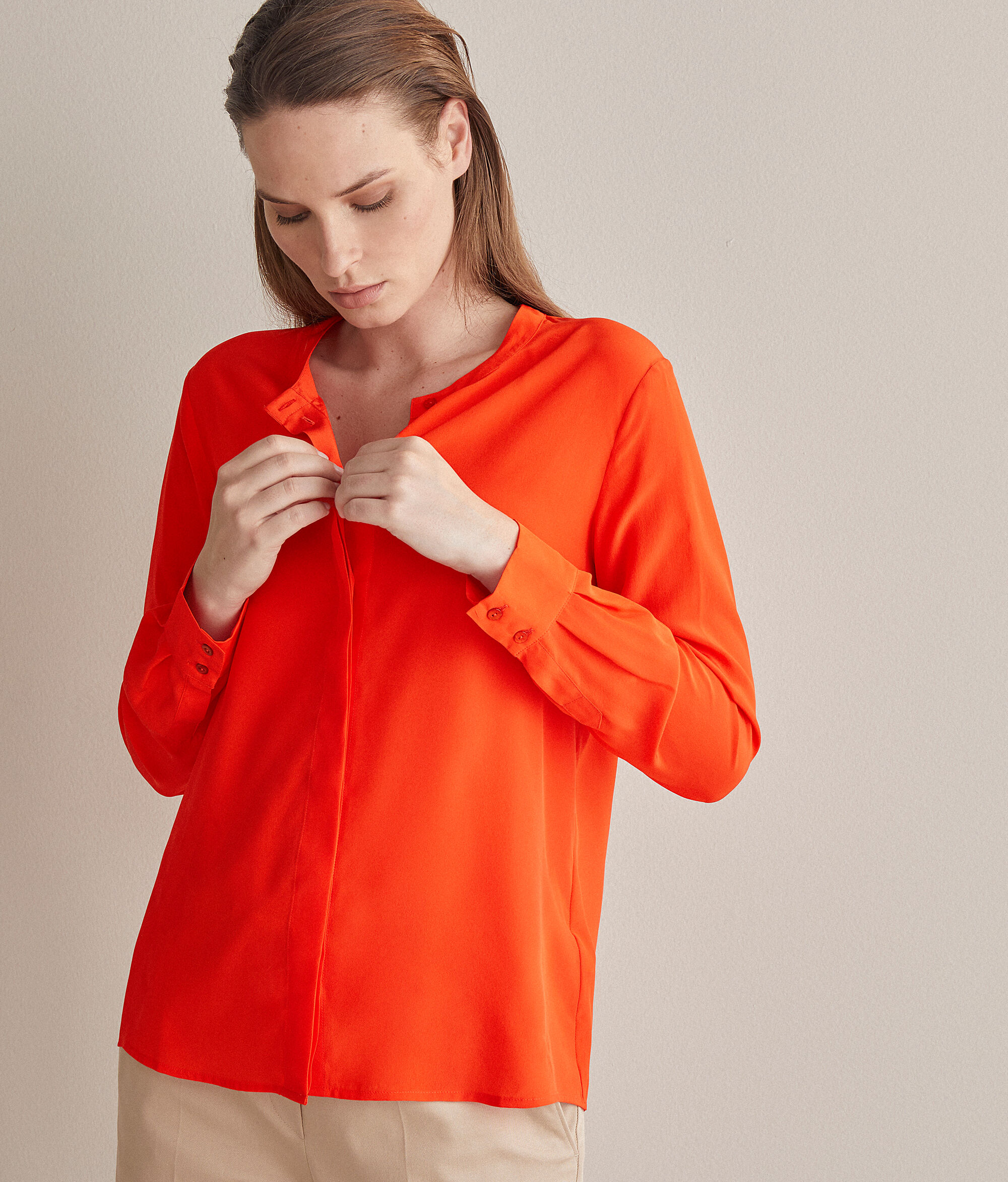 L'identità del brand prende vita dal pregio dei filati e si esprime nelle linee pulite ed armoniose della collezione in un raffinato equilibrio di fascino e stile. La texture rarefatta della pura seta crepe de chine esalta i volumi di questa camicia girocollo e fluida avvolge le forme femminili in una delicata trasparenza. La lunghezza è stondata e regolare, la chiusura con bottoni è a scomparsa