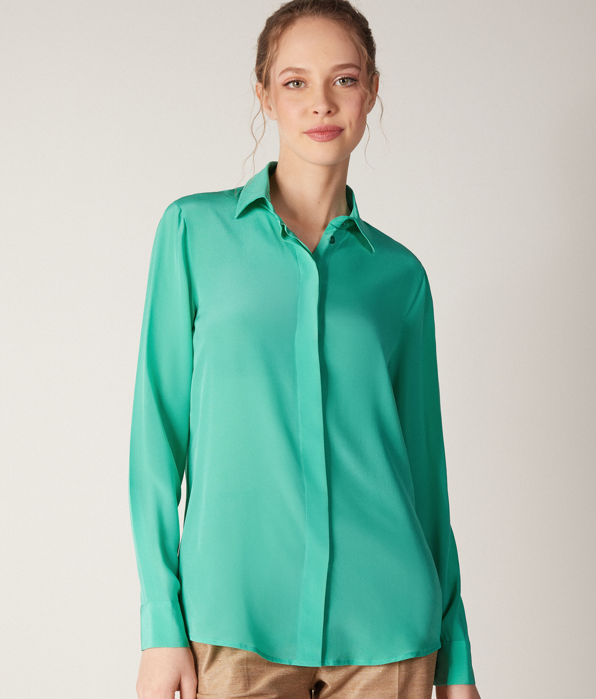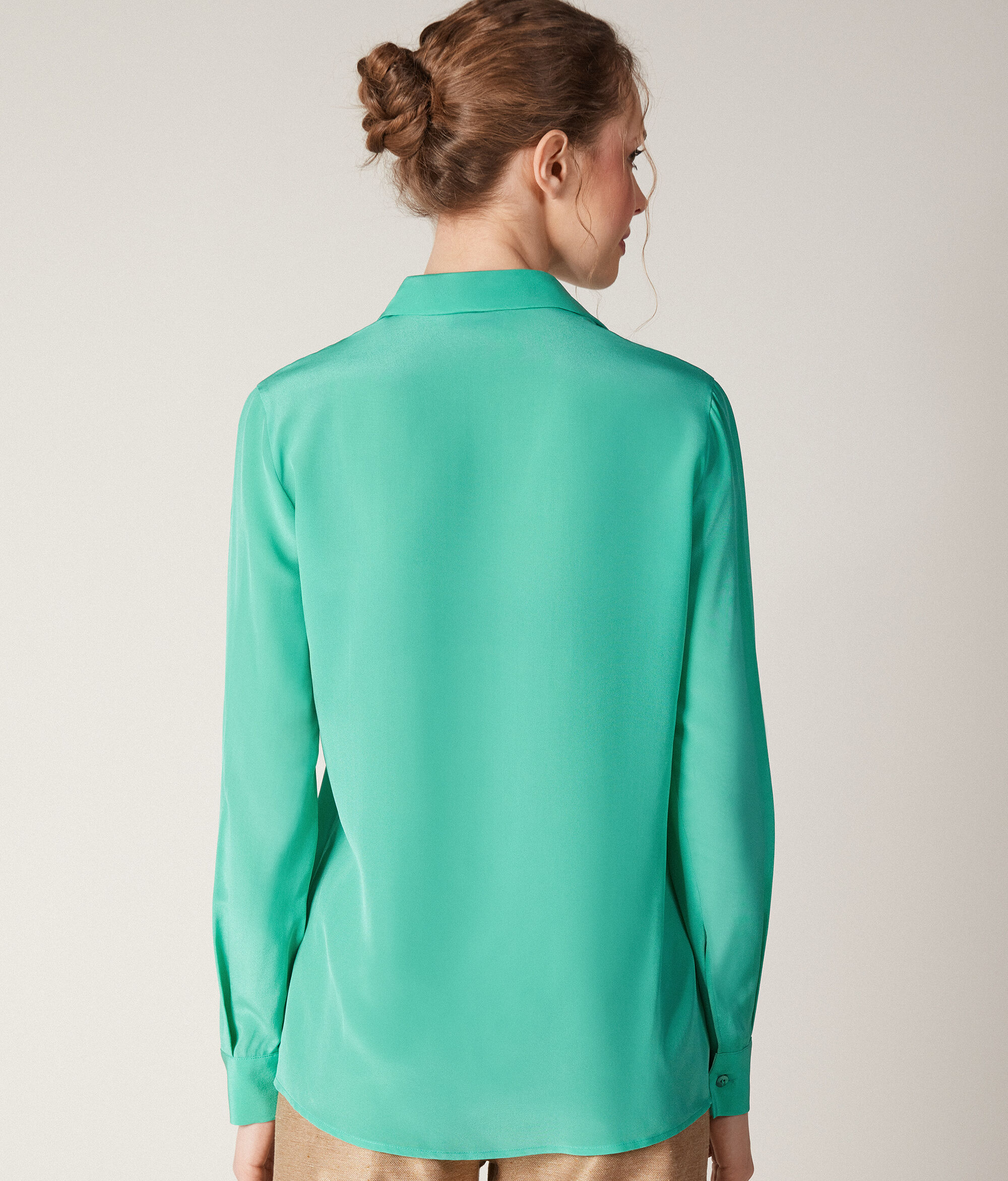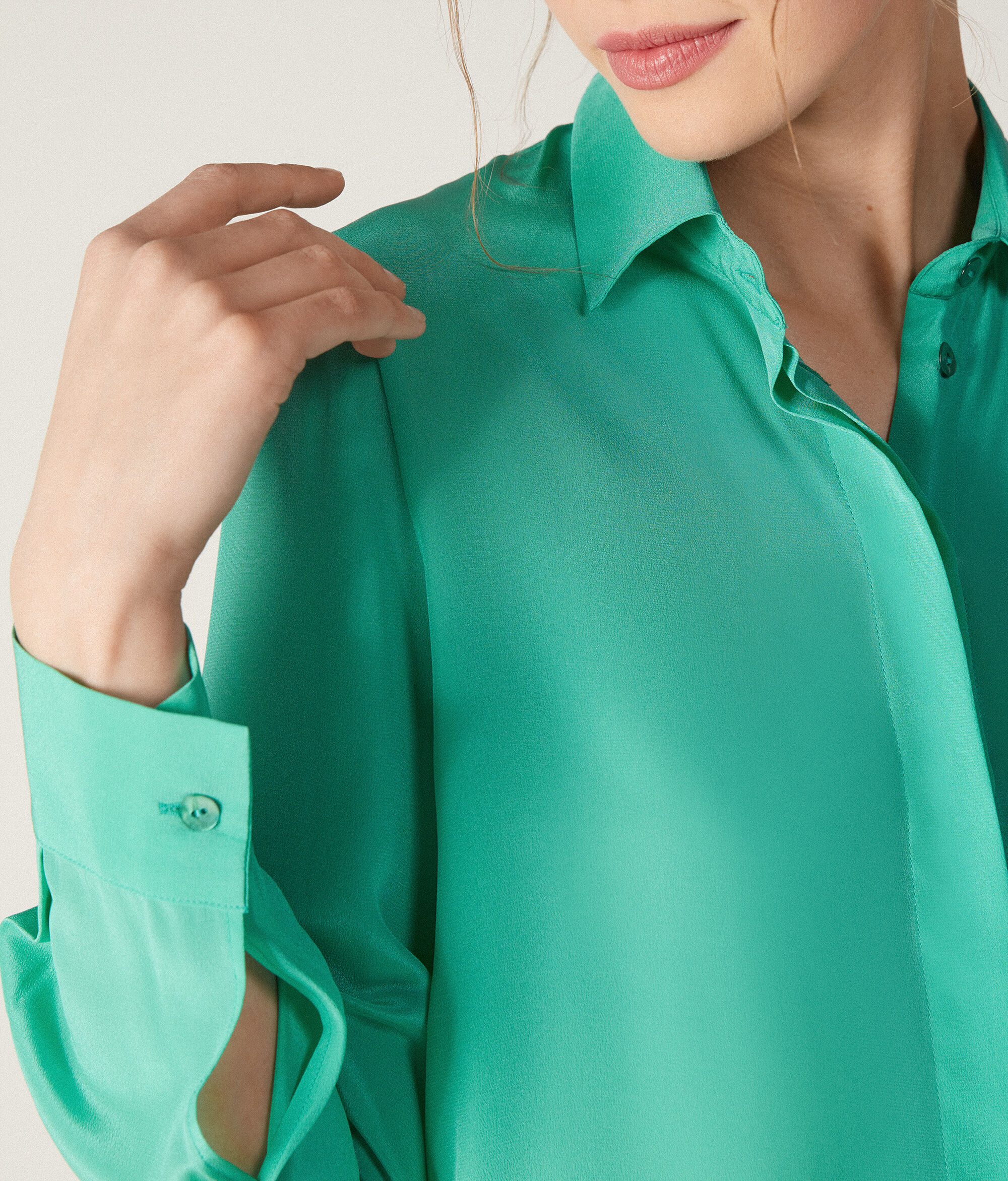 Il pregio della texture della pura seta esalta i volumi di questa camicia raffinata e moderna, che fluida avvolge ed esalta le forme femminili in una delicata morbidezza.