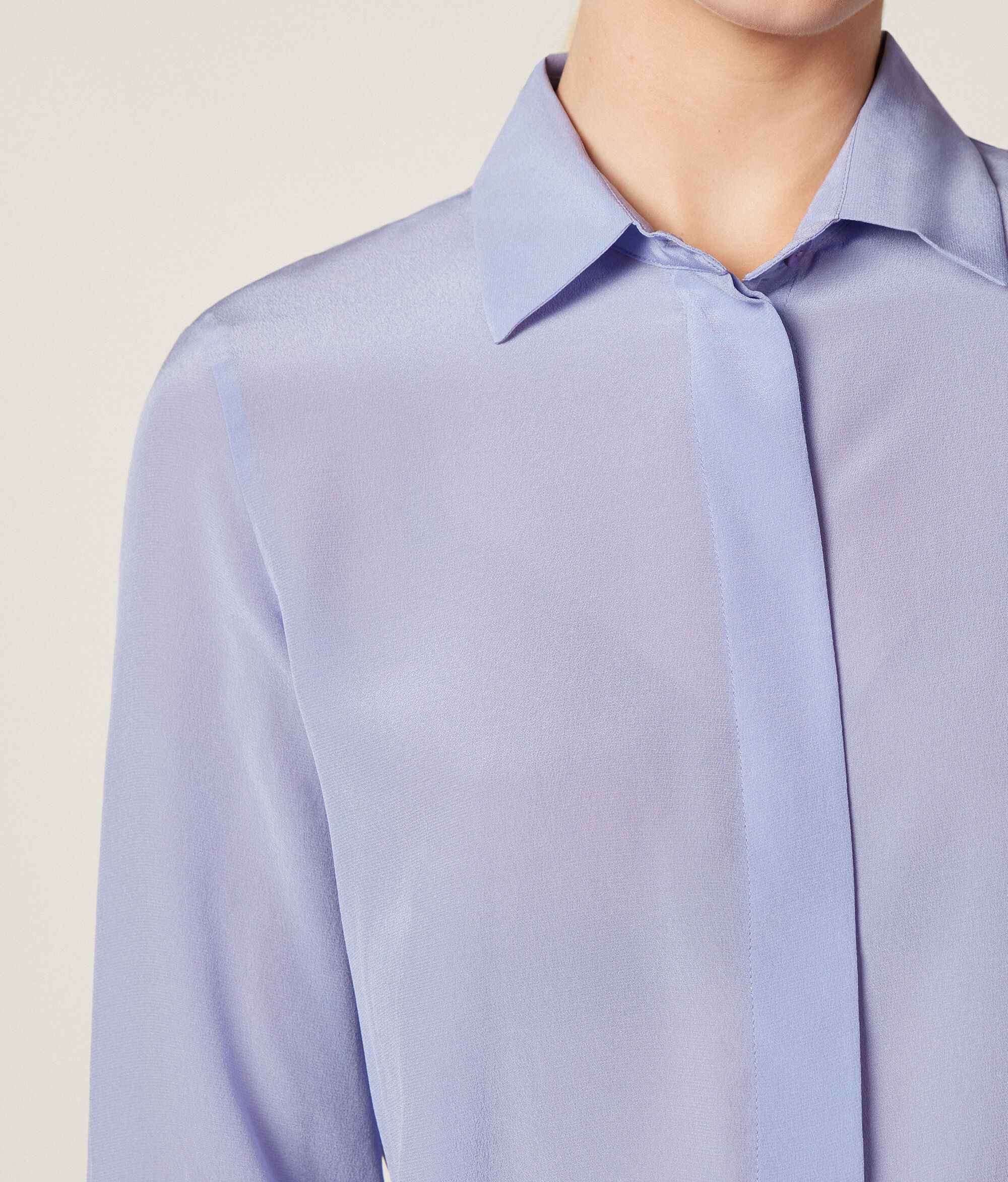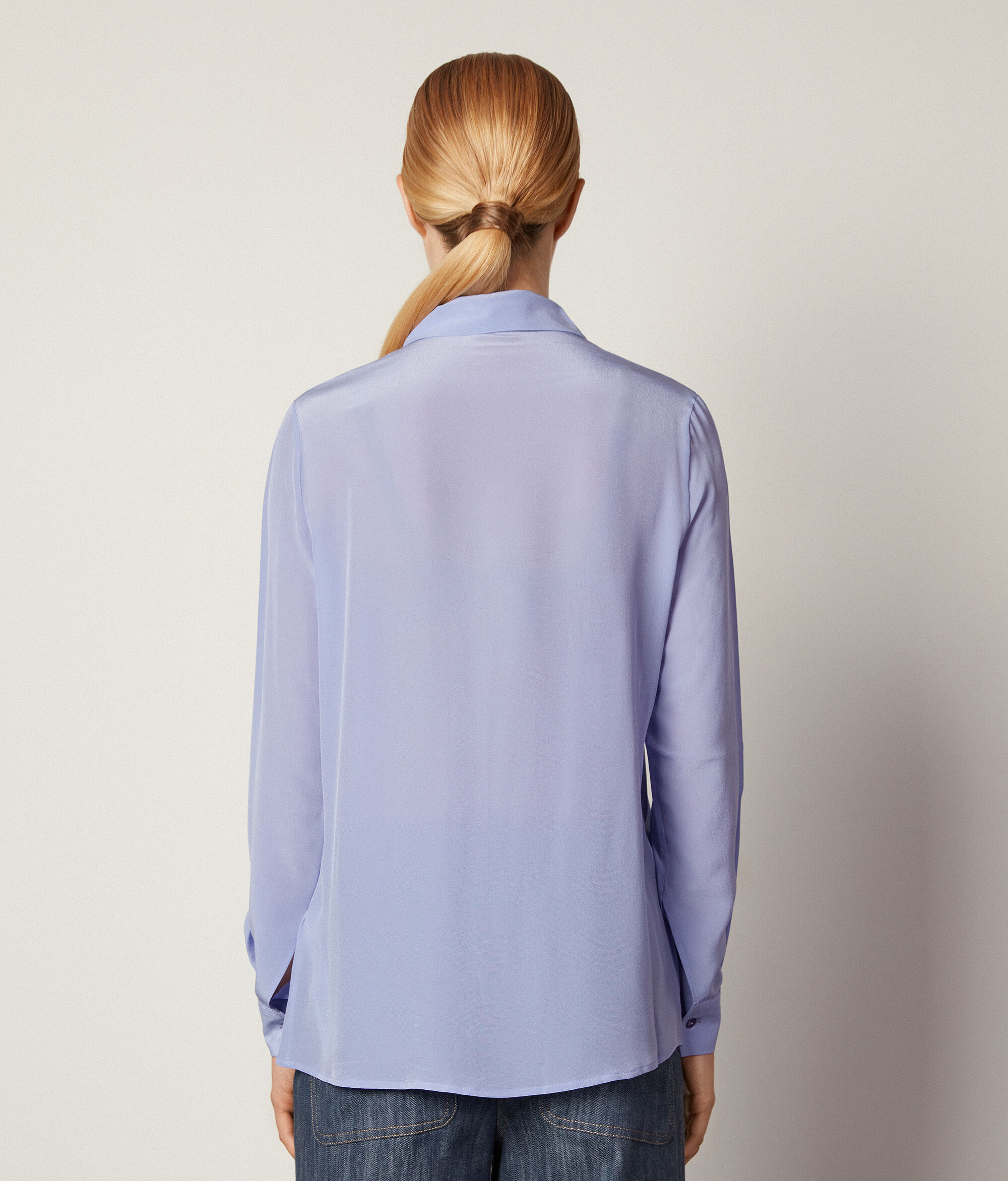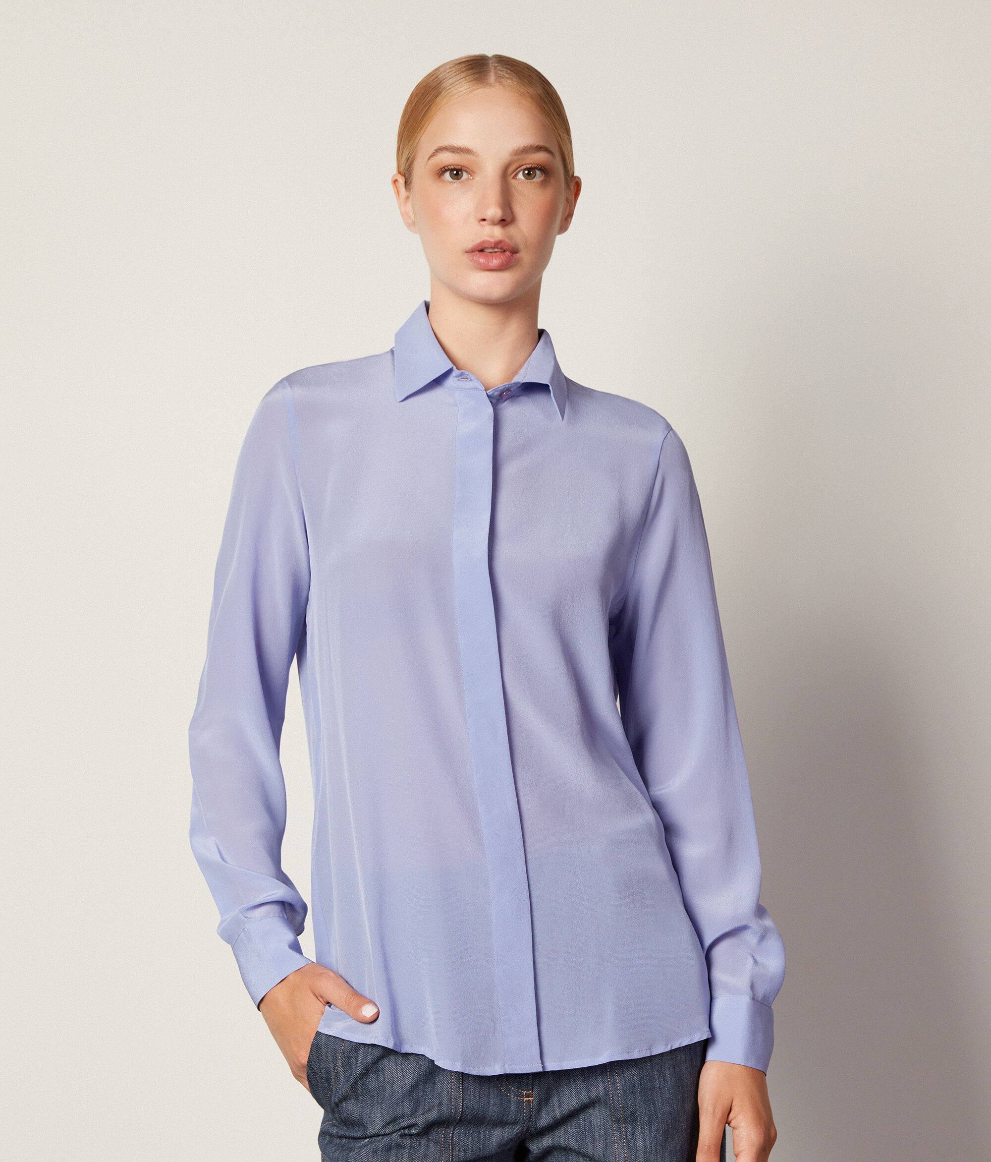 Il pregio della texture della pura seta esalta i volumi di questa camicia raffinata e moderna, che fluida avvolge ed esalta le forme femminili in una delicata morbidezza.