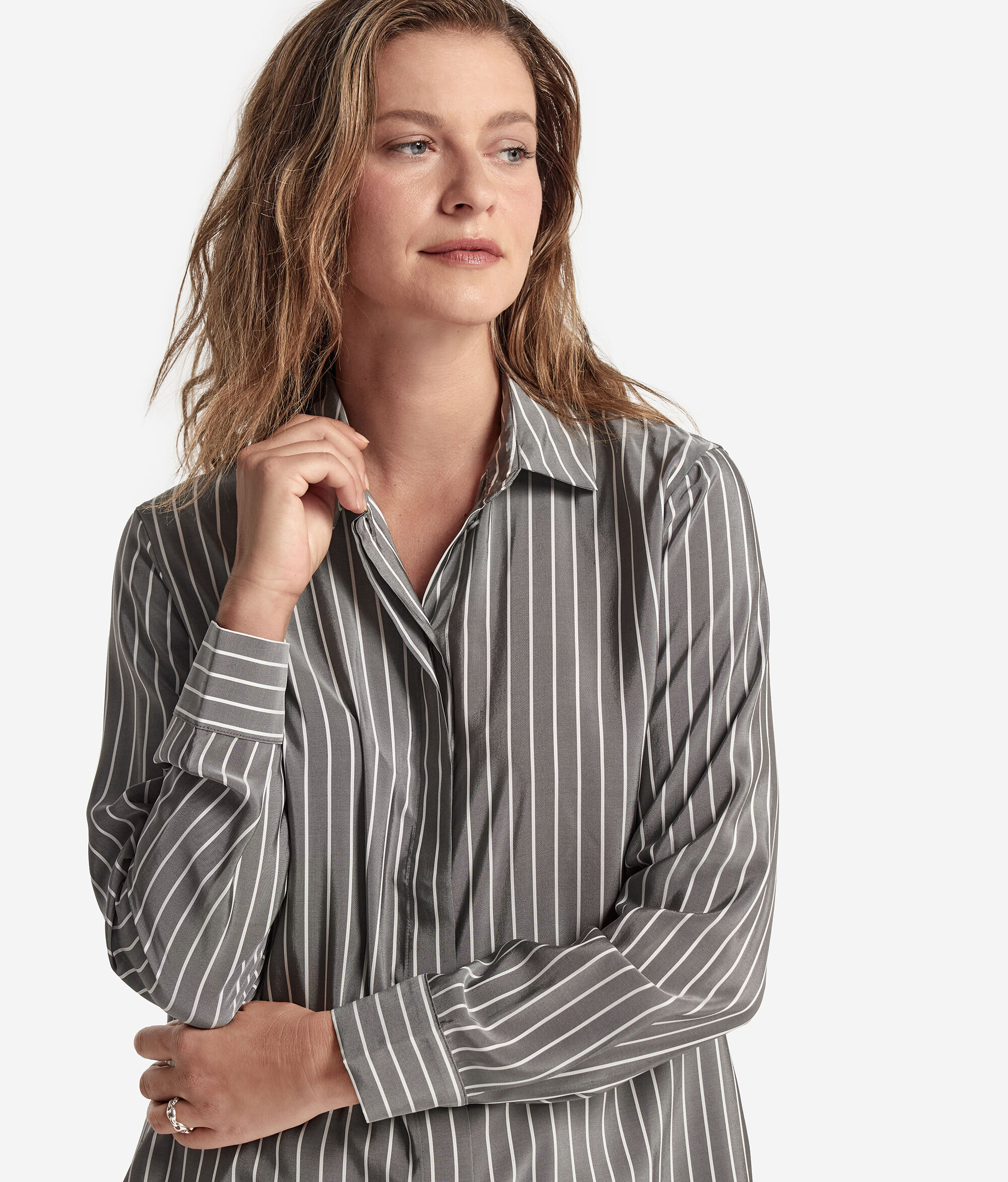 Scopri l'eleganza senza tempo di questa camicia realizzata in seta rigata. Il design è caratterizato da una chiusura con bottoni a scomparsa, garantendo una linea pulita ed essenziale. Le spalle regolari assicurano una vestibilità confortevole e naturale, mentre il fondo leggermente stondato contribuisce a creare una linea armoniosa. Sobria ma distintamente raffinata non può mancare nell'armadio di chi ama qualità e stile senza compromessi.