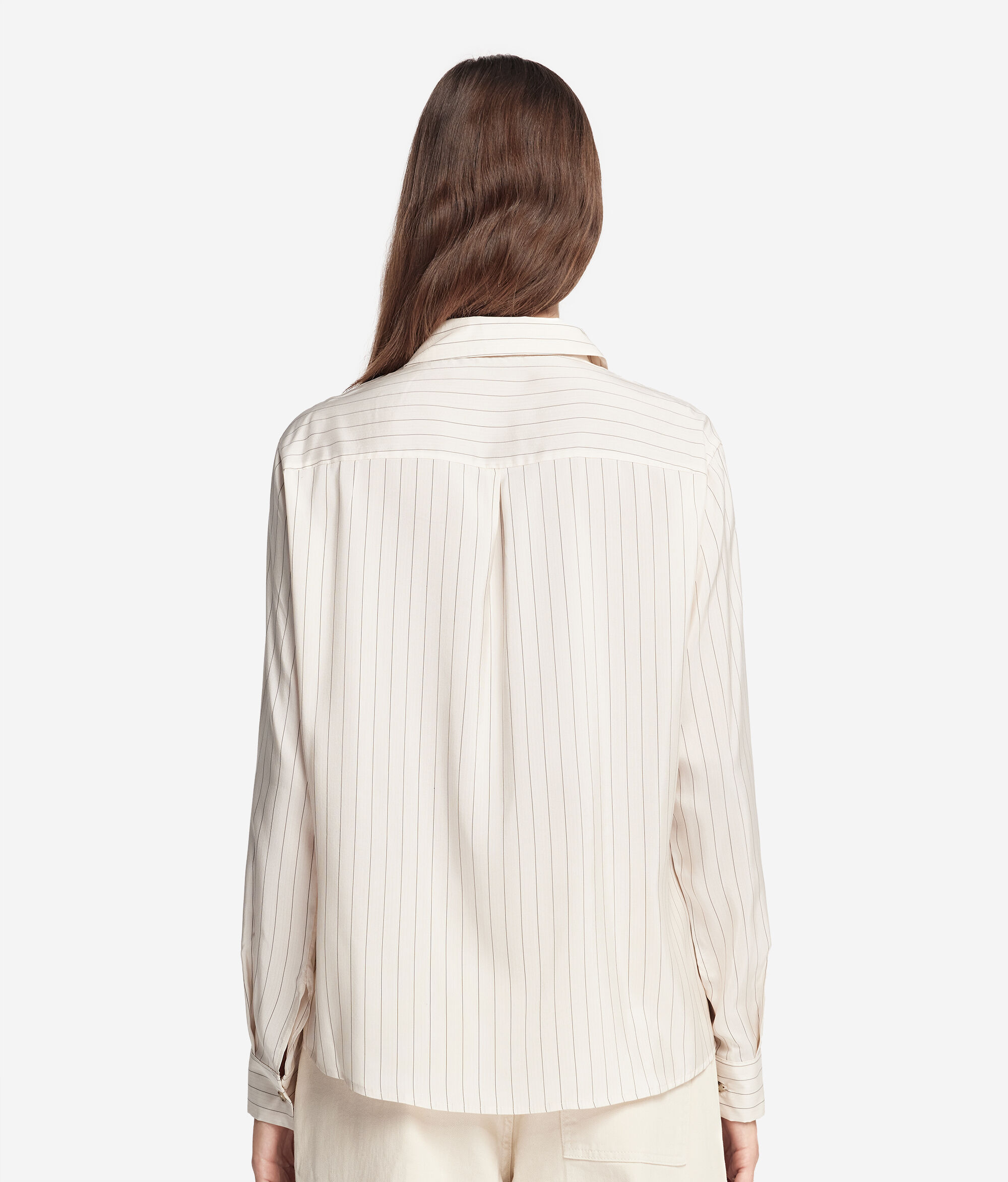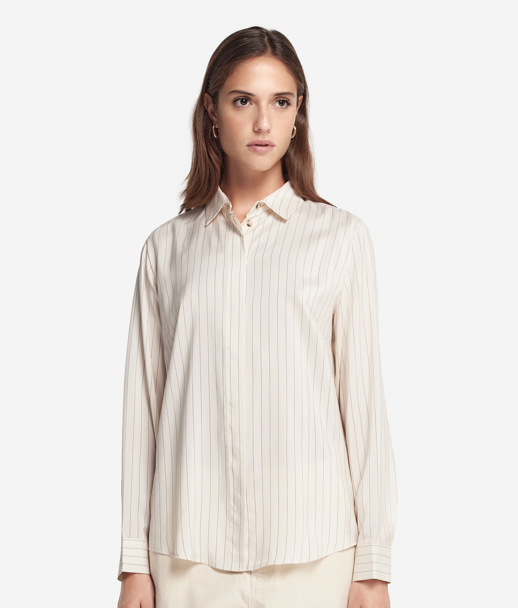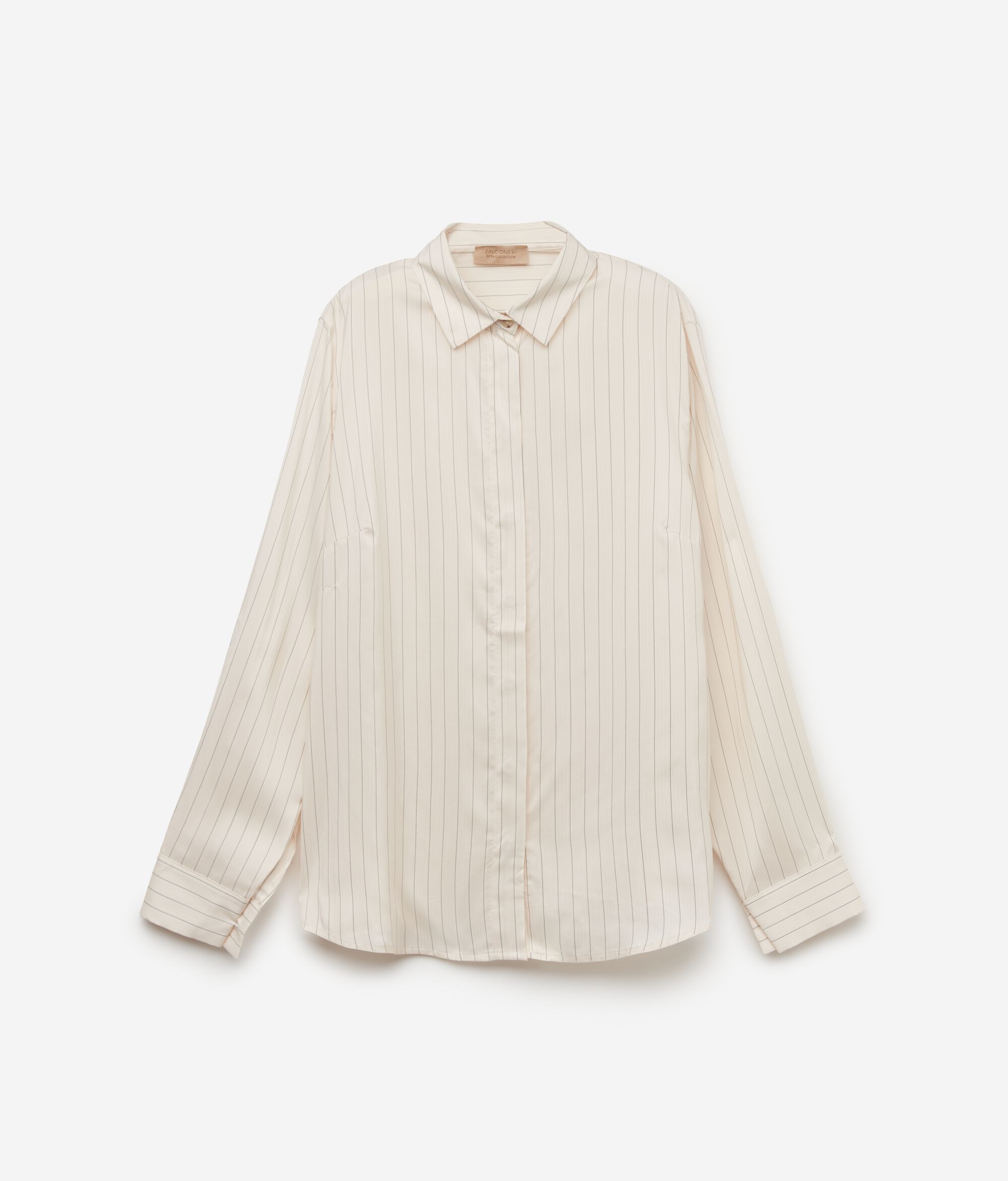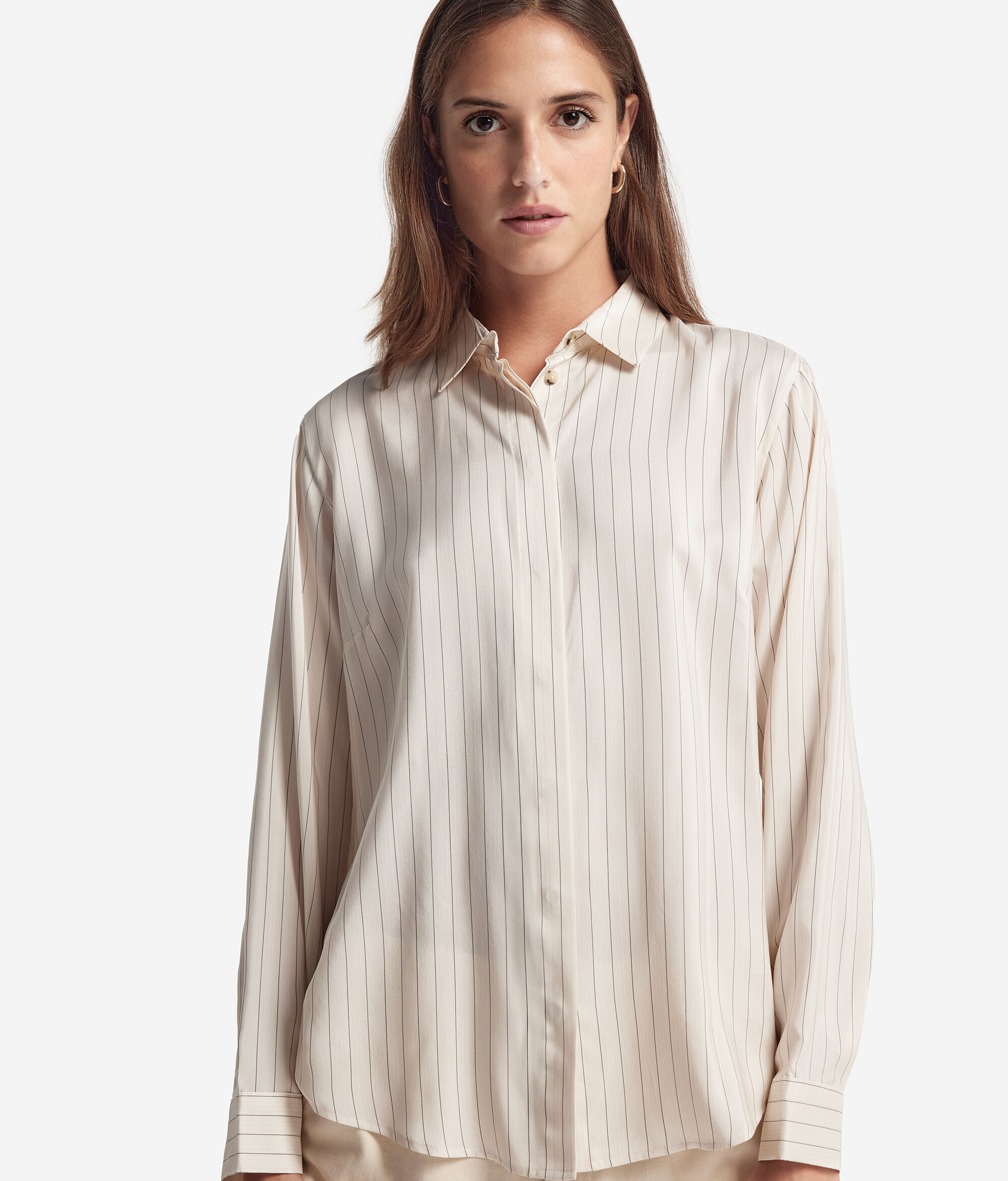Scopri l'eleganza senza tempo di questa camicia realizzata in seta rigata. Il design è caratterizato da una chiusura con bottoni a scomparsa, garantendo una linea pulita ed essenziale. Le spalle regolari assicurano una vestibilità confortevole e naturale, mentre il fondo leggermente stondato contribuisce a creare una linea armoniosa. Sobria ma distintamente raffinata non può mancare nell'armadio di chi ama qualità e stile senza compromessi.