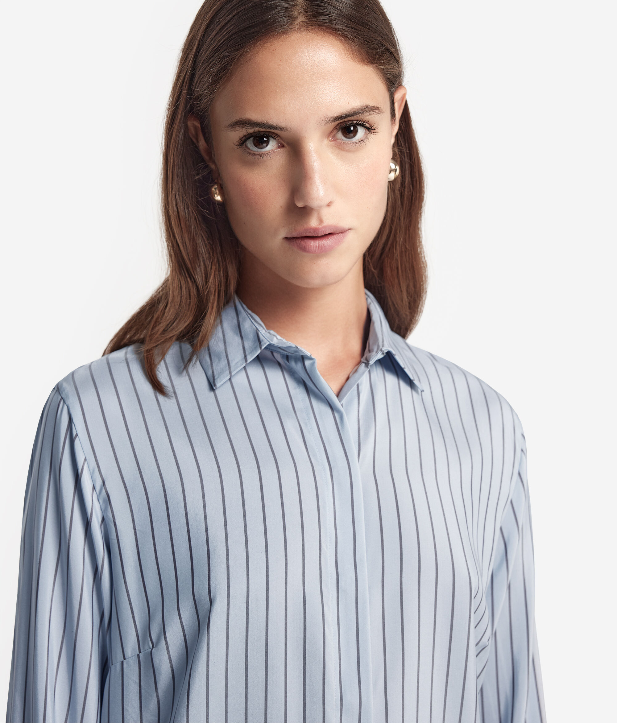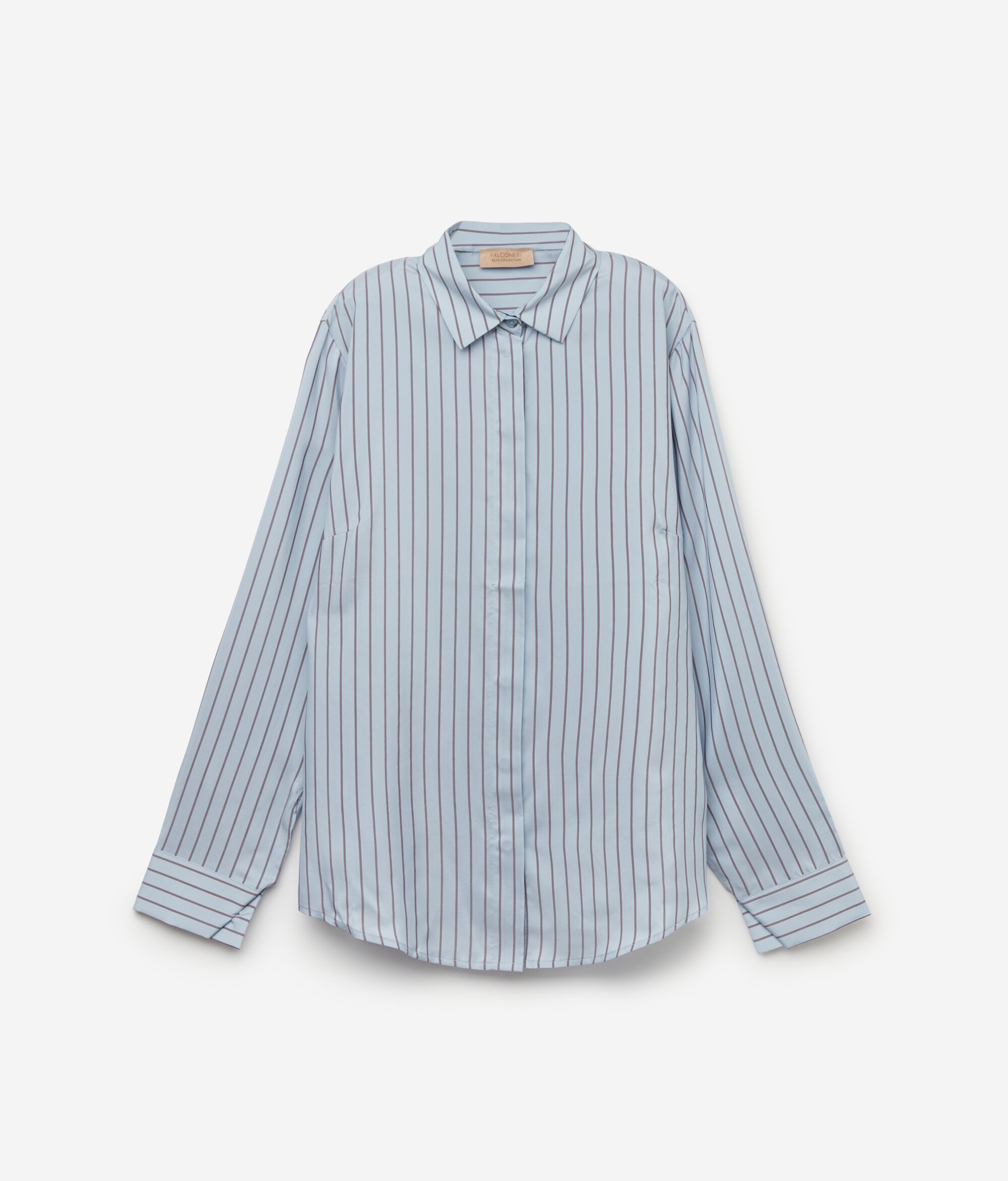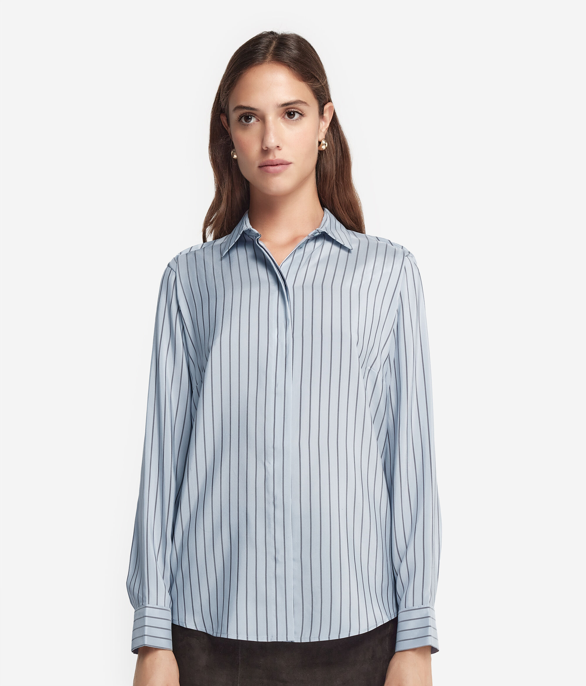 Scopri l'eleganza senza tempo di questa camicia realizzata in seta rigata. Il design è caratterizato da una chiusura con bottoni a scomparsa, garantendo una linea pulita ed essenziale. Le spalle regolari assicurano una vestibilità confortevole e naturale, mentre il fondo leggermente stondato contribuisce a creare una linea armoniosa. Sobria ma distintamente raffinata non può mancare nell'armadio di chi ama qualità e stile senza compromessi.