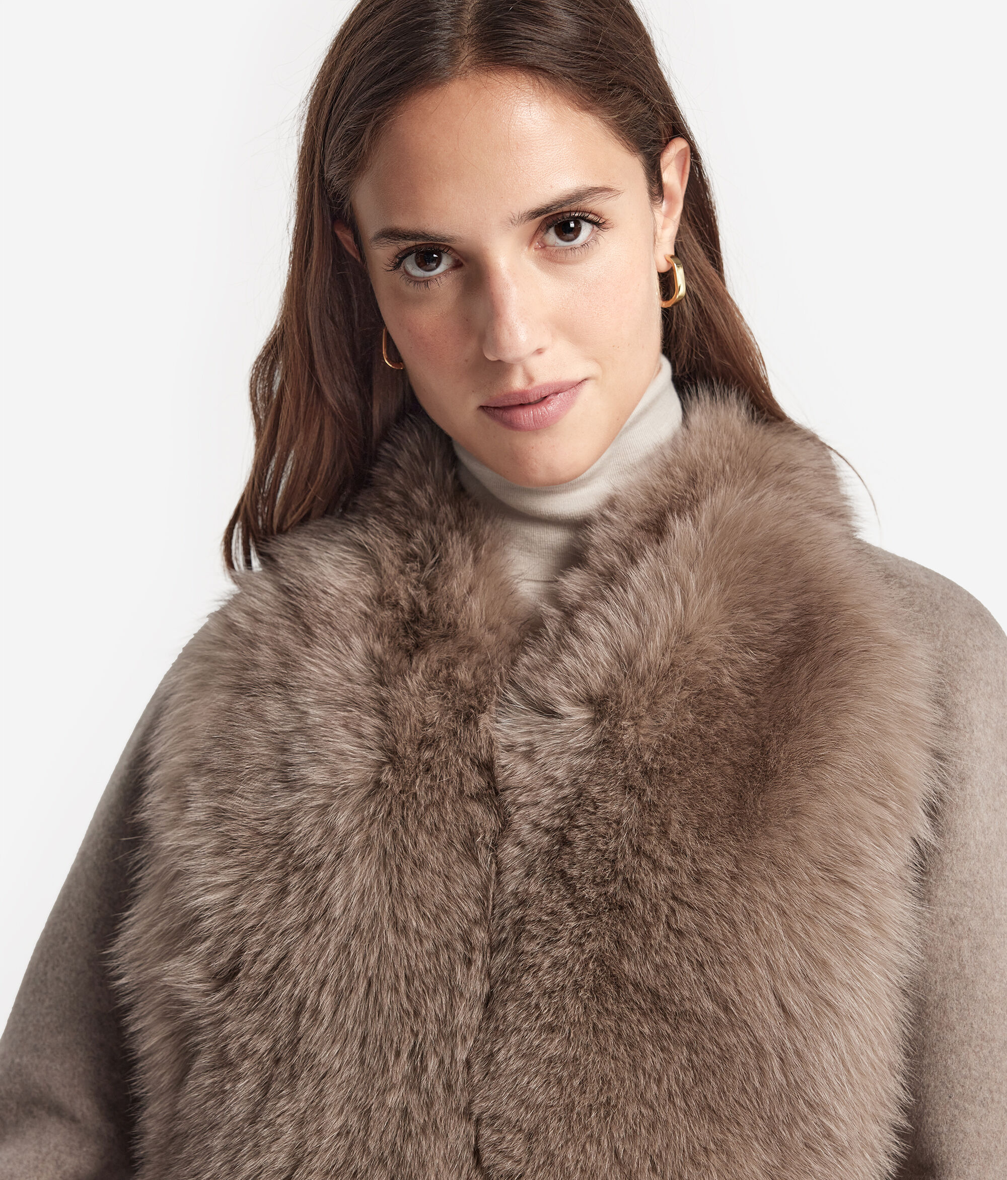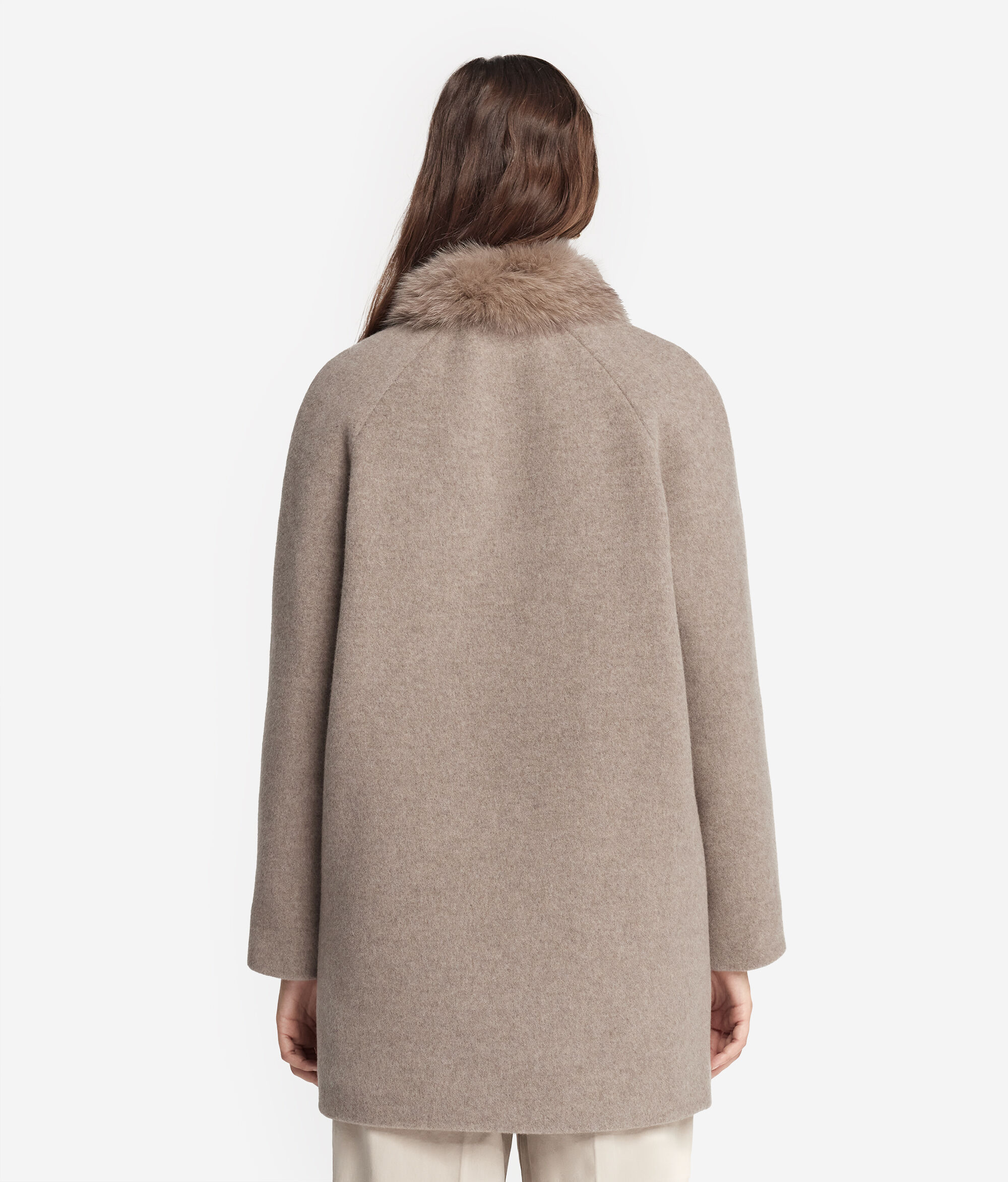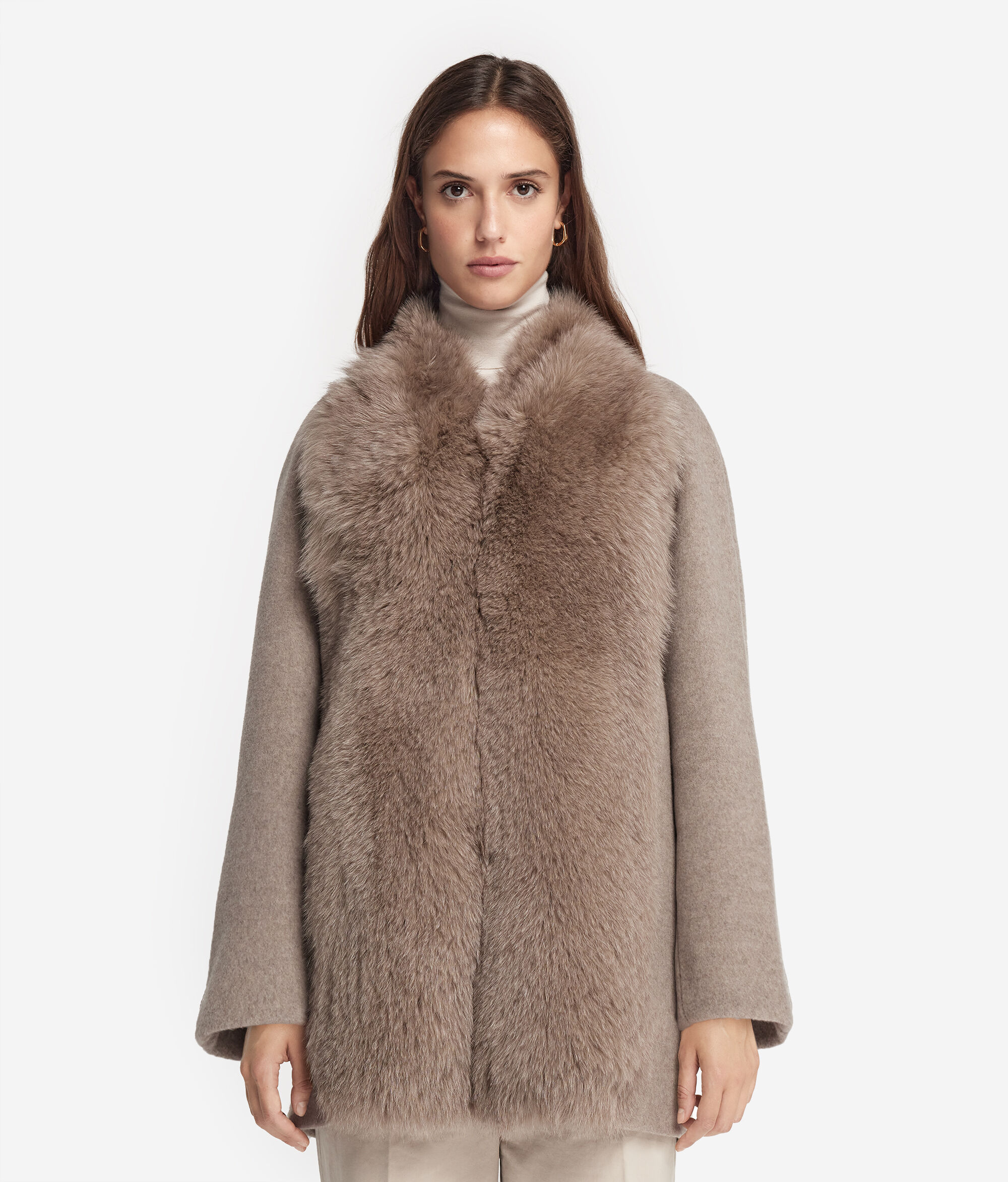 Realizzato in tessuto di cashmere, questo cappotto rappresenta un capo essenziale per il guardaroba che unisce la qualità allo stile. Il suo design è impreziosito da un davantino in pelliccia di volpe e da raffinate maniche raglan, ad aggiungere un tocco di lusso e carattere. L'interno è realizzato in tessuto tecnico trapuntato e ovatta, garantendo protezione anche nelle giornate più fresche. Le spalle scese e la vestibilità morbida conferiscono un fit rilassato e naturale che risponde ad una li