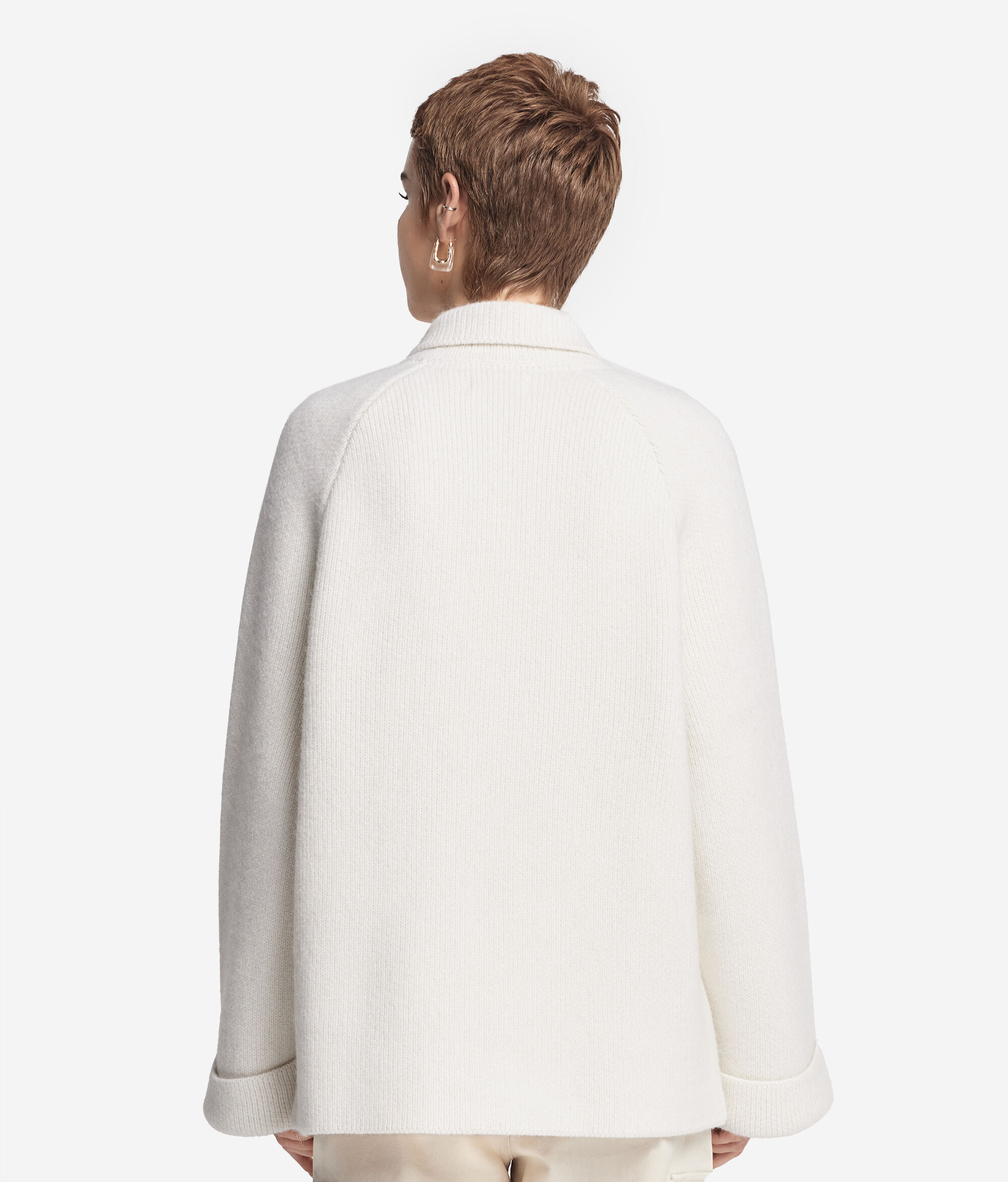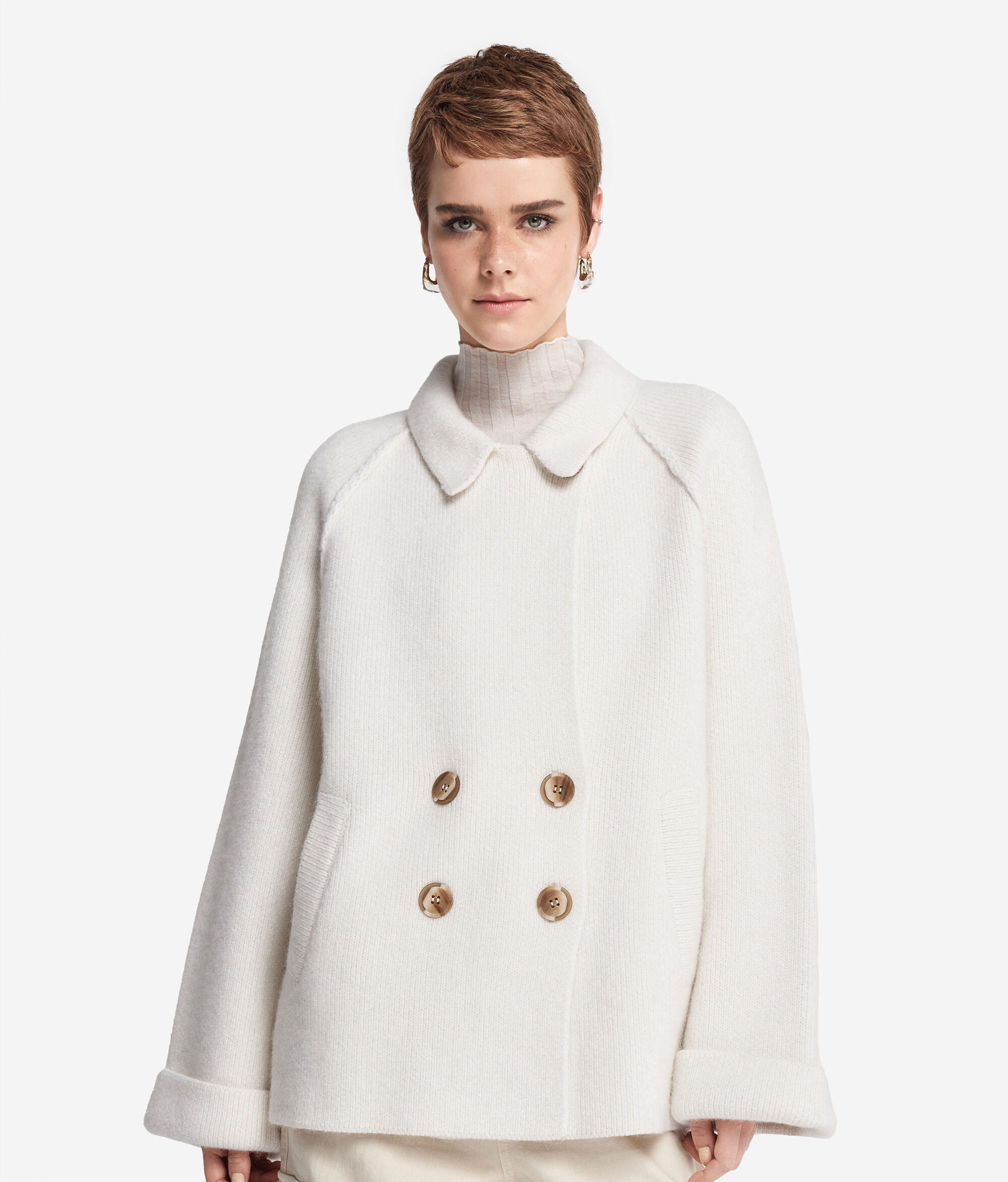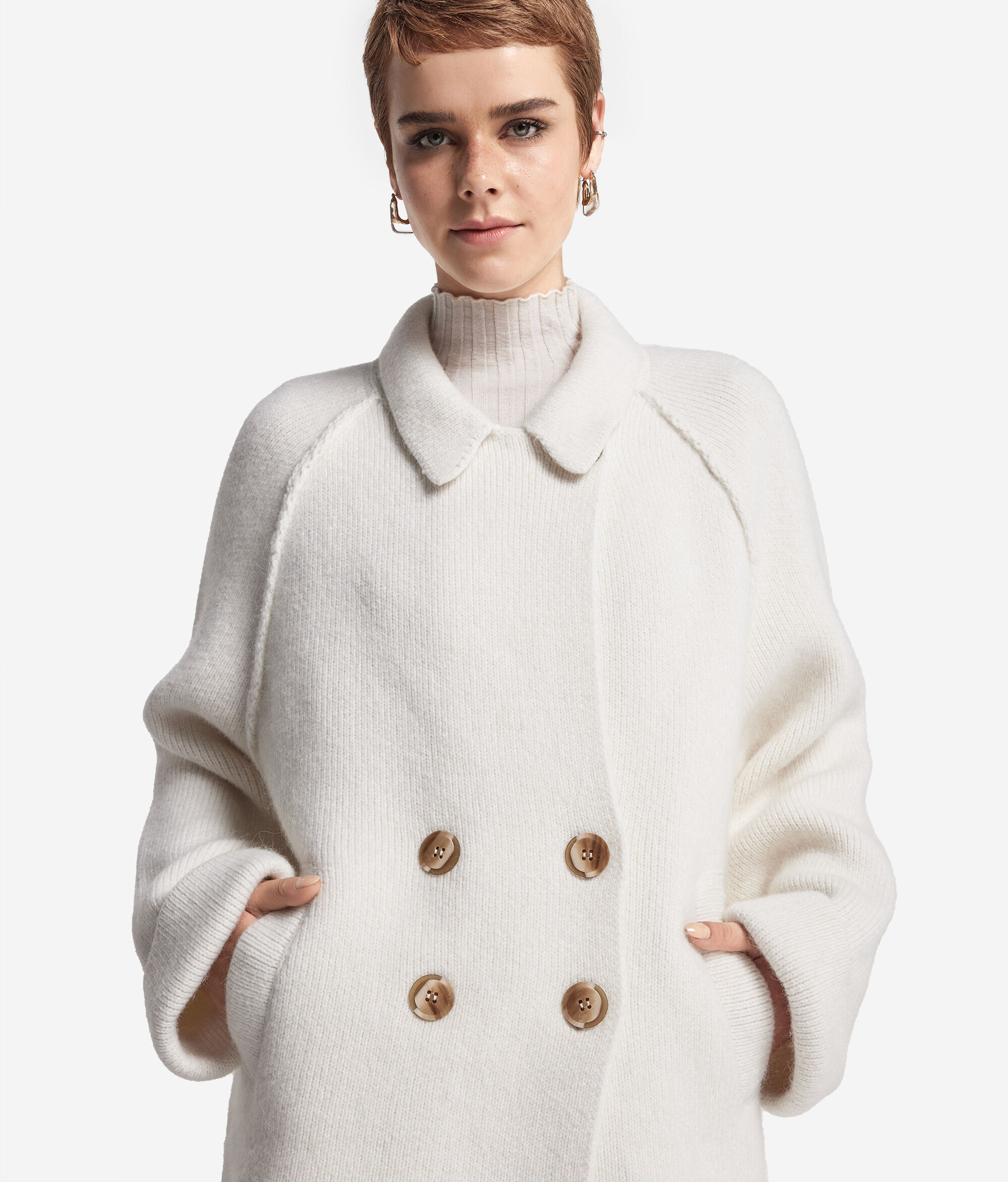 Linee contemporanee e femminile definiscono lo stile dello speciale cappotto in lana e alpaca. La lavorazione artigianale conferisce calore e morbidezza, mentre la vestibilità over è pensata per assicurare un comfort superiore. Le maniche raglan e lunghe, insieme al rever, aggiungono un tocco di eleganza classica. La chiusura doppiopetto con quattro bottoni e le tasche in costina rivisitano in chiave moderna la silhouette tradizionale. Un capo pensato per chi cerca raffinatezza e comodità in un design sofisticato.