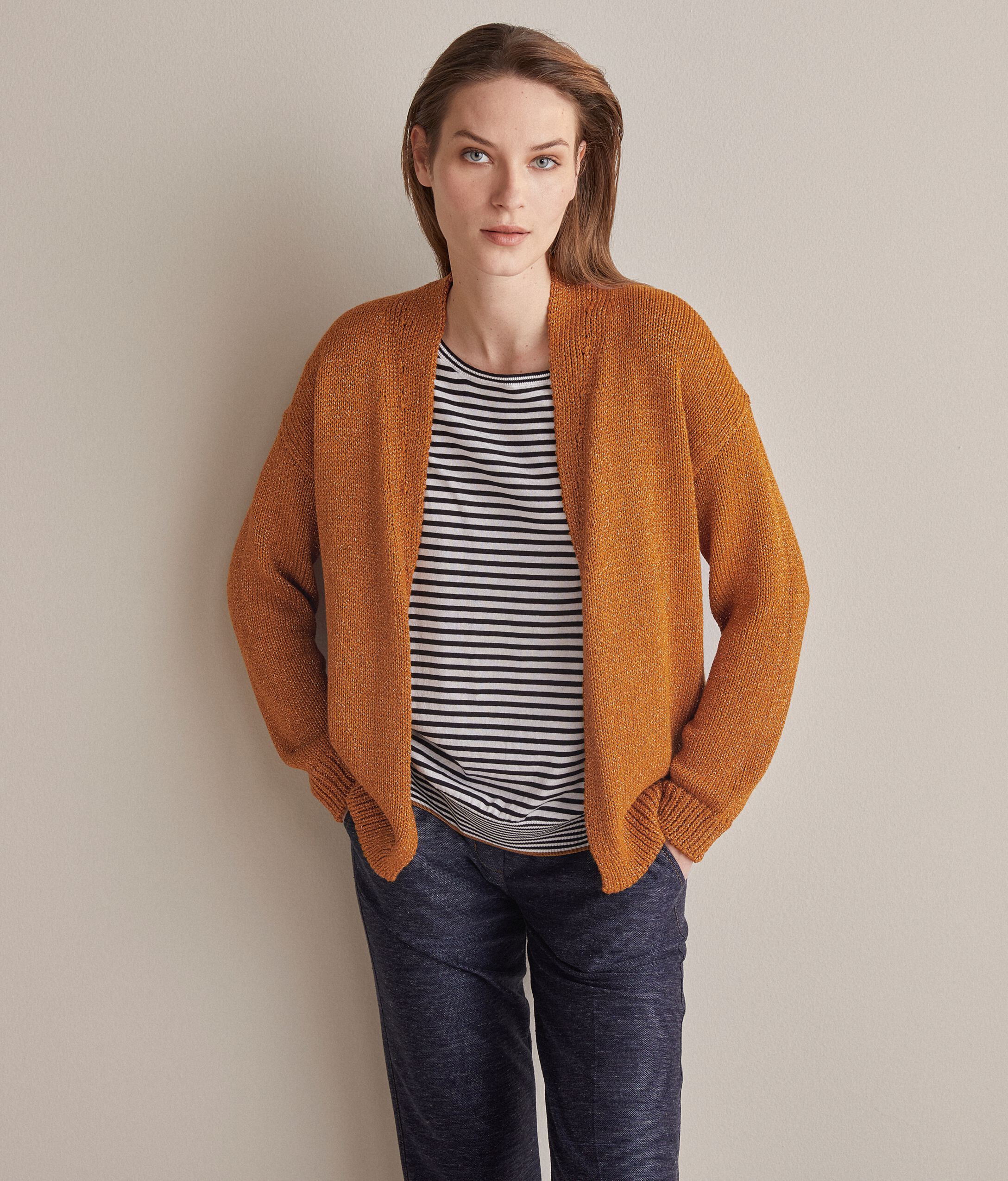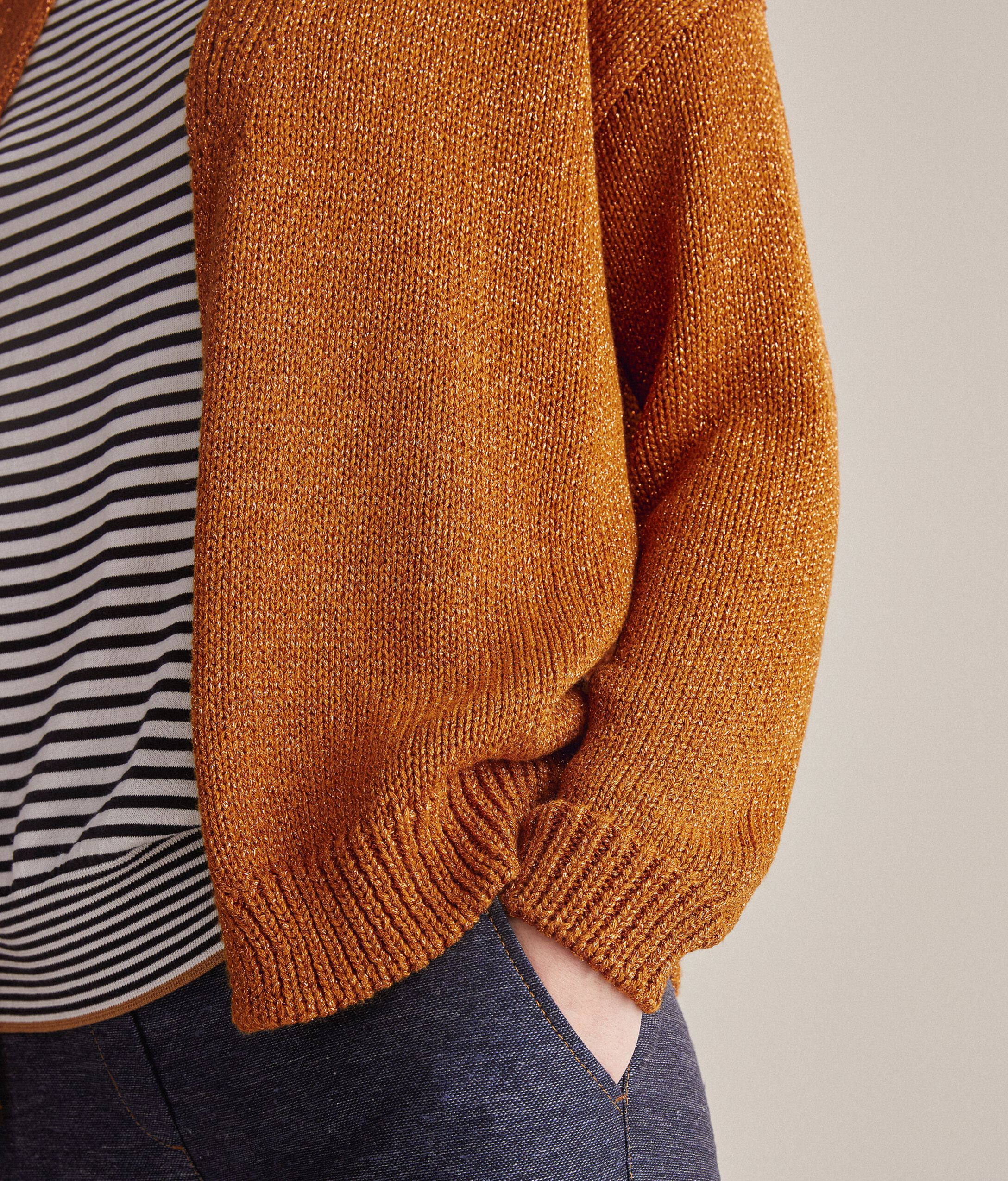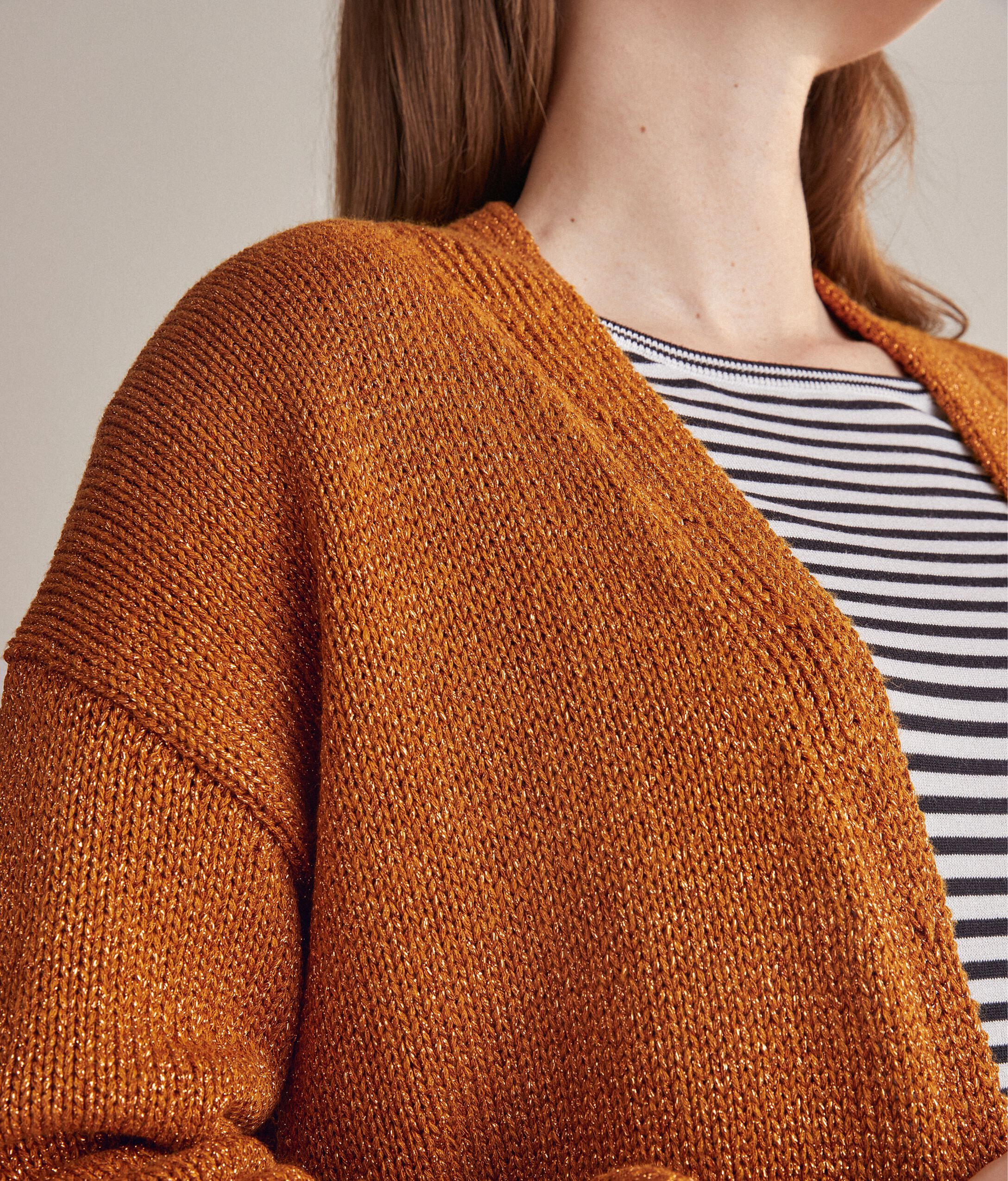Luce e stile per questo esclusivo cardigan corto a scialle, interamente realizzato in filato lamé che illumina di brillanti riflessi un look più innovativo. La vestibilità risulta rilassata e confortevole, le spalle sono abbassate e le maniche rifinite con bordino a coste sottili. La modella è alta 179 cm e veste una taglia MPetto: 88cm / Vita: 67cm / Fianchi: 94cm