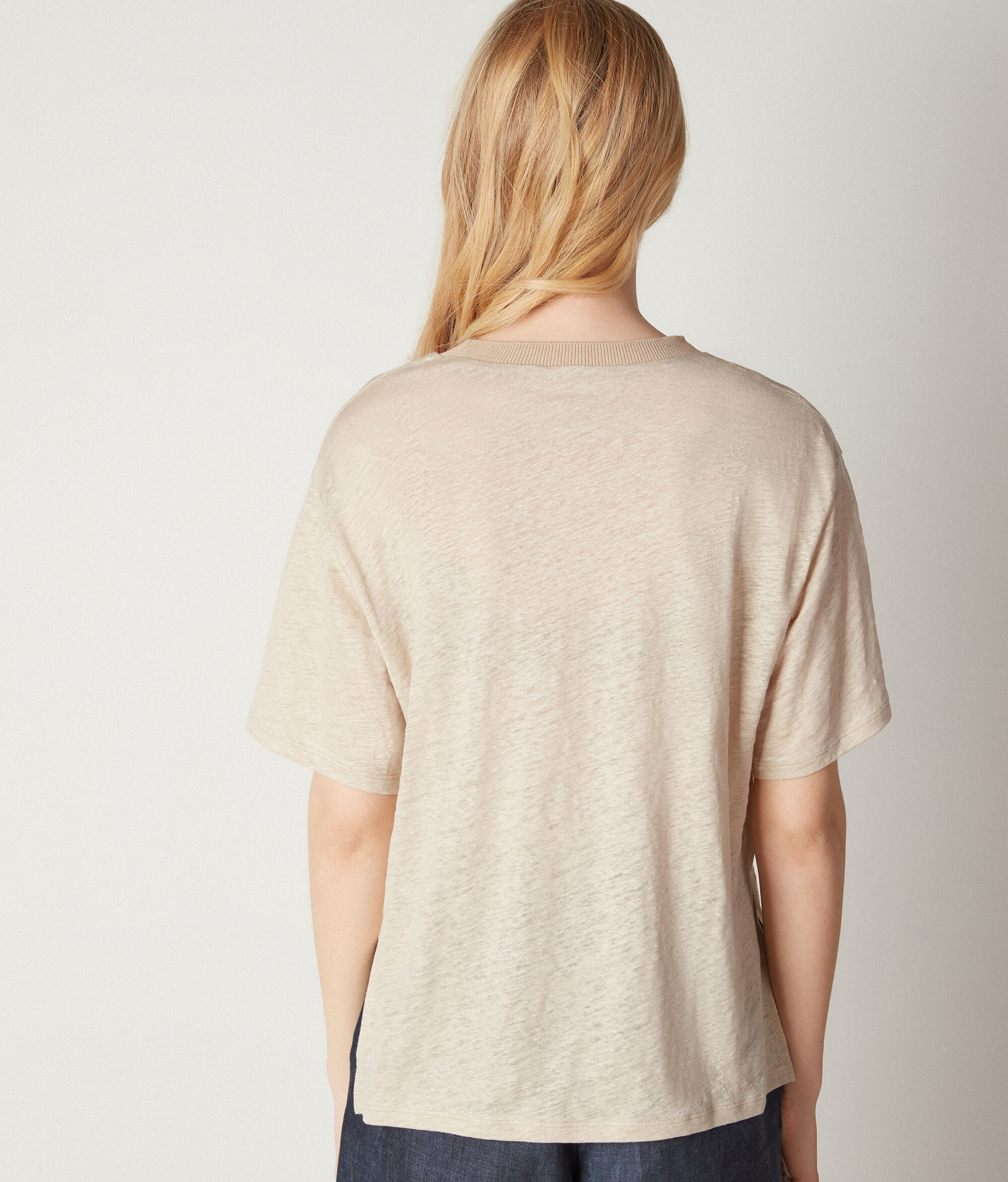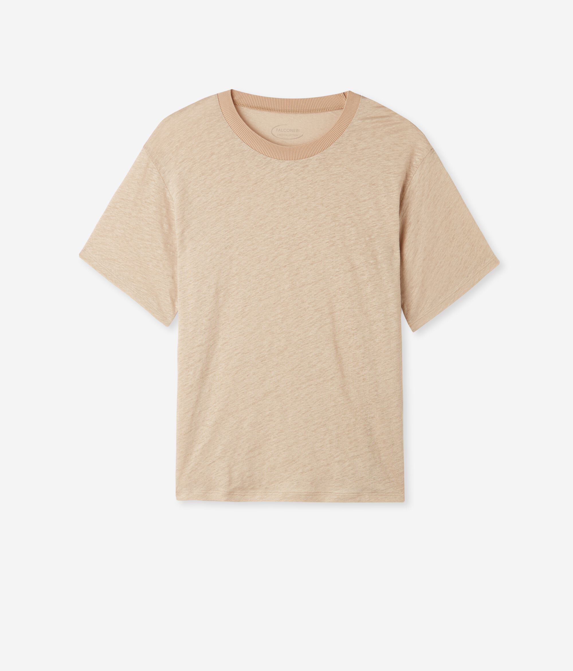 Capo essenziale e versatile per la stagione primaverile e le calde sere d'estate, la t-shirt in jersey di lino con girocollo si arricchisce dei dettagli di stile che connotano il brand Falconeri. Il bordo in maglia con lavorazione a costine che rifinisce lo scollo completa il capo con un dettaglio spiccatamente femminile.
