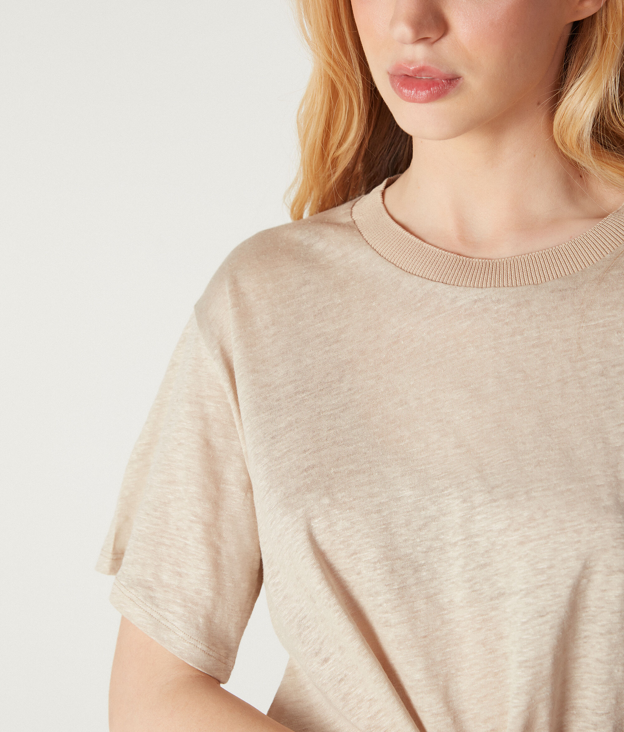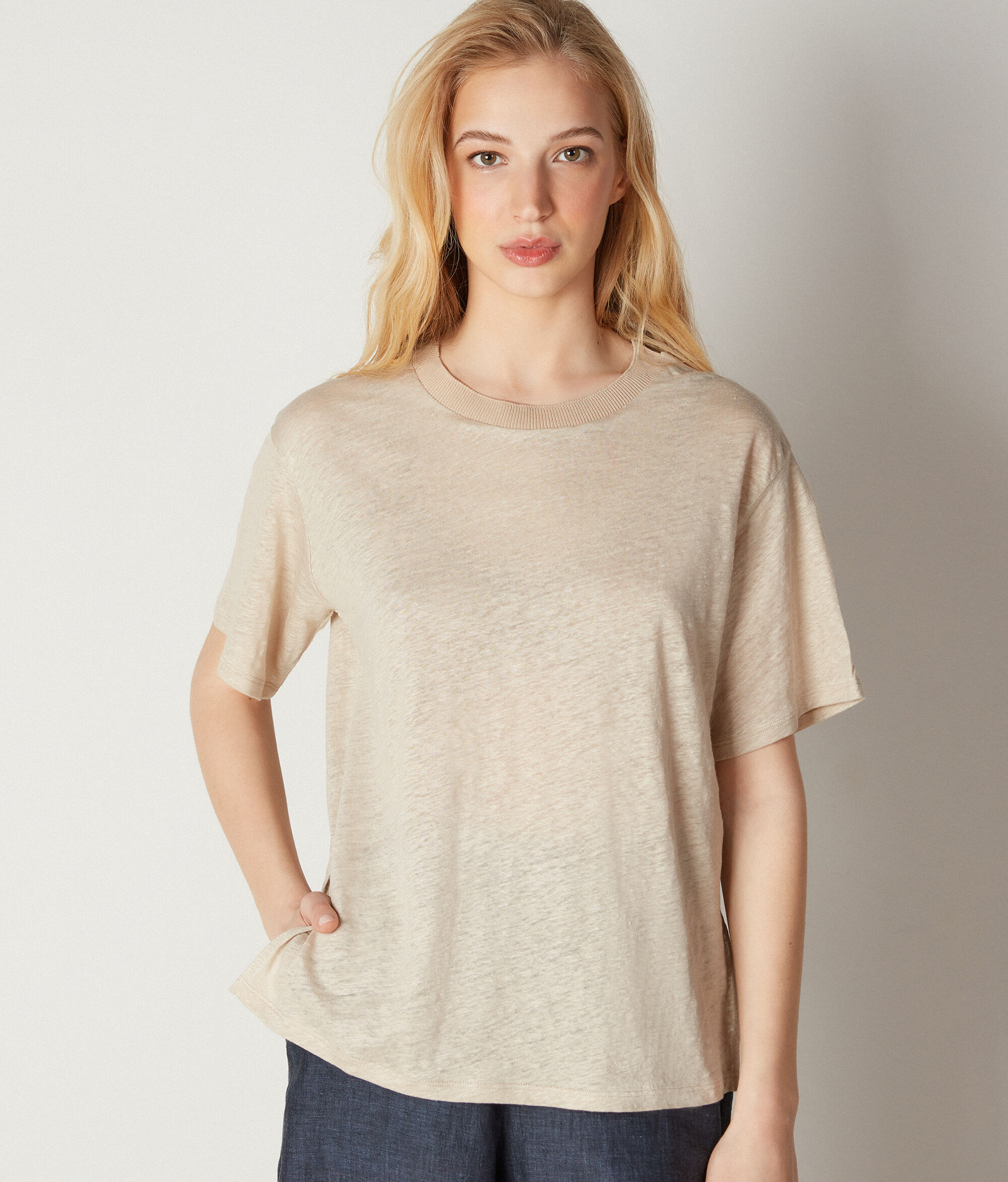 T-shirt Girocollo in Lino con Bordo in Maglia