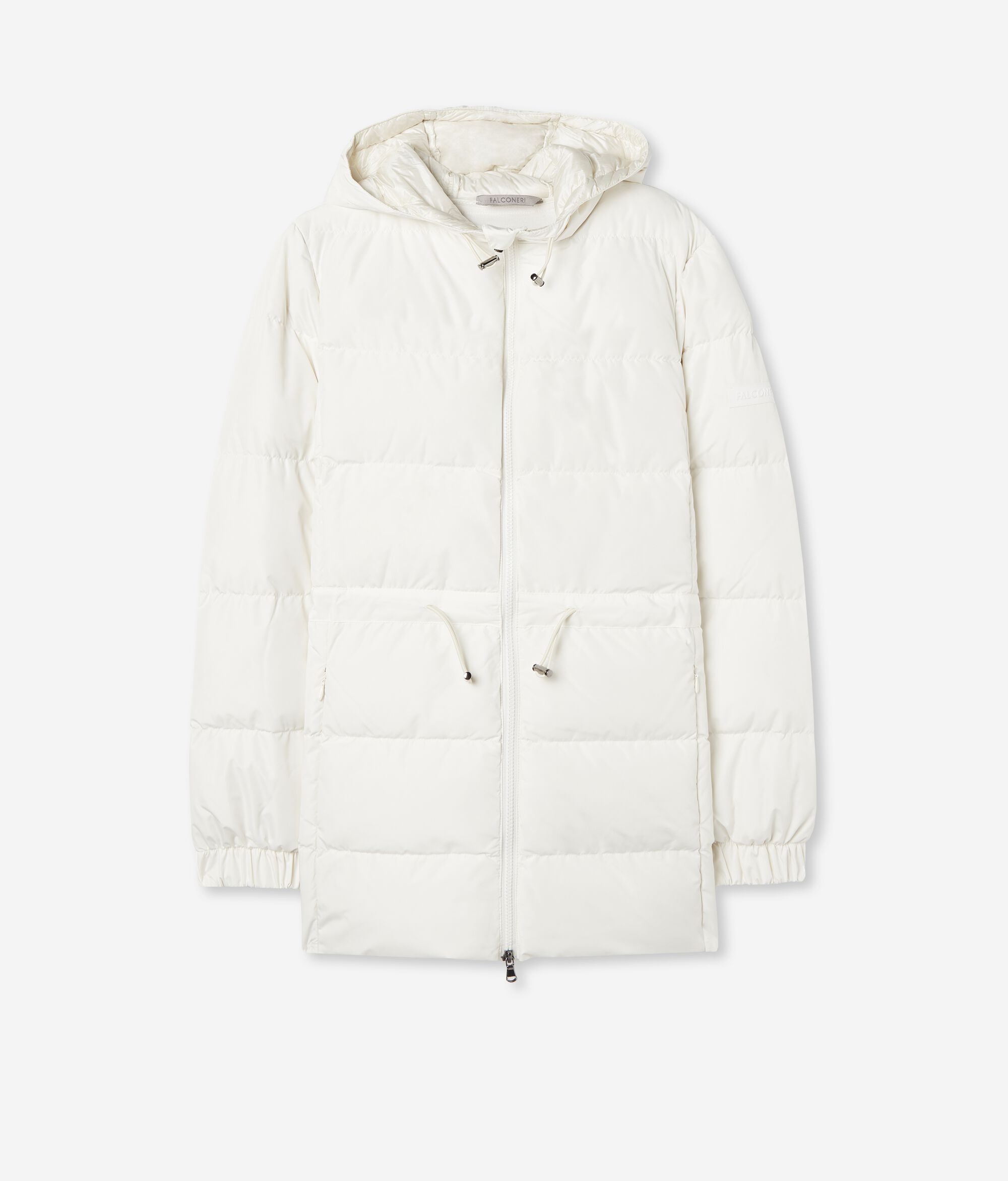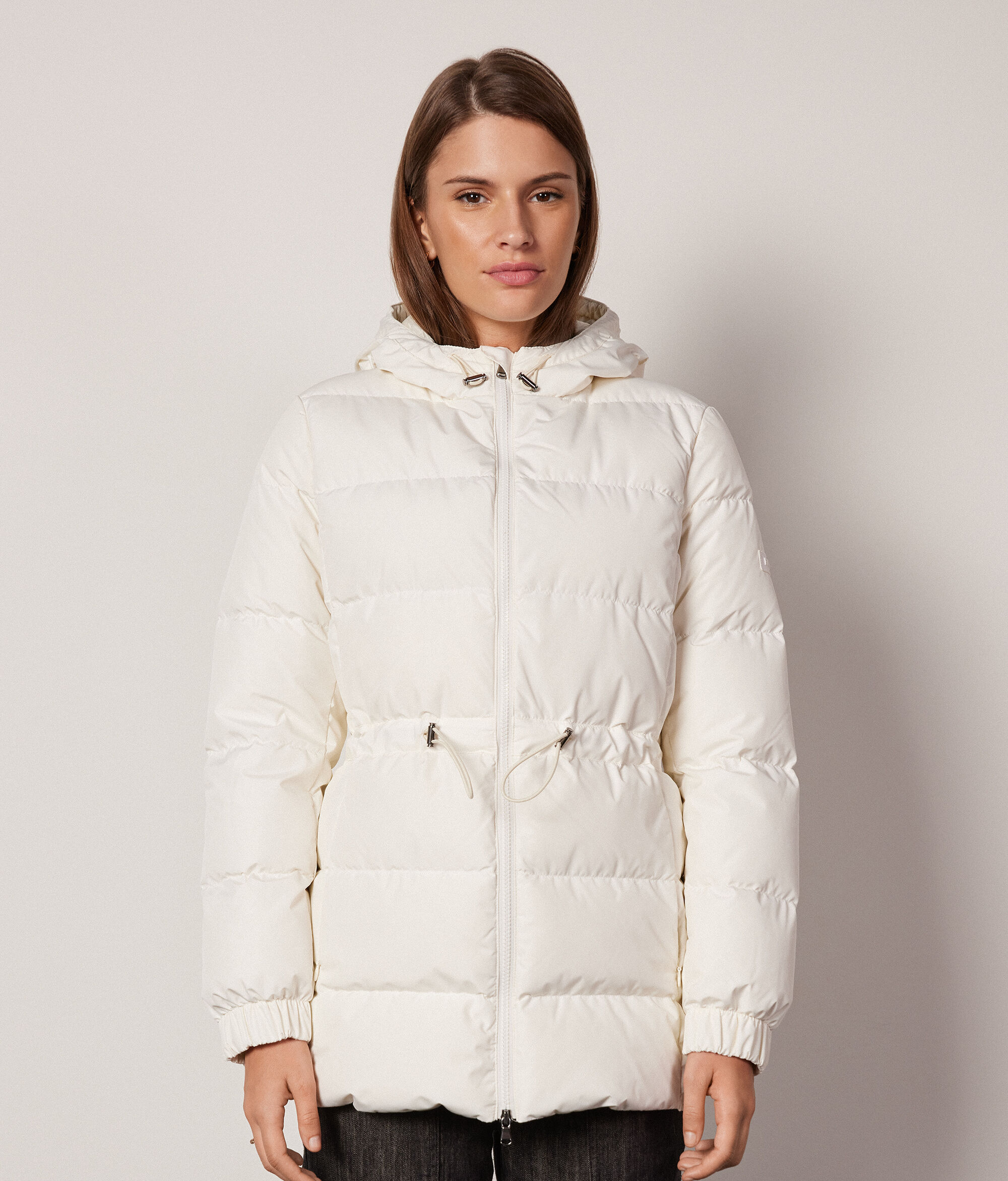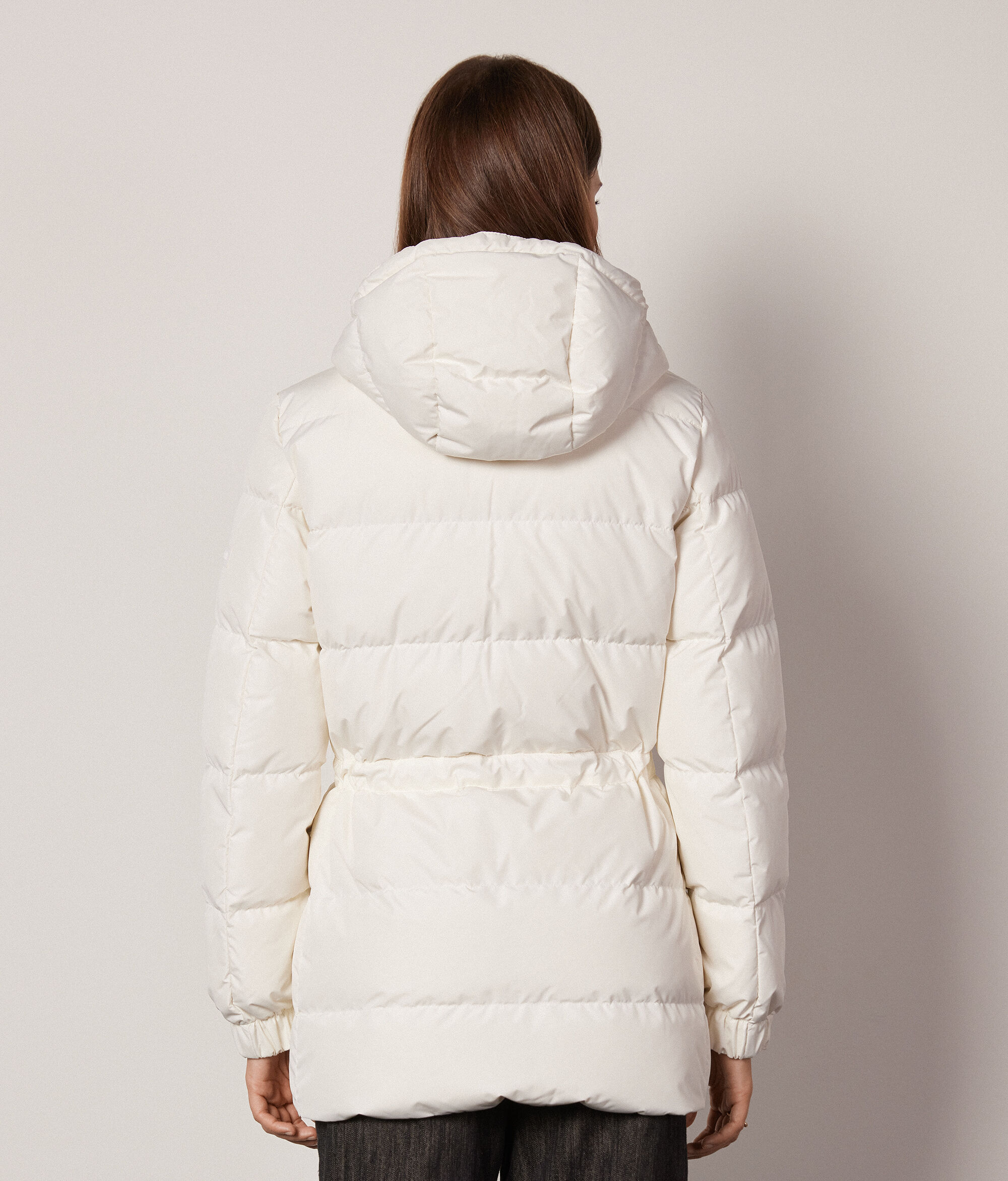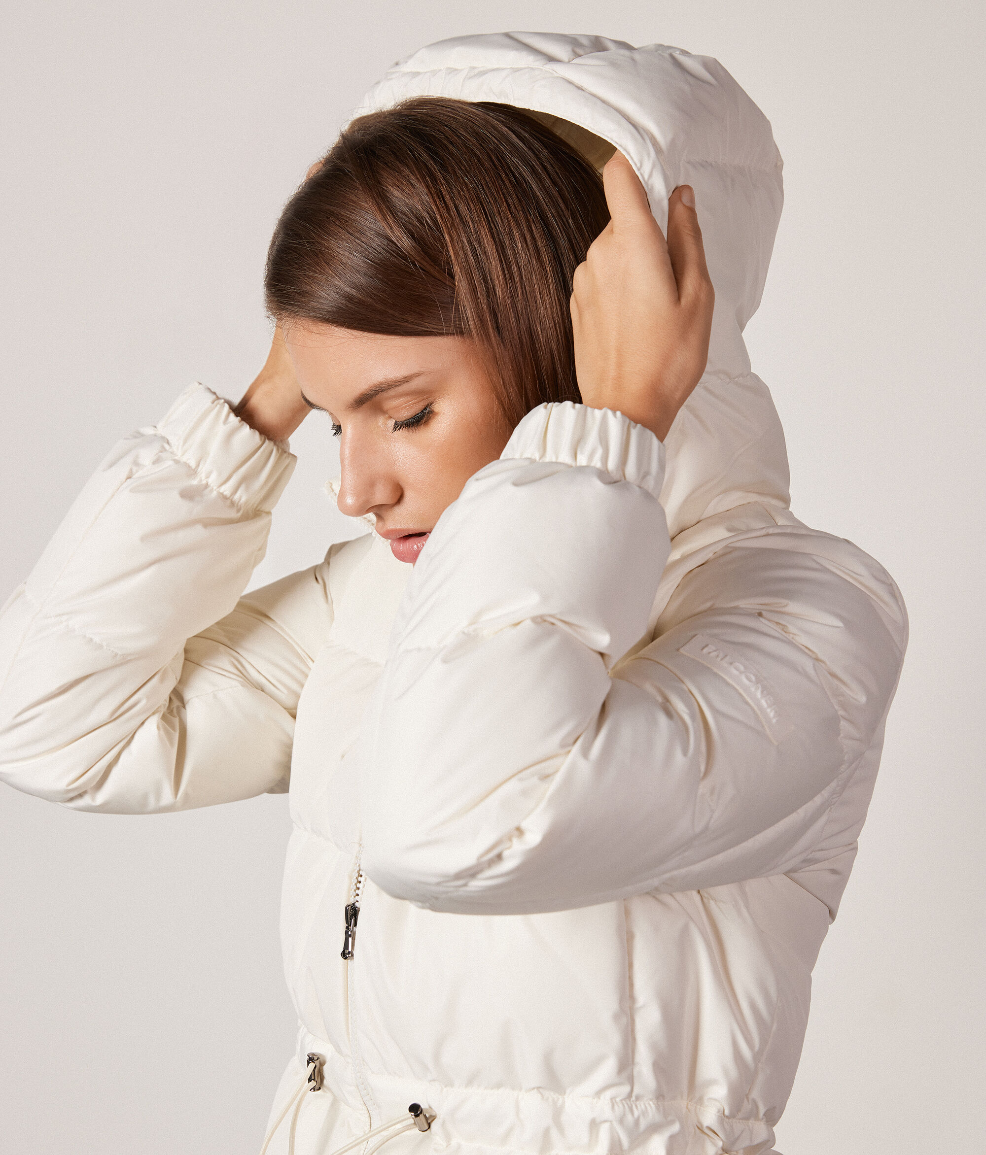 Gusto sportivo, versatilità e dettagli essenziali si combinano nel nuovo piumio con cappuccio con coulisse. Il capo è valorizzato esternamente da un tessuto tecnico che garantisce una tenuta waterproof repellente all'acqua e windproof. È reso più caldo e prezioso all'interno da un confortevolissimo cashmere ultrafine, perfetto per affrontare con stile i giorni di pioggia.