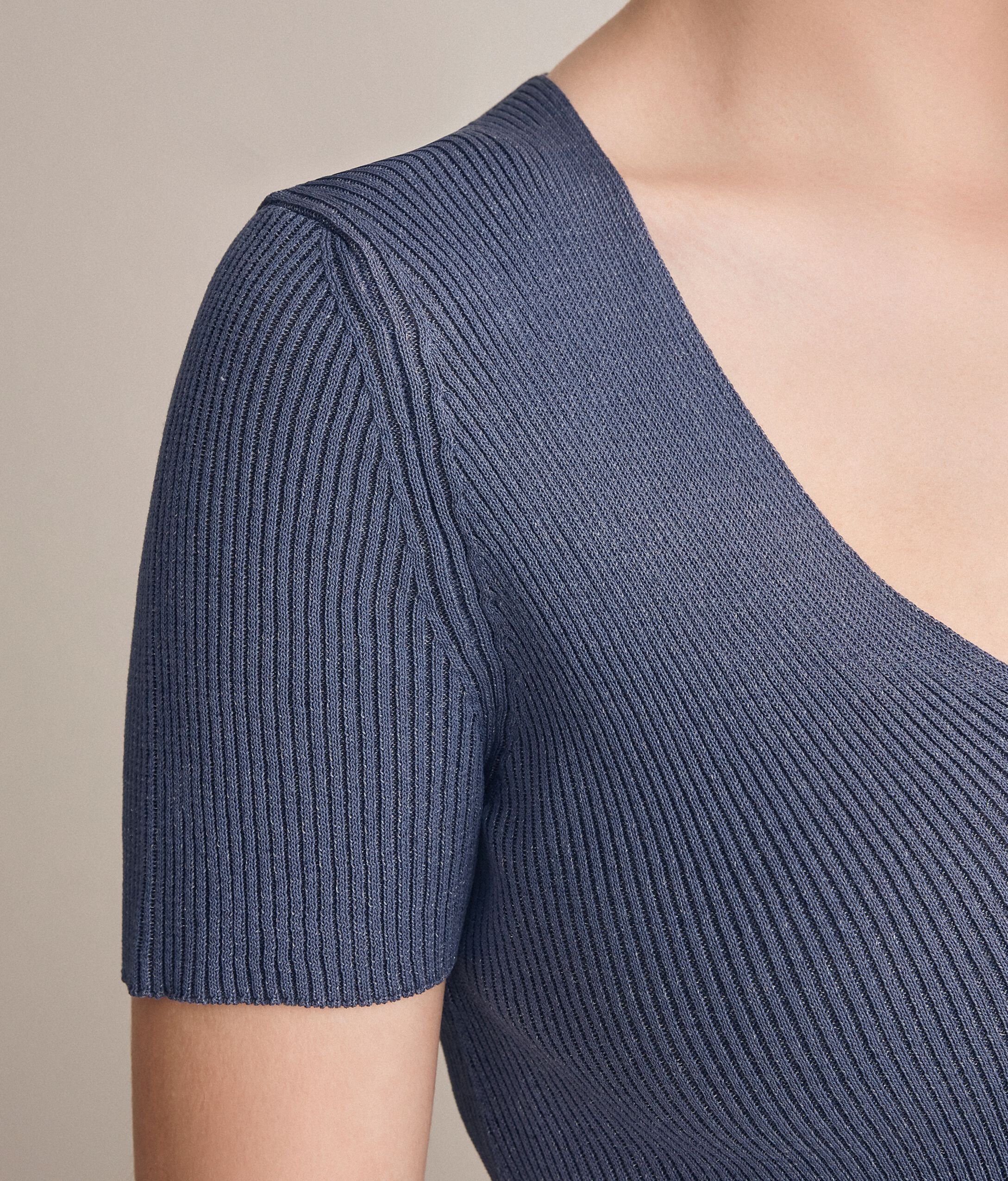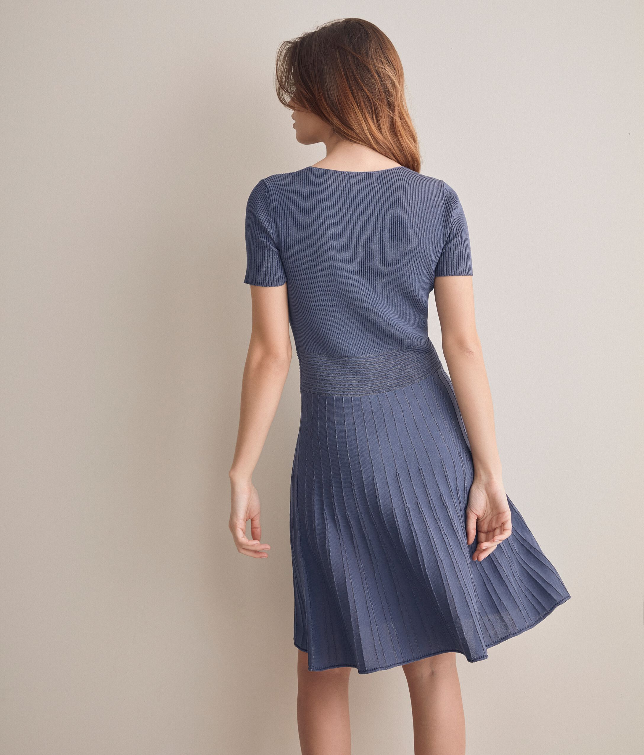 Linee geometriche e gusto bon ton ispirano forme e volumi di questo abito con scollo a V in cotone e viscosa. La texture offre una lavorazione a costina che segue più aderente la silhouette sul busto e si sviluppa in un gioco di nervature che crea un movimento a ruota nella gonna. Riflessi di luce si sprigionano dal prezioso filato lucido che percorre e valorizza la texture morbida e lucente. La vestibilità è regolare e la lunghezza al ginocchio. La modella è alta 179 cm e veste una taglia MPetto: 88cm / Vita: 67cm / Fianchi: 94cm