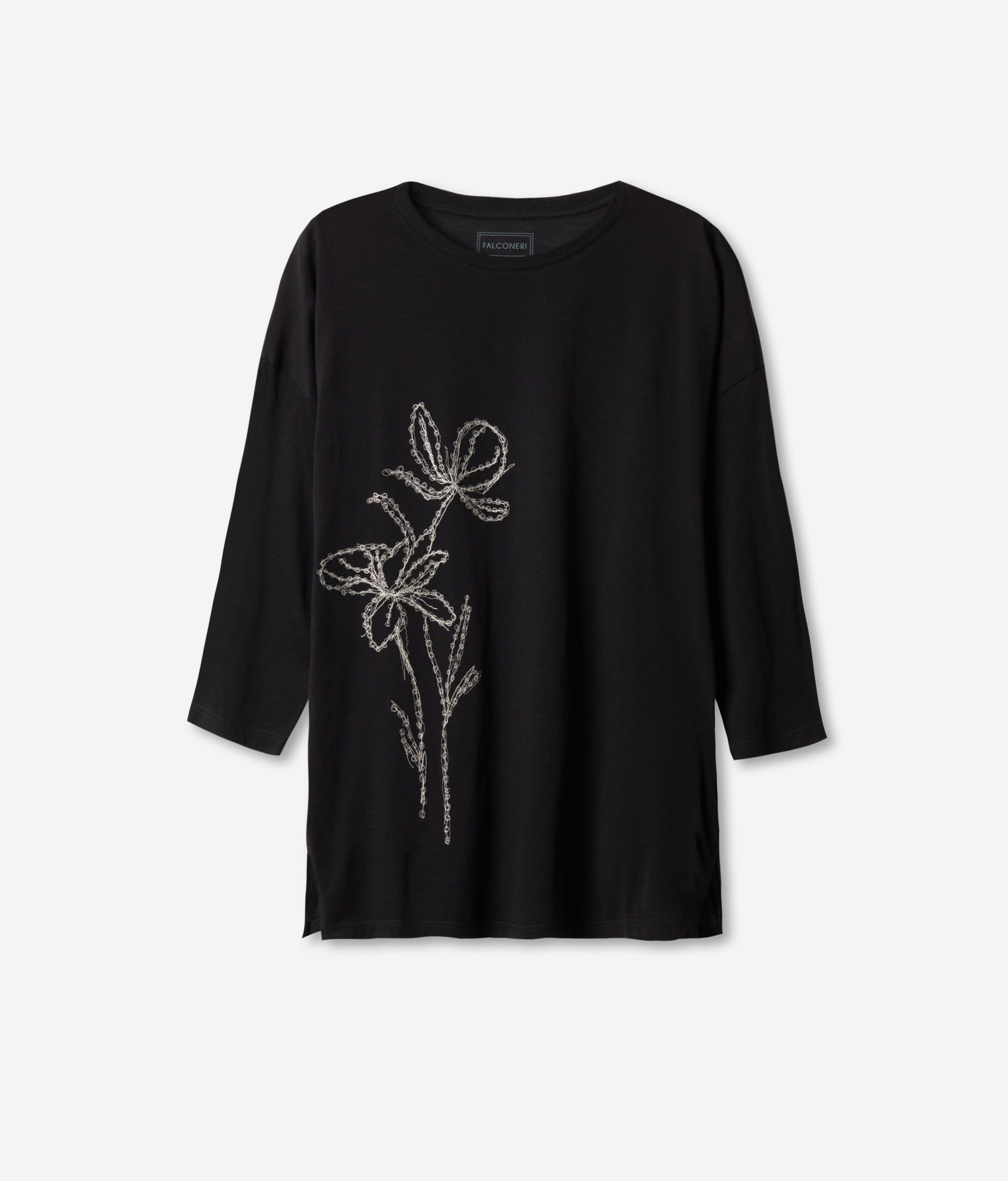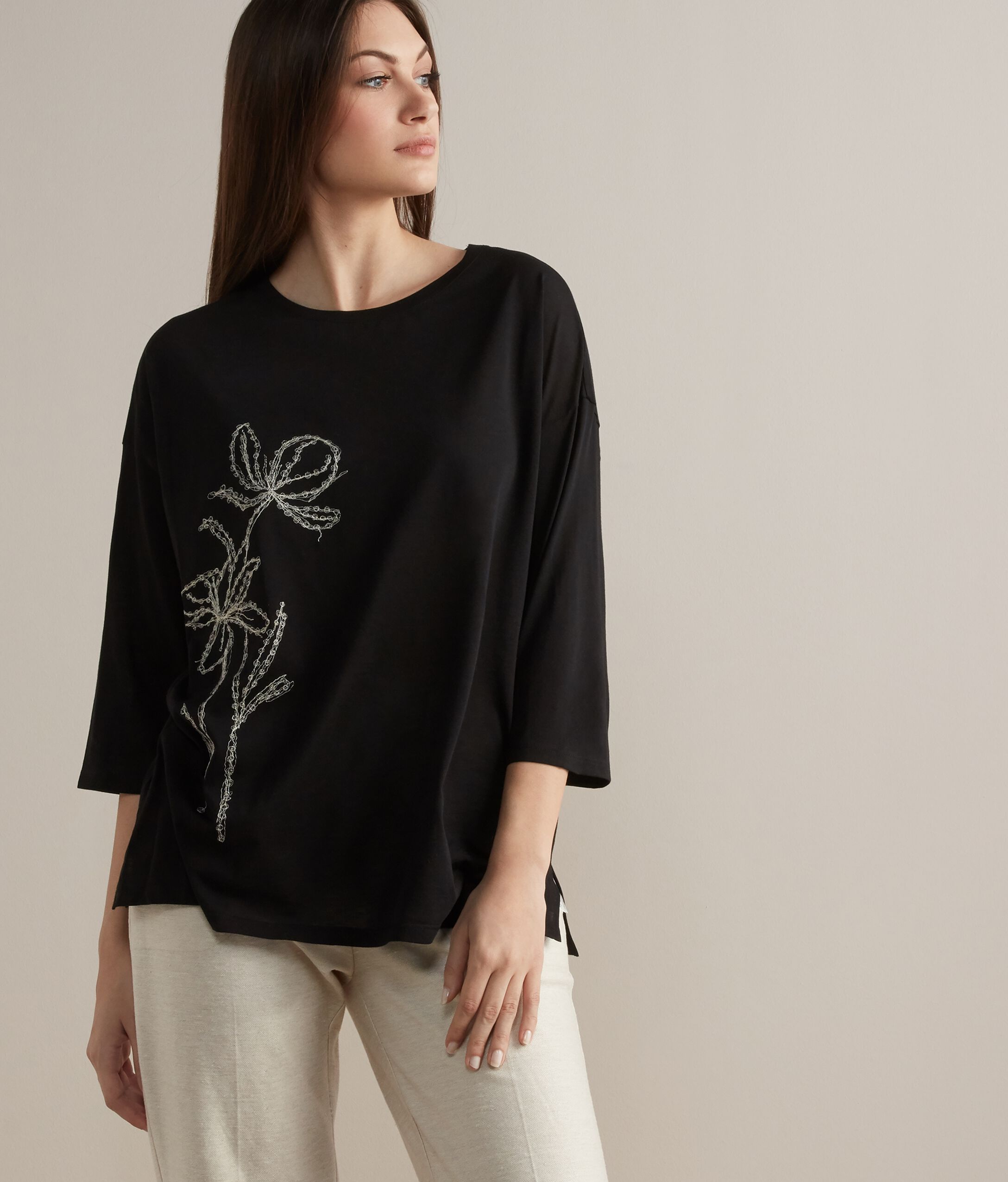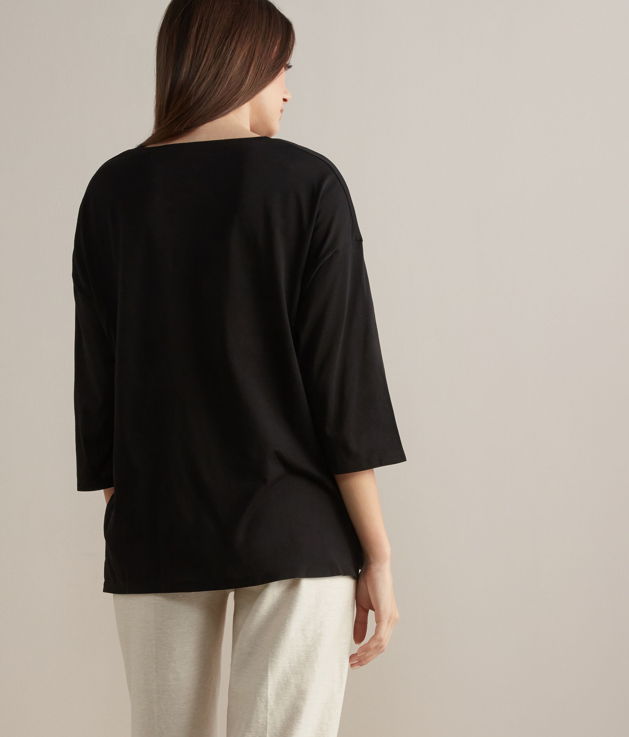 Un ricamo esclusivo arricchisce lo stile informale della t-shirt over in seta fresh. Una piacevole texture fresca e traspirante, ma allo stesso tempo morbida e lucente eleva lo stile versatile ed essenziale di un capo dedicato al tempo libero.