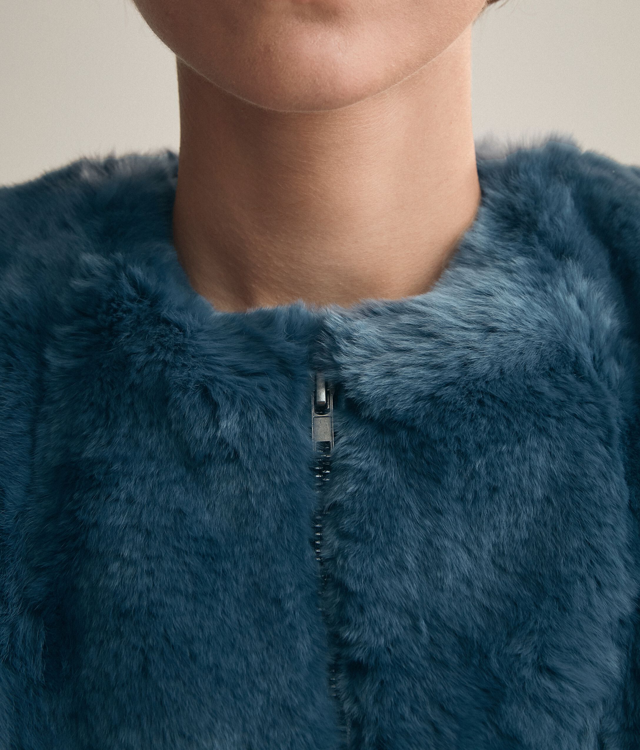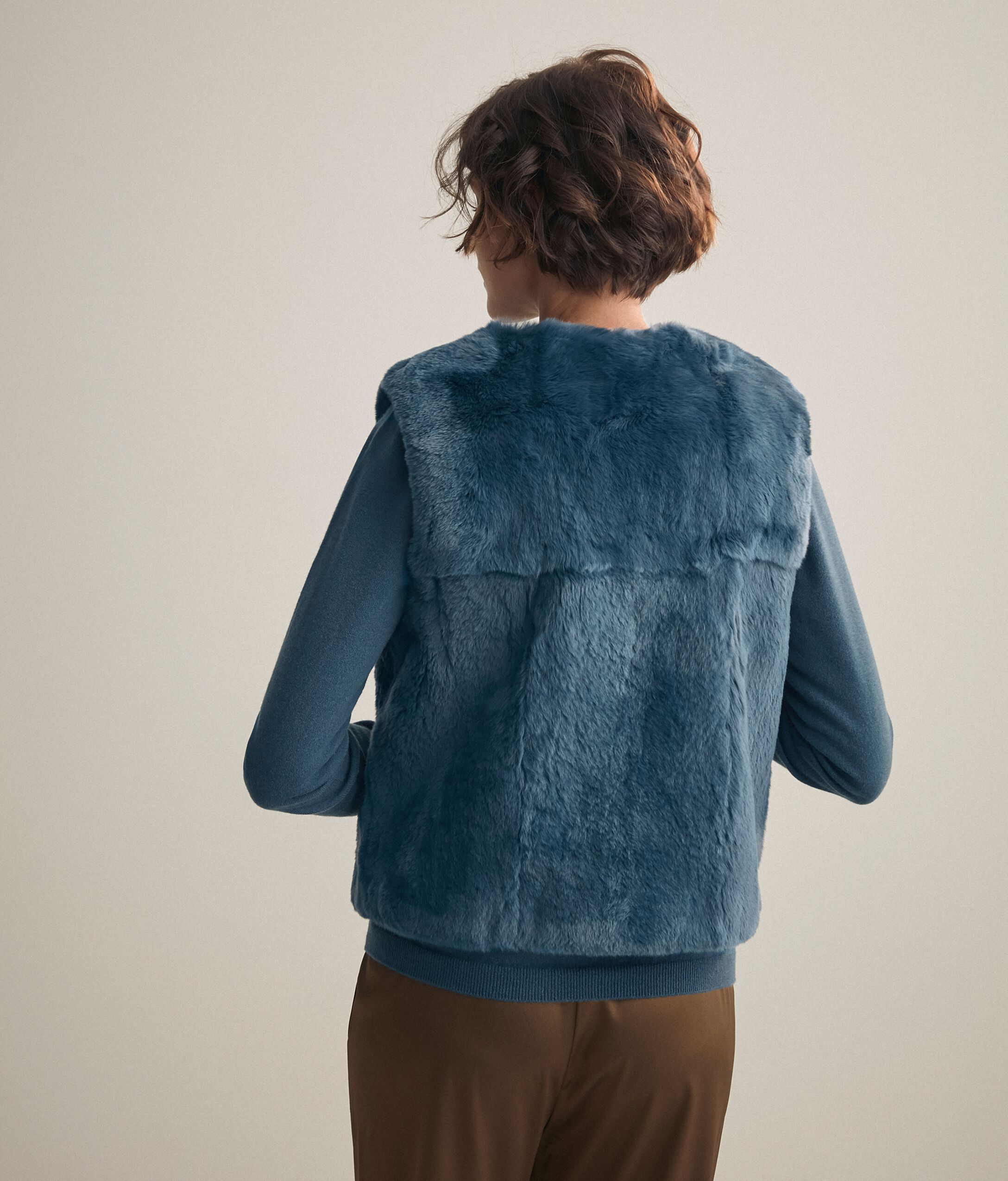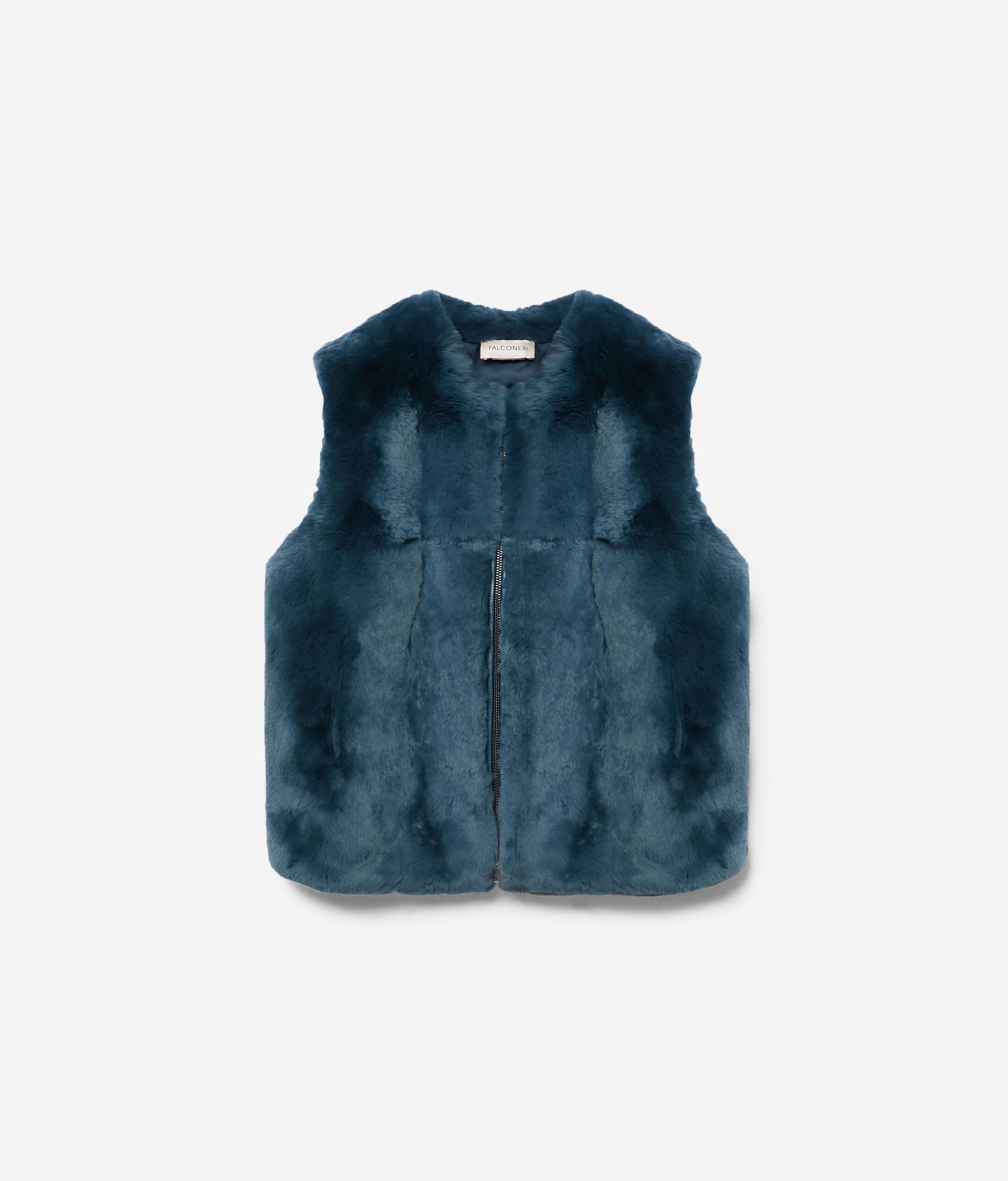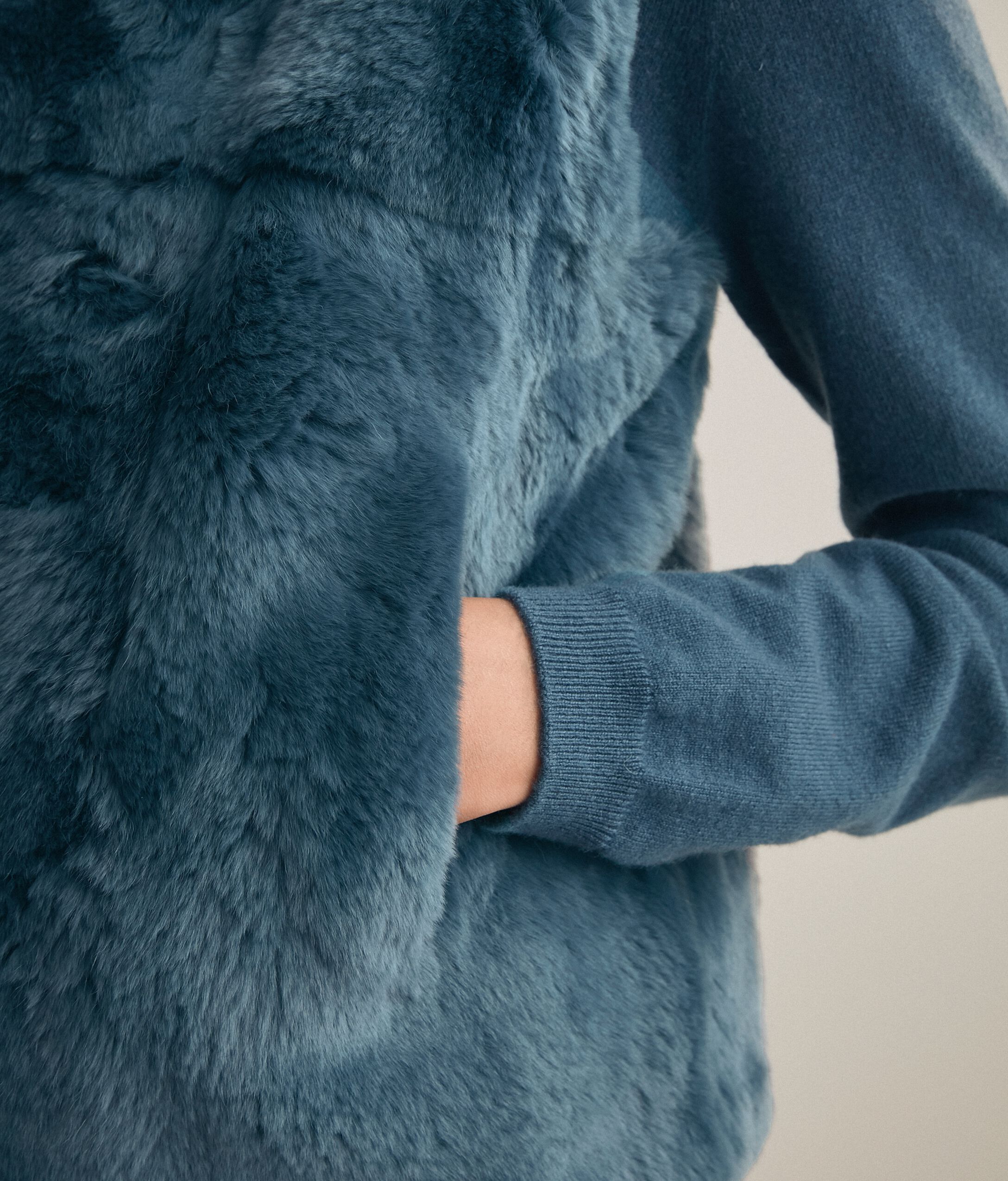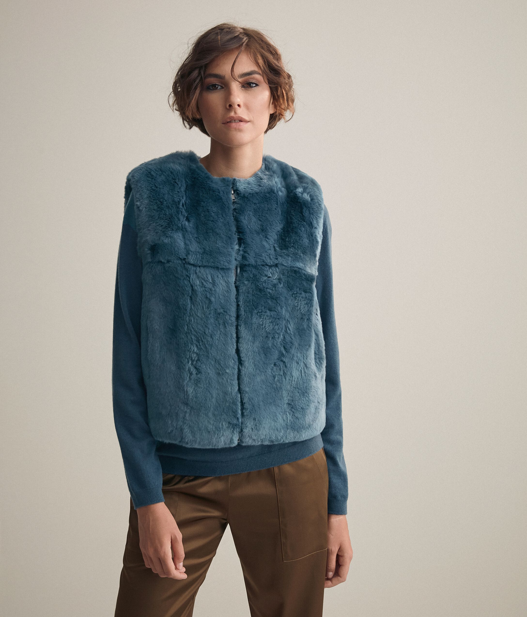Gilet corto realizzato in pelliccia di Rex con chiusura a zip. La vestibilità è asciutta. La modella è alta 179 cm e veste una taglia M