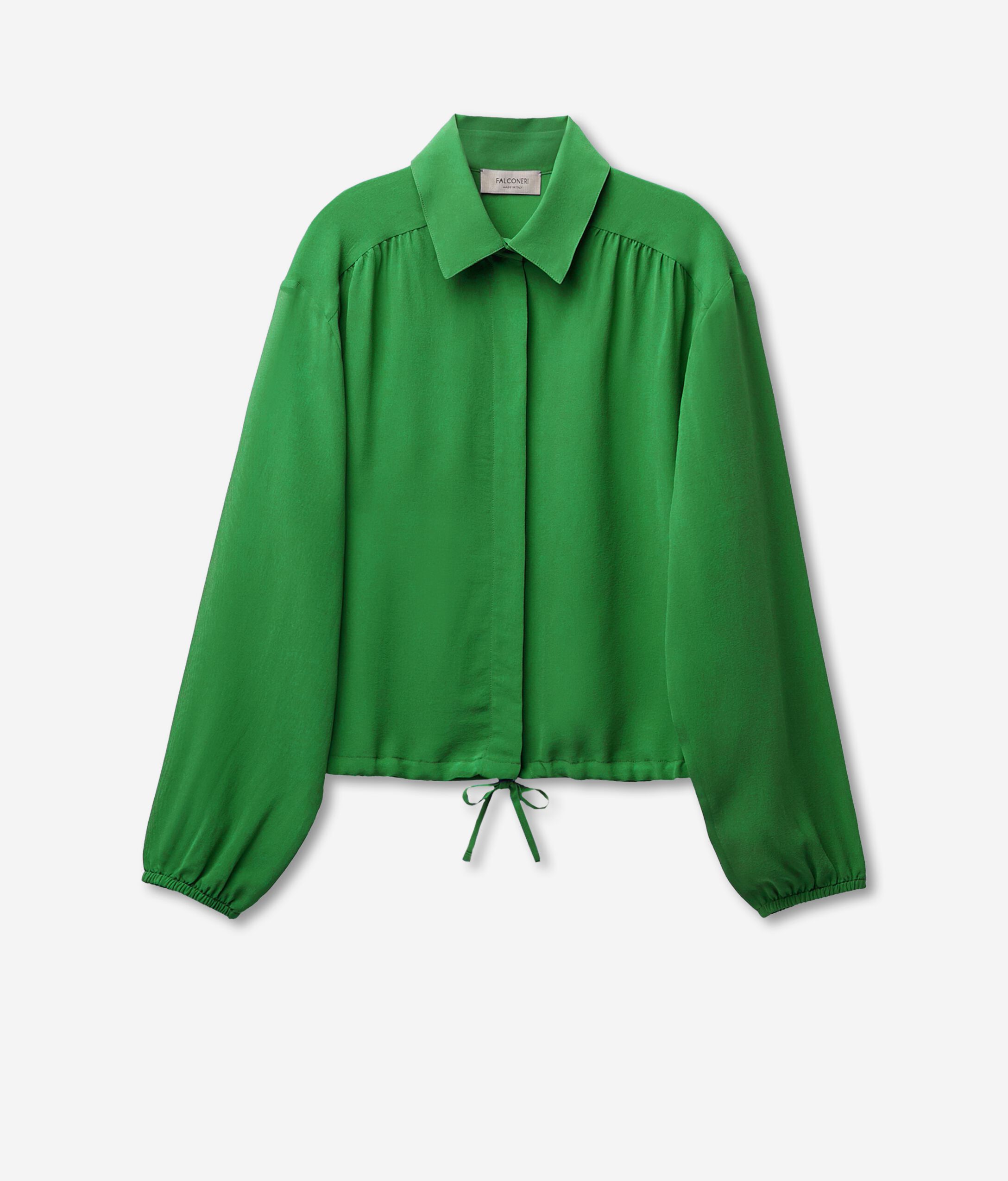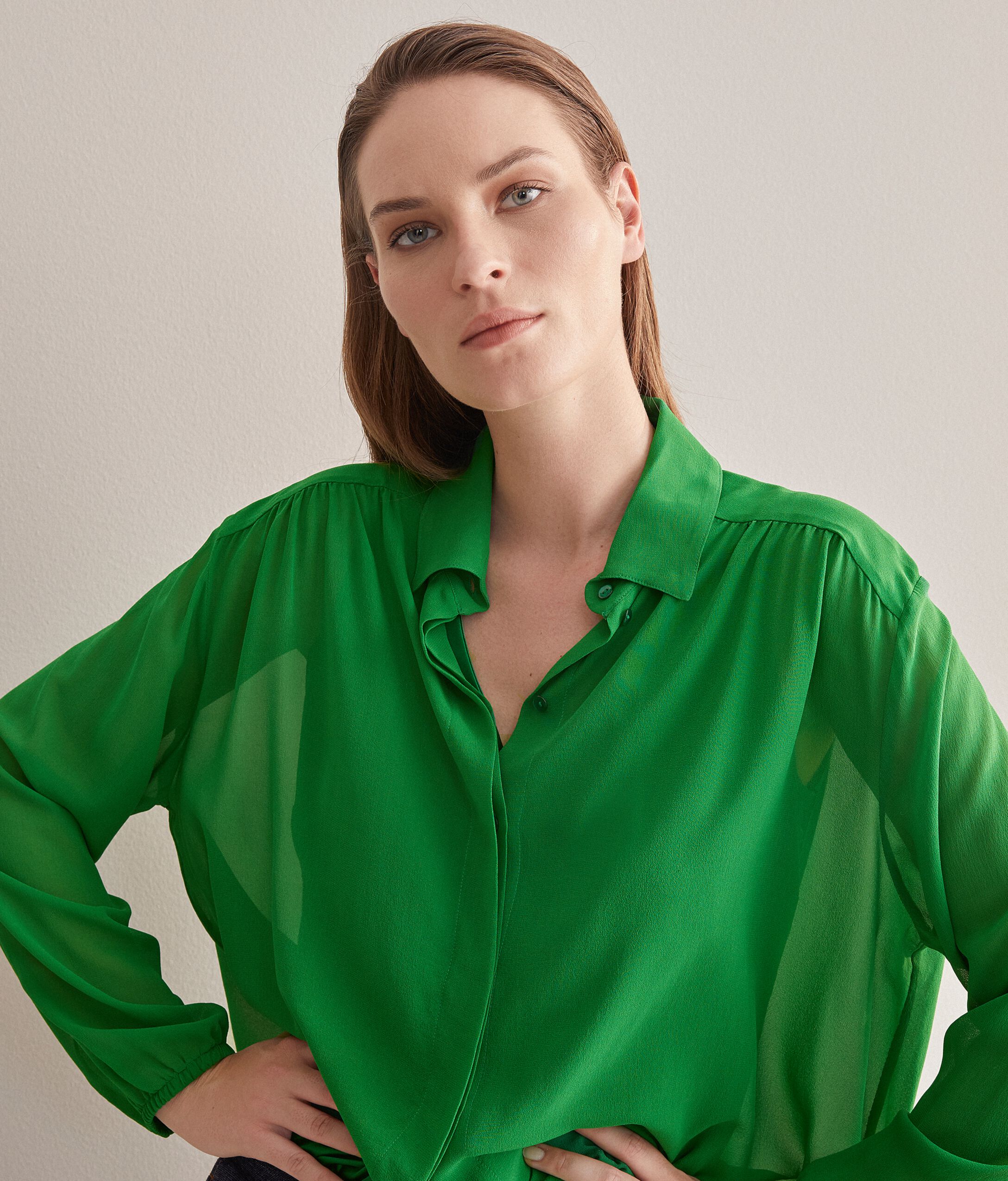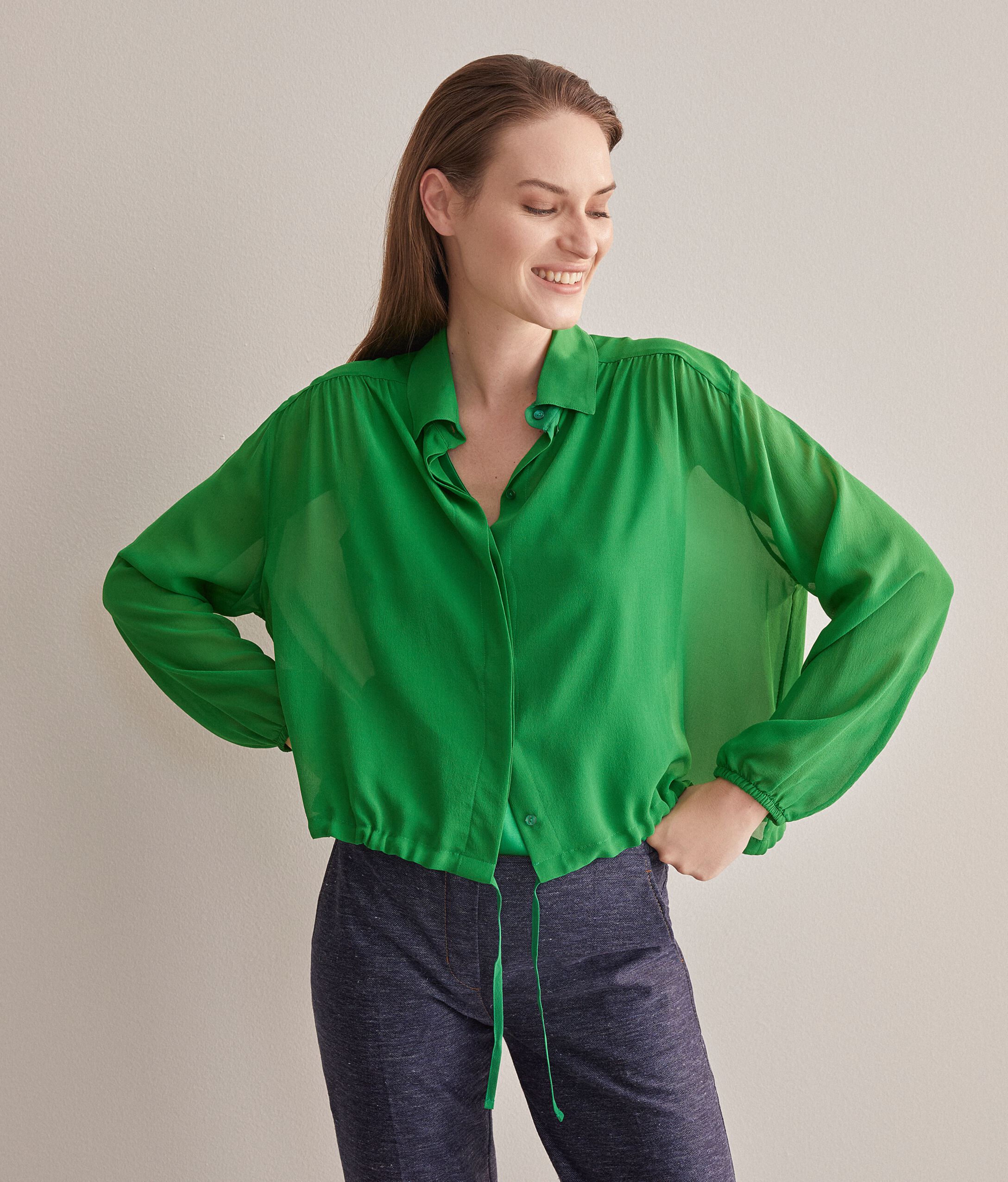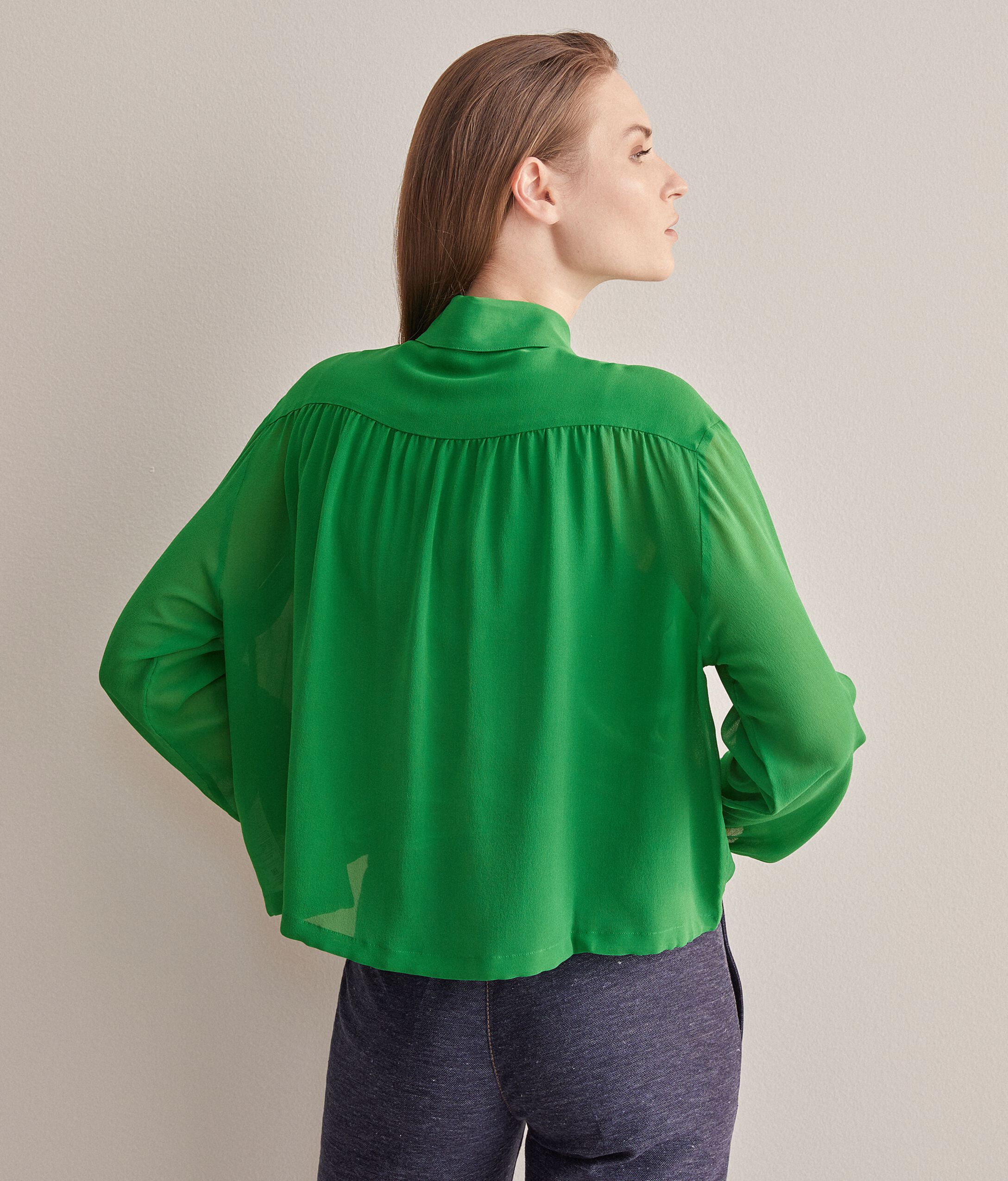L'identità del brand prende vita dal pregio dei filati e si esprime nelle linee pulite ed armoniose della collezione in un raffinato equilibrio di fascino e stile. La texture rarefatta e leggermente increspata della pura seta georgette, esalta i volumi generosi di questa camicia fluida e delicatamente trasparente, spiccano le ampie maniche definite da un elastico sui polsi ed una coulisse al fondo che regola lunghezza e arriccio della camicia in vita. La chiusura è classica con bottoni a nascosti.
