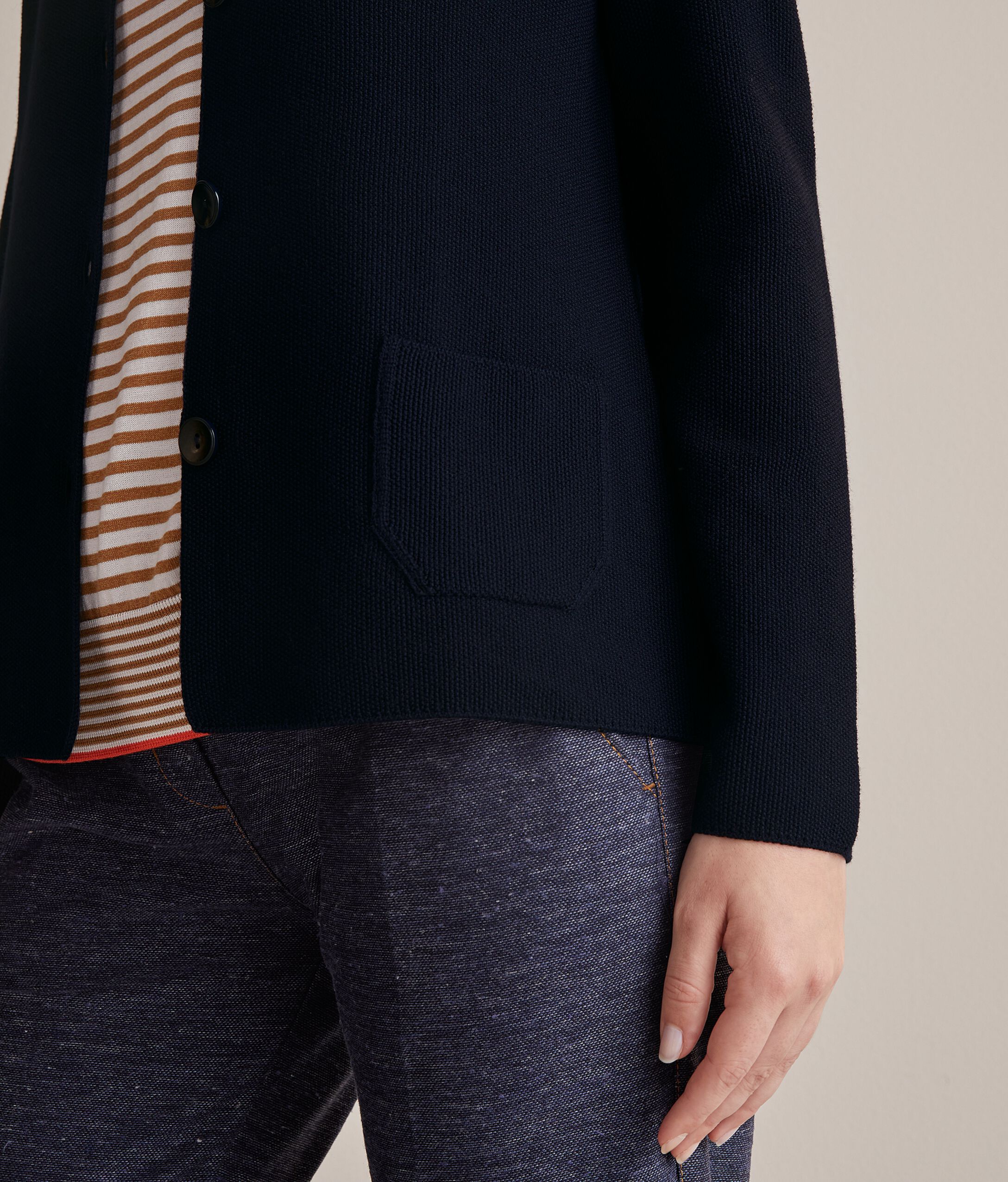 Giacca in lana con lavorazione piquet con tre bottoni e taschine applicate. Capo classico, perfetto per ogni occasione. Vestibilità regolare. La modella è alta 179cm e veste una taglia MPetto: 88cm / Vita: 67cm / Fianchi: 94cm
