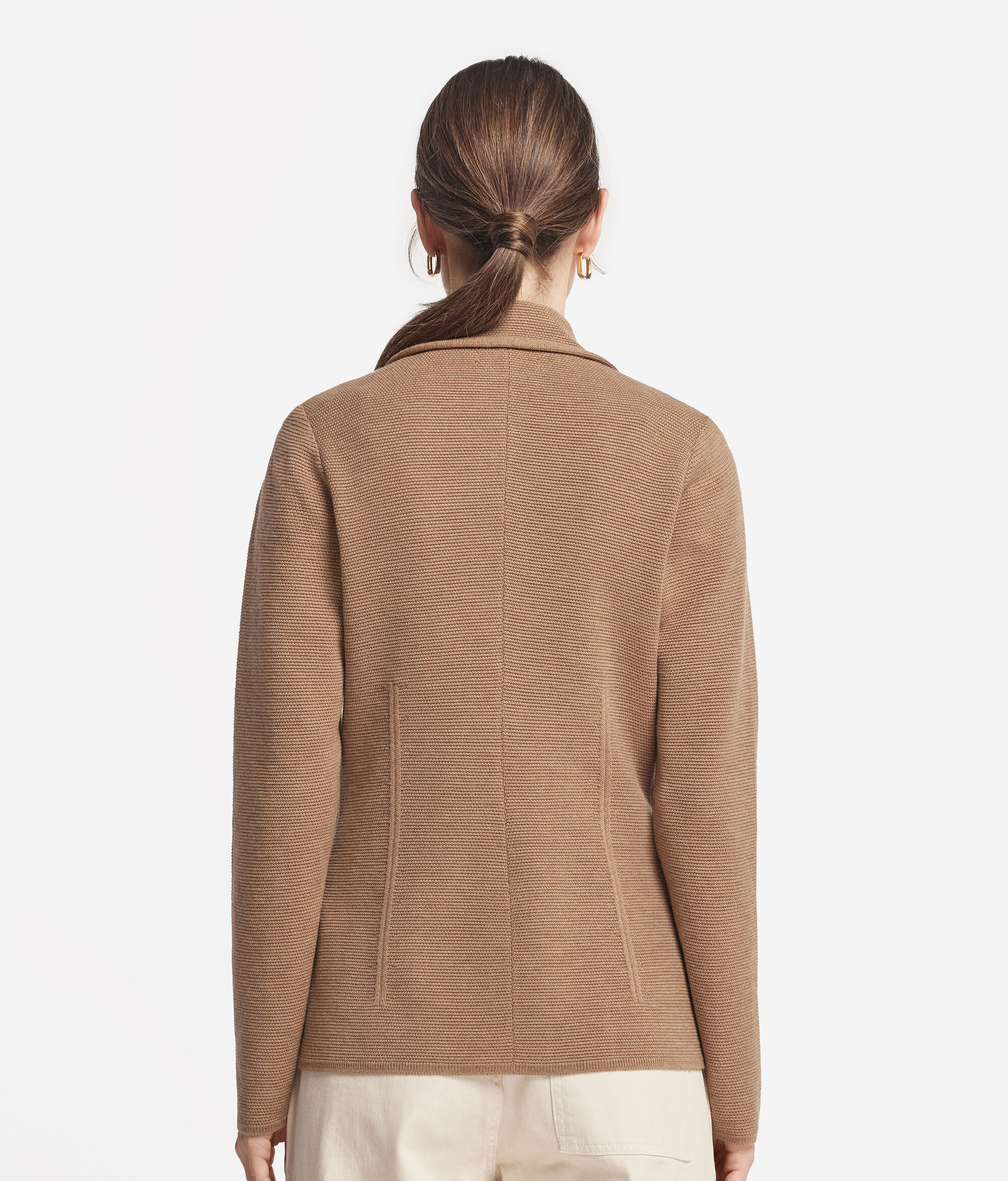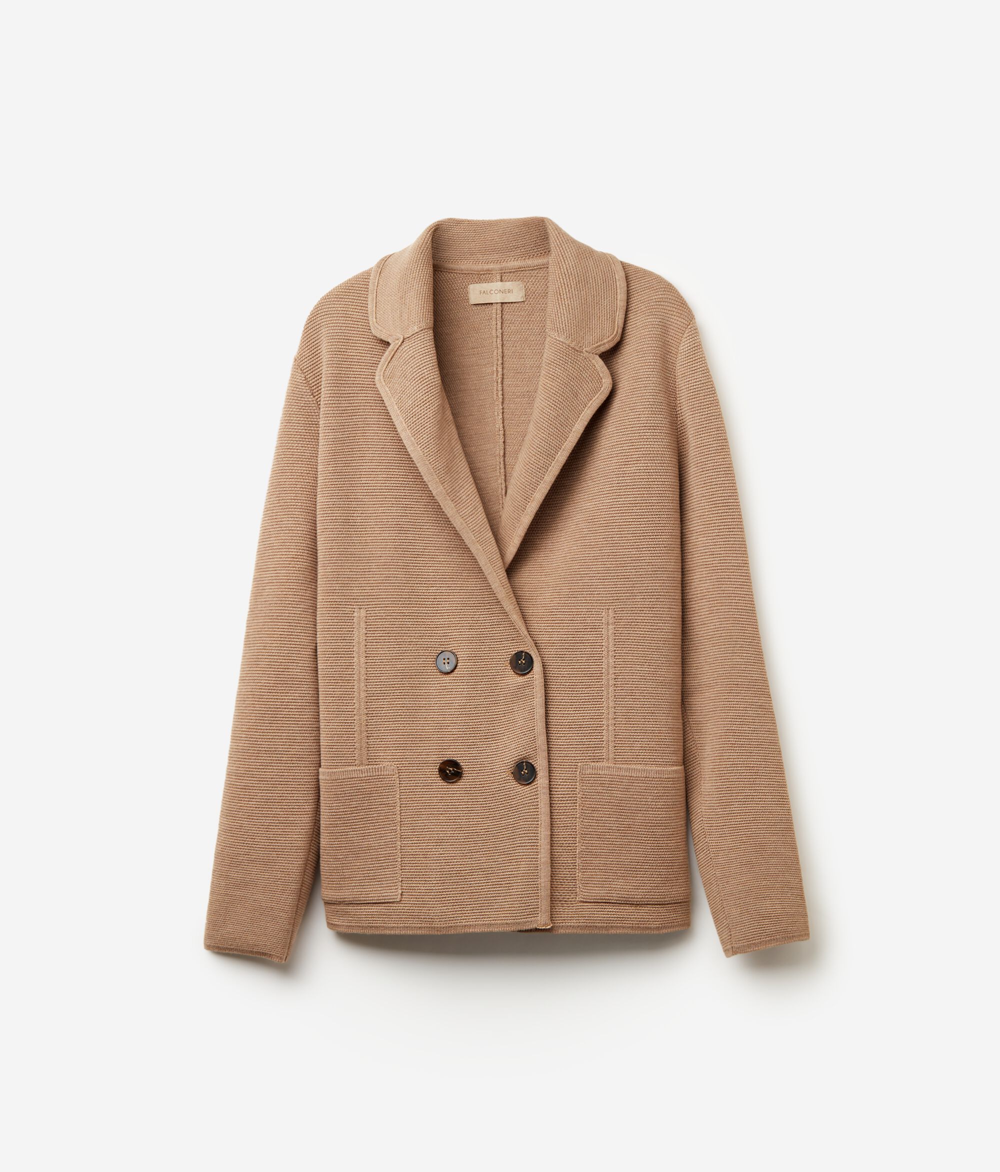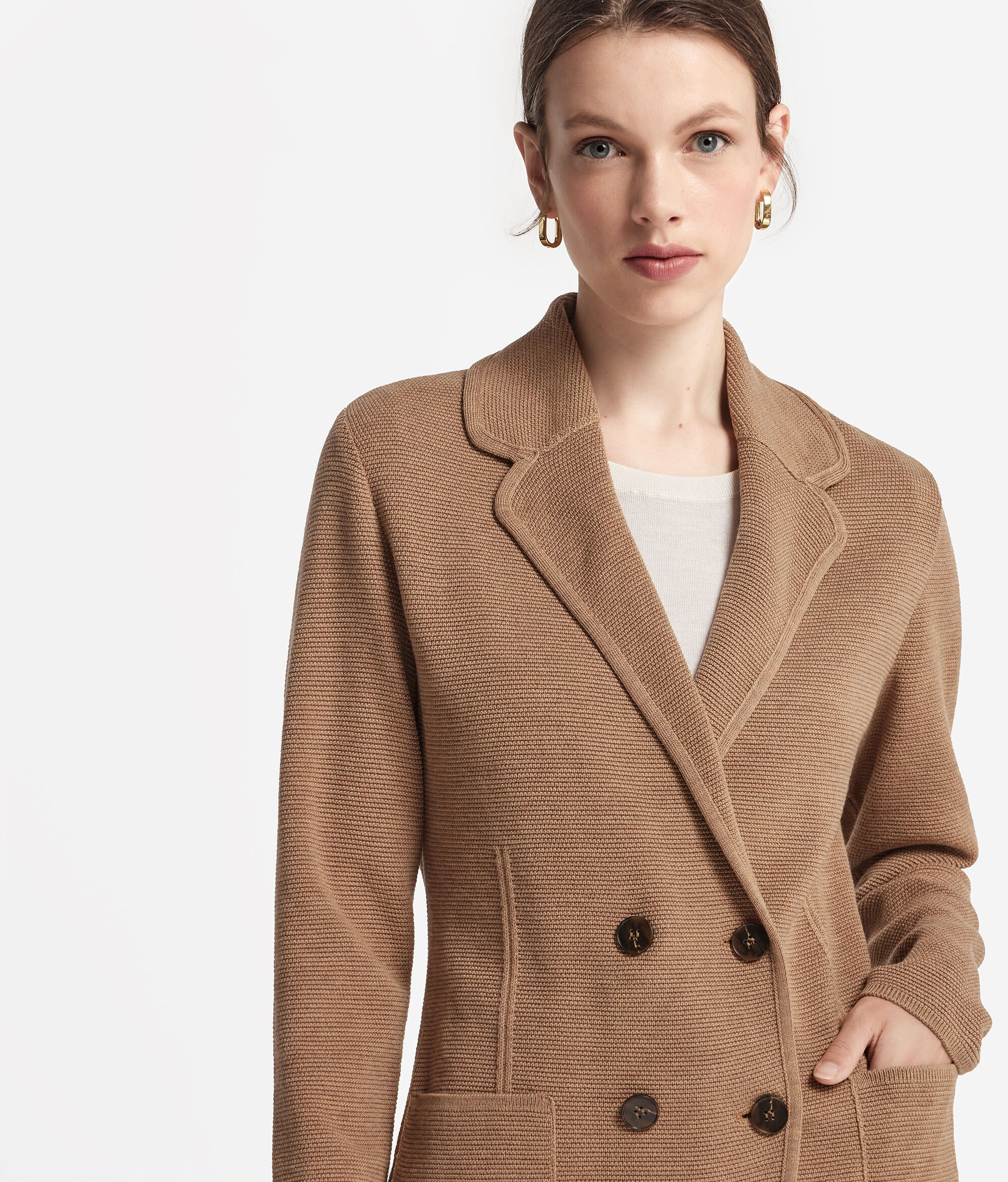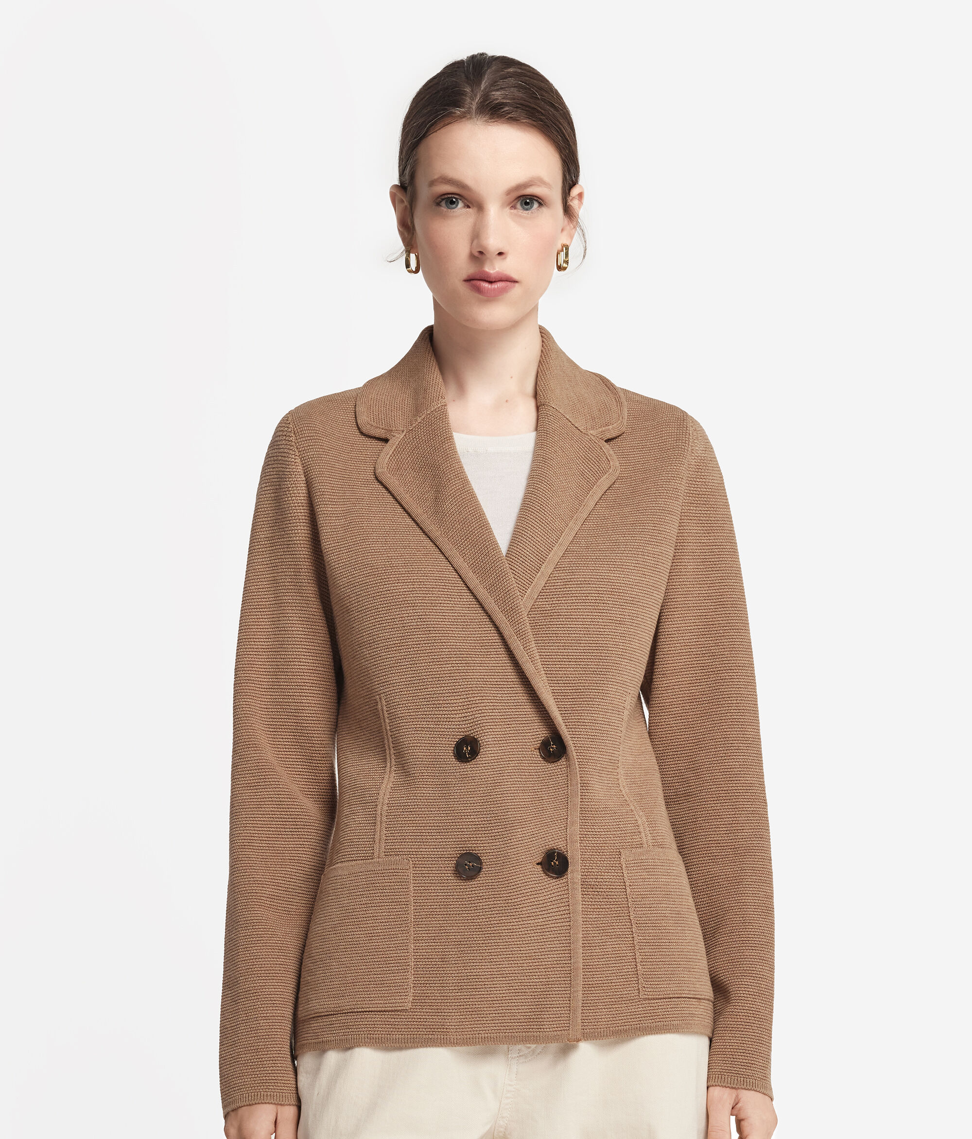 Aggiungi un tocco di stile al tuo guardaroba con questa giacca in lana. Un capo che offre calore e morbidezza, ideale nelle giornate più fresche. La lavorazione a links dona un tocco distintivo e di classe, creando una texture originale. Il rever classico e la chiusura doppiopetto donano al design un aspetto sofisticato e formale. Le spalle regolari conferiscono una silhouette pulita e strutturata, mentre la vestibilità slim segue delicatamente le linee del corpo, sottolineando una figura elegan