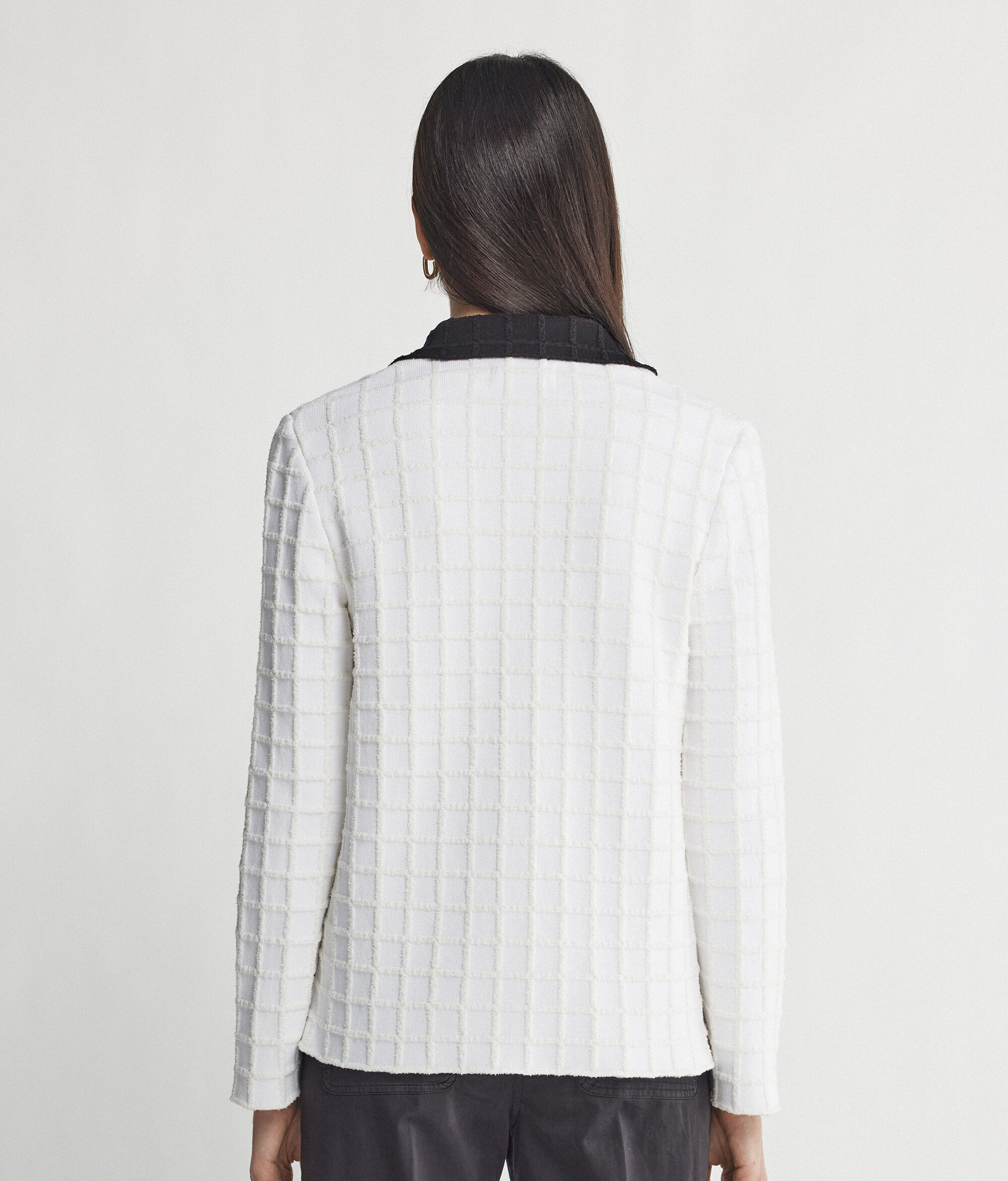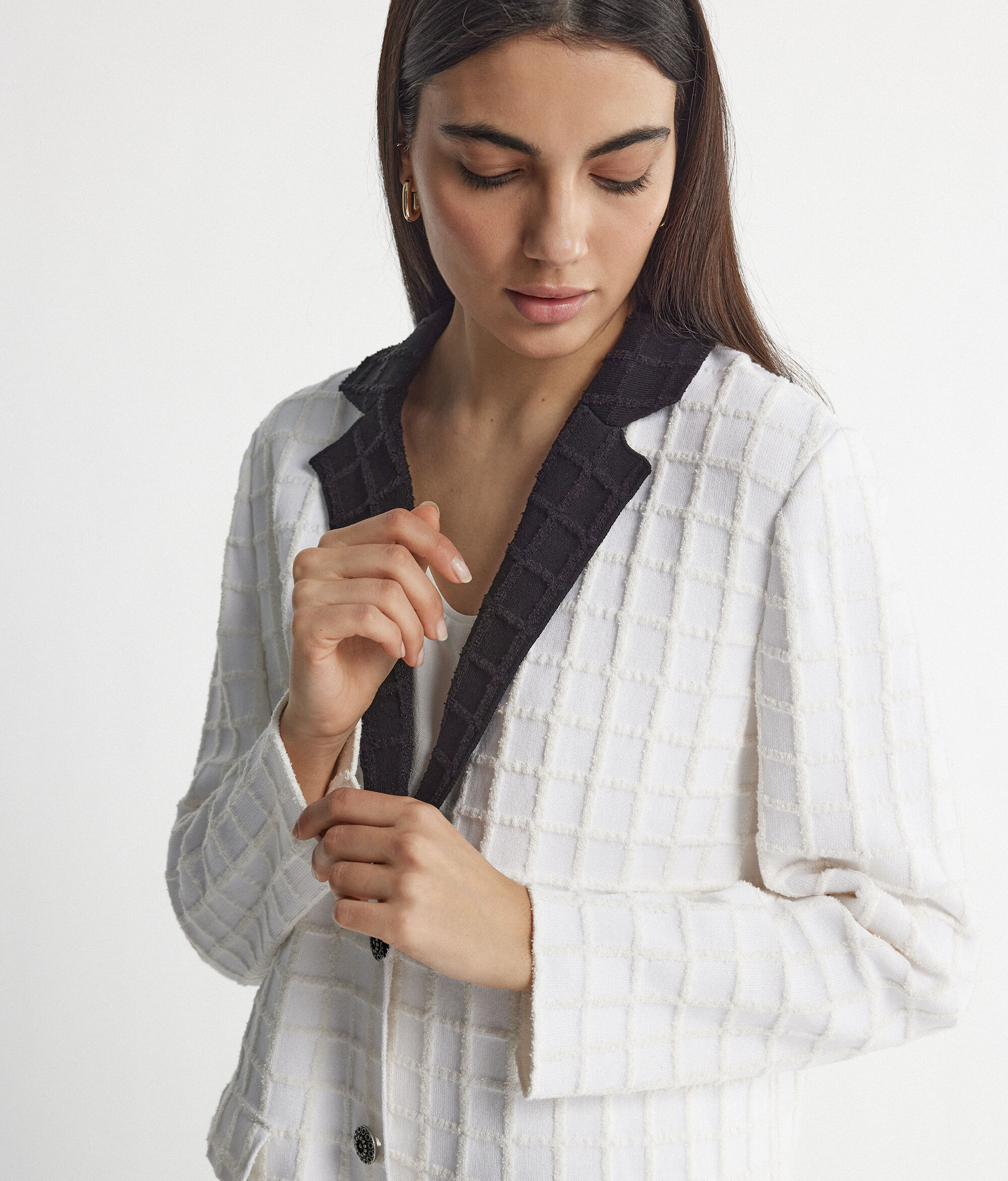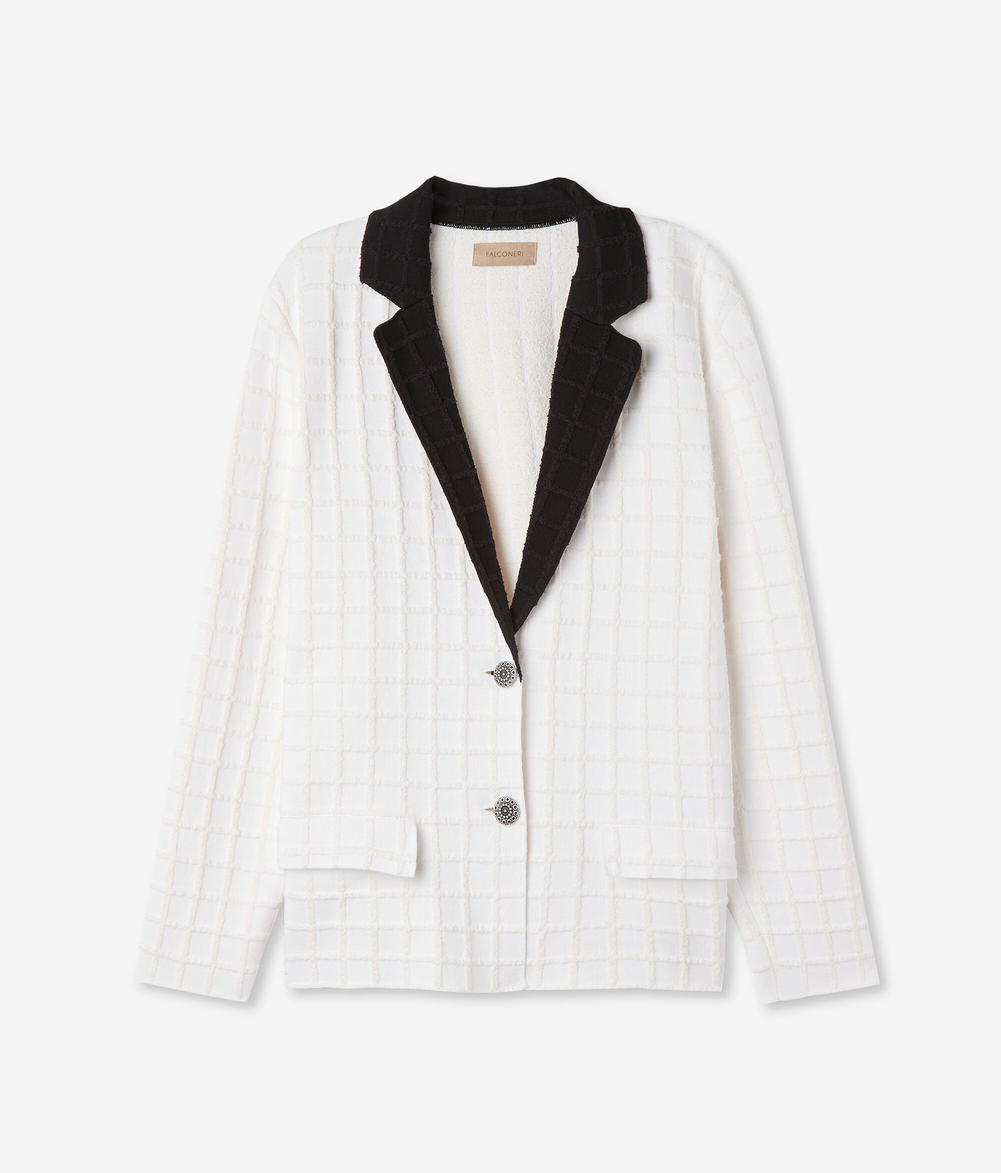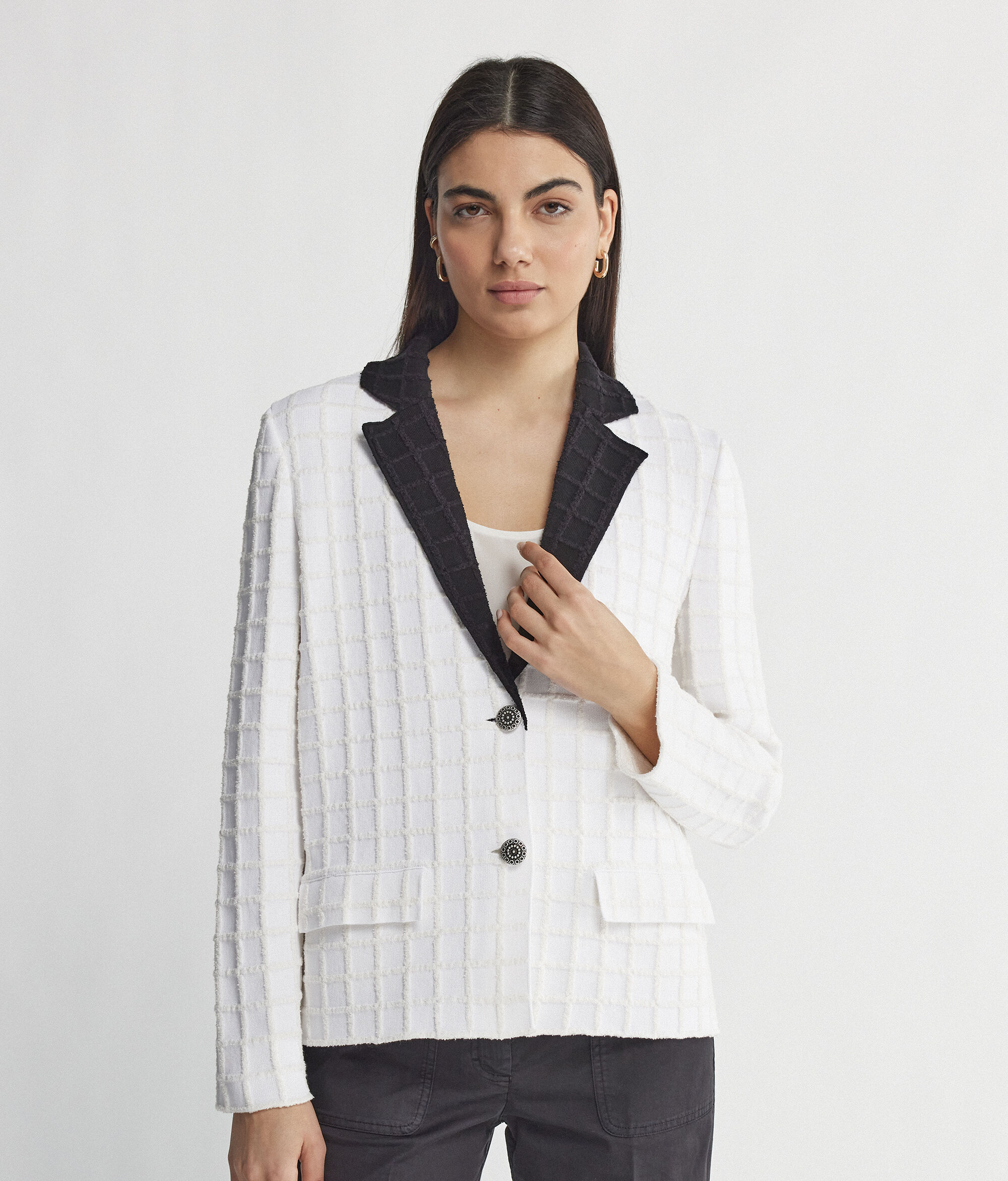 Questa giacchina dallo stile bon ton abbraccia il gusto di chi ama uno stile elegante e senza tempo. Bianca con colletto nero a contrasto si presta a dare quel tocco in più anche agli outfit più semplici.