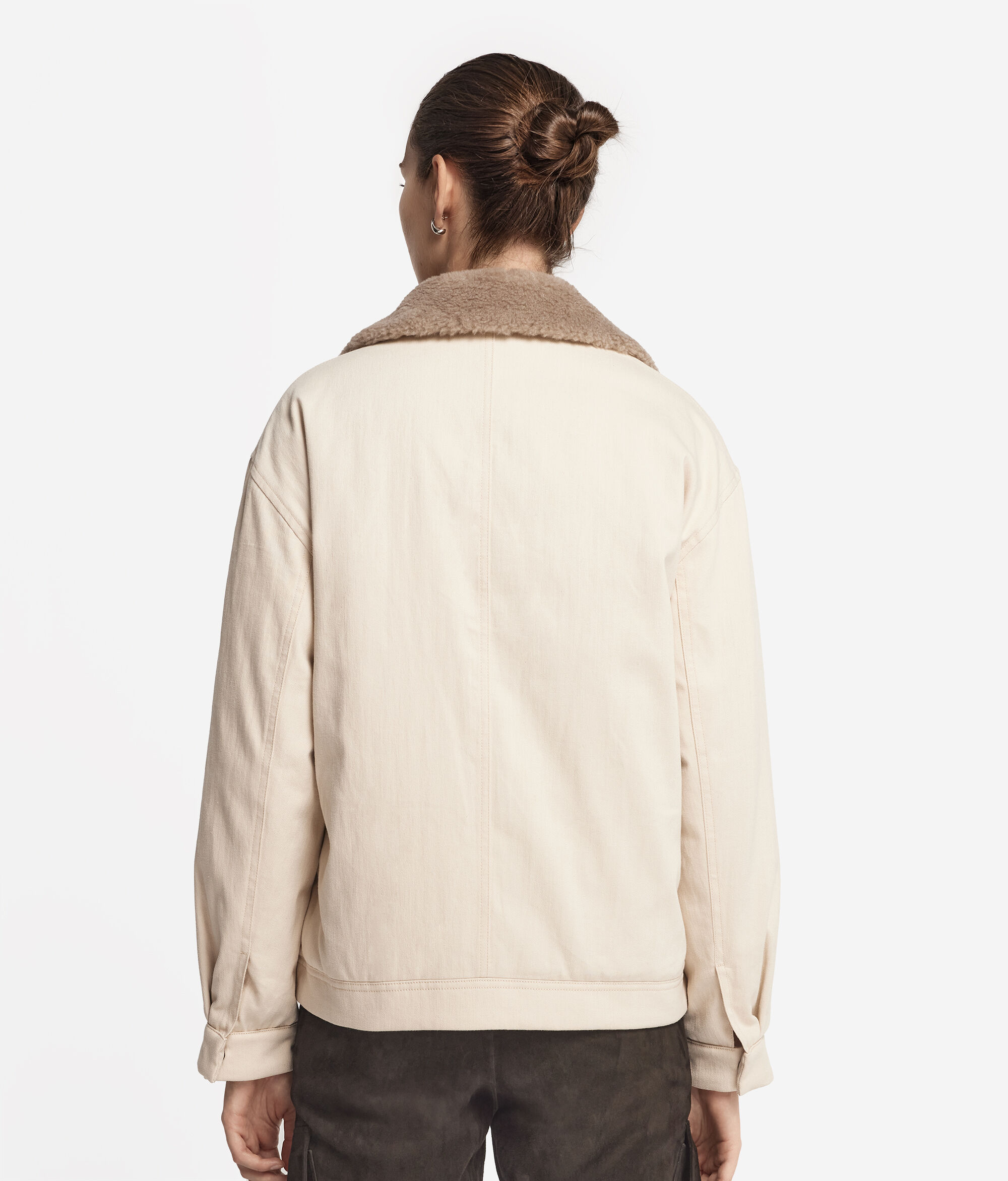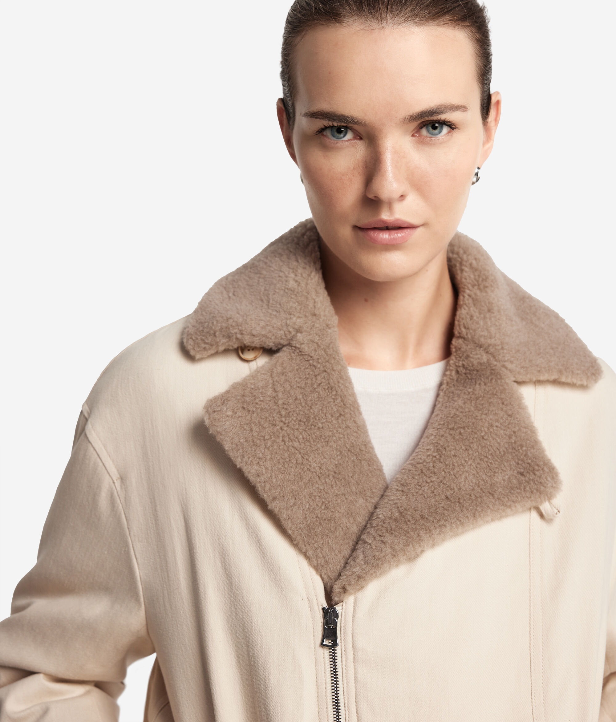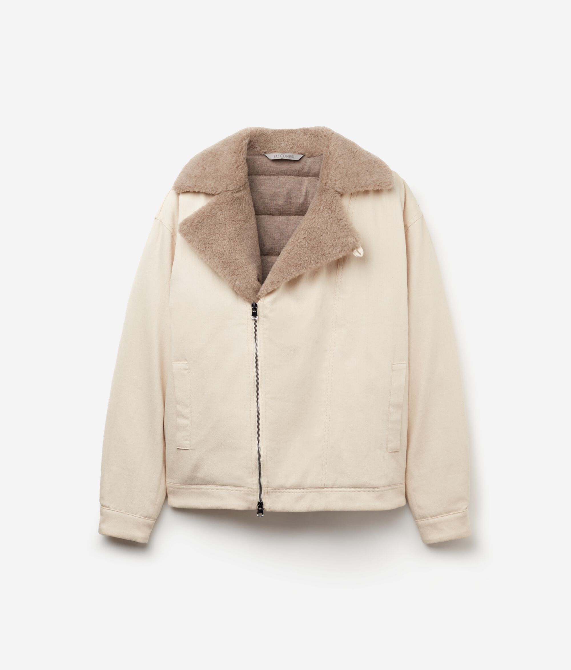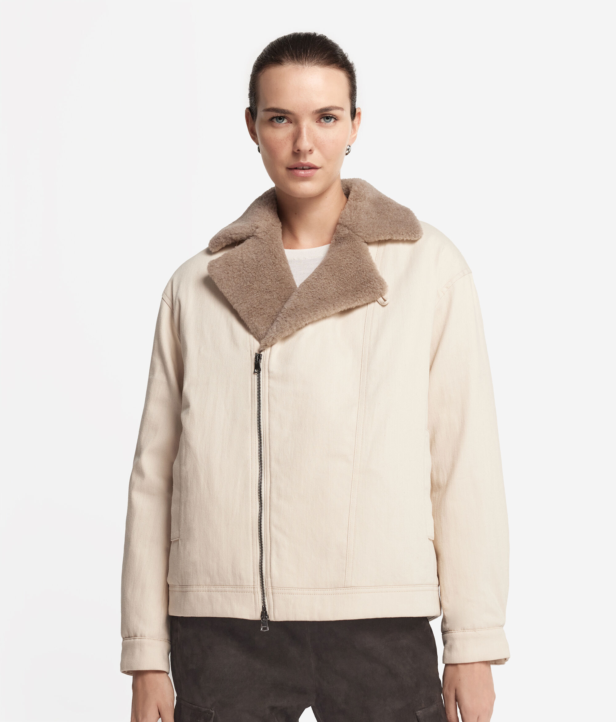 Scopri l'eleganza di questo giubbino in tessuto di cotone, un capo perfetto per aggiungere un tocco di classe al tuo stile quotidiano. L'interno è impreziosito da un'imbottitura in piuma e una fodera in Cashmere Ultrafine trapuntato, che garantisce calore e una sensazione di morbidezza incomparabile. Il rever in tessuto effetto pelliccia, realizzato anch'esso in Cashmere Ultrasoft, aggiunge un tocco di sofisticatezza e lusso, incorniciando elegantemente il viso. La sua vestibilità morbida conferisce un fit rilassato e naturale, in perfetto stile contemporaneo.