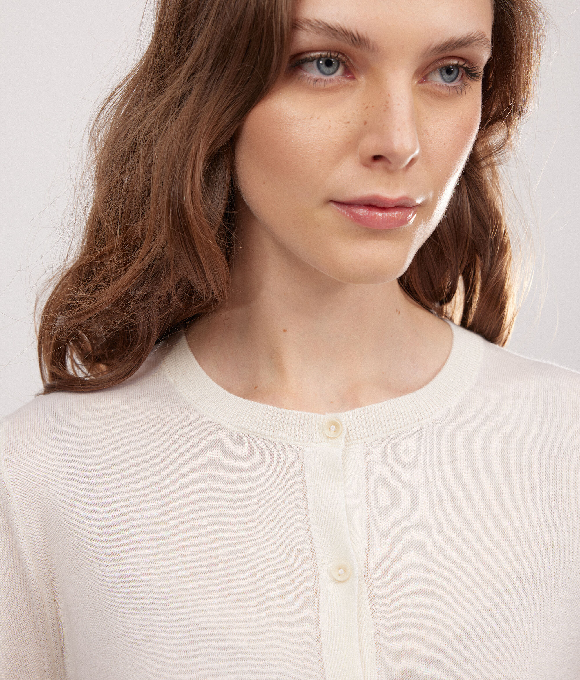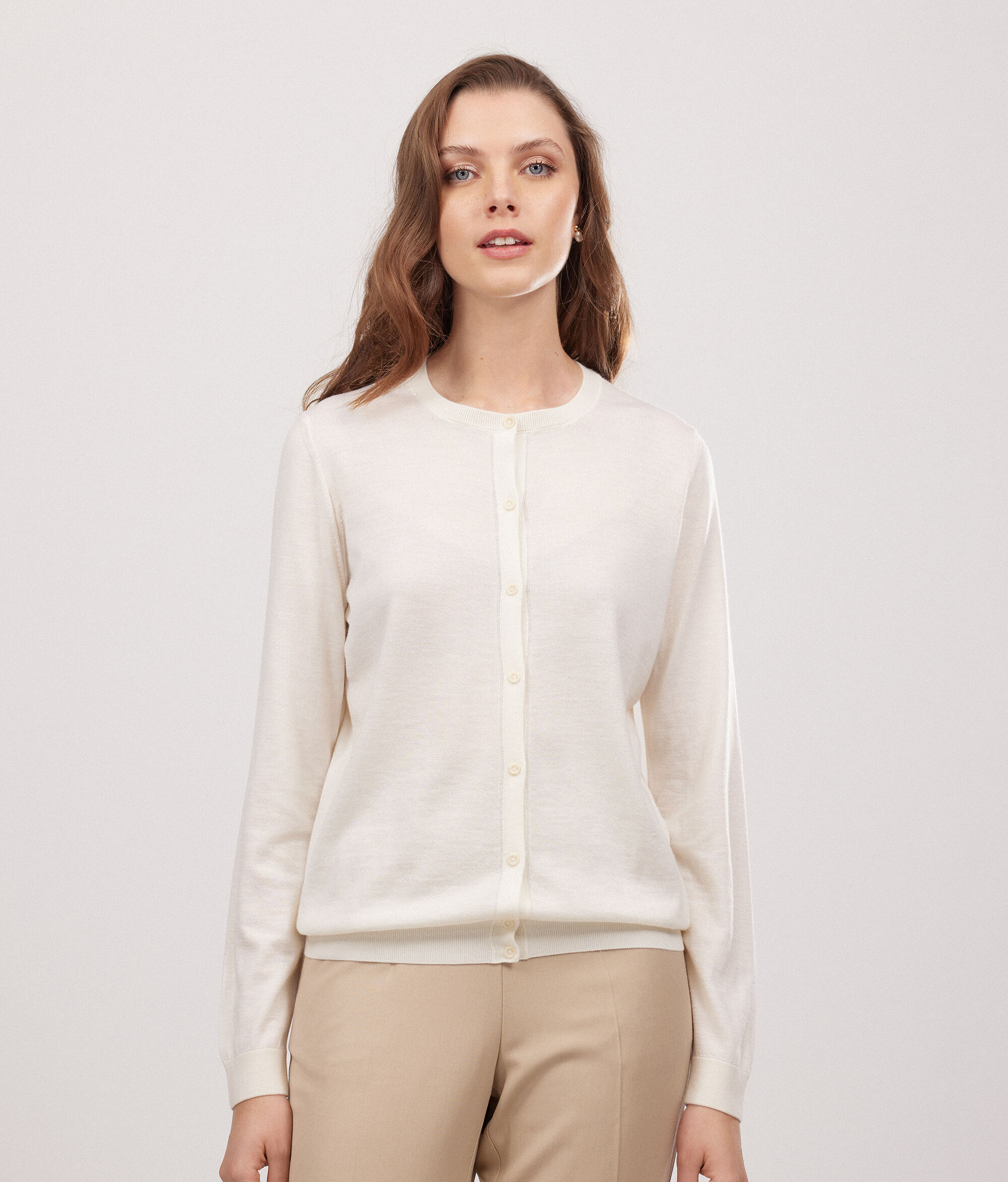 Una raffinata combinazione di classico e contemporaneo percorre lo stile di tutta la collezione Falconeri, l'amore per i materiali pregiati e la cura dei dettagli si esprimono nella scelta di filati iconici come il puro cashmere Ultrafine e nell'equilibrio di forme e volumi. Questo golfino girocollo con bottoni rappresenta un capo chiave nel guardaroba di ogni donna.