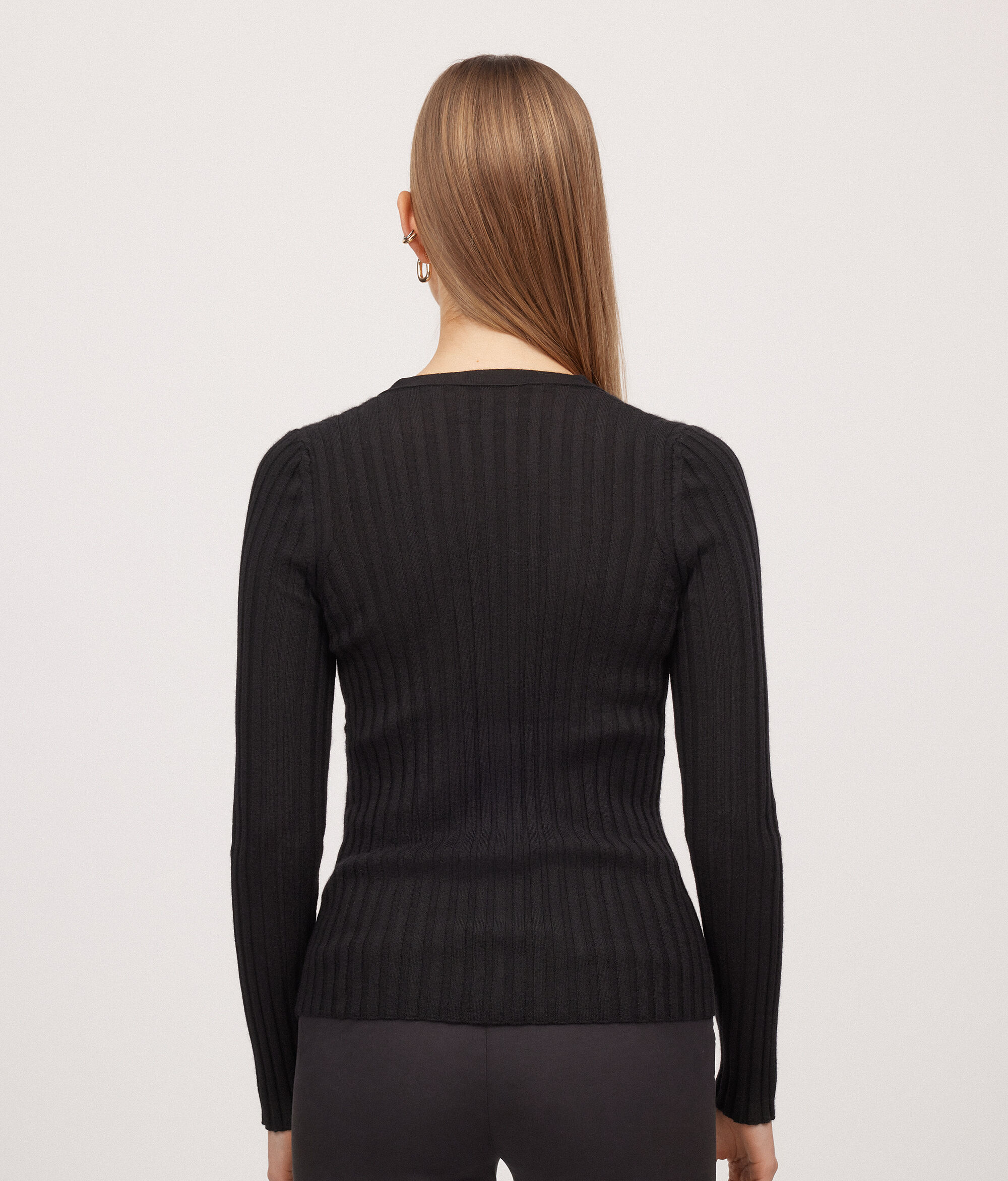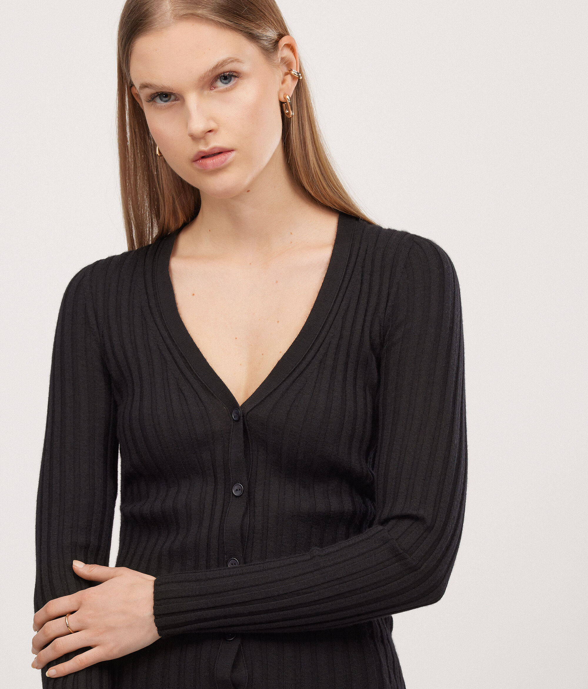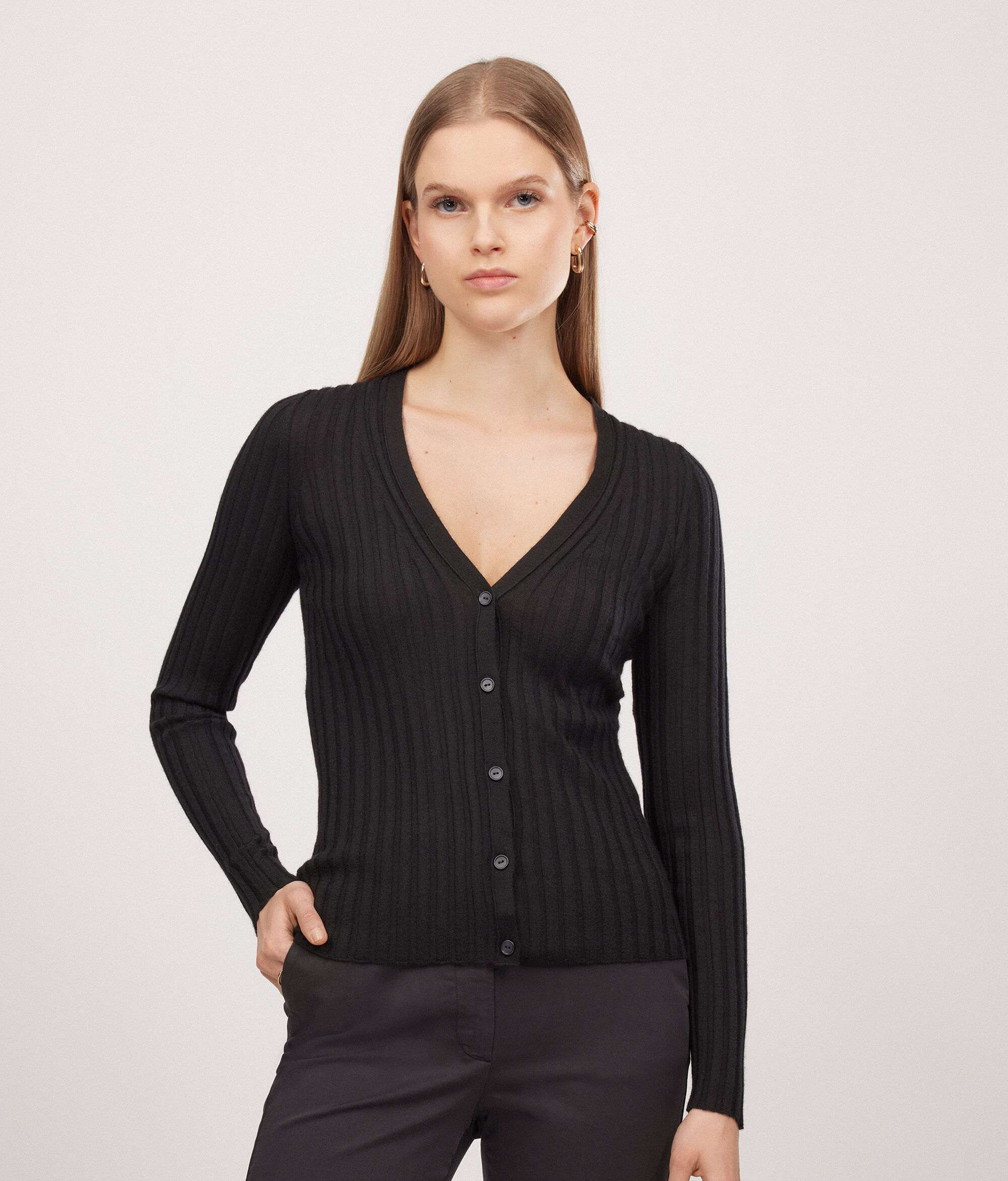 Il golfino a costine in cashmere ultrafine a maniche lunghe, presenta uno scollo a V con una chiusura frontale con cinque bottoncini a vista in tono. La spalle sono regolari e la vestibilità è da considerarsi slim.