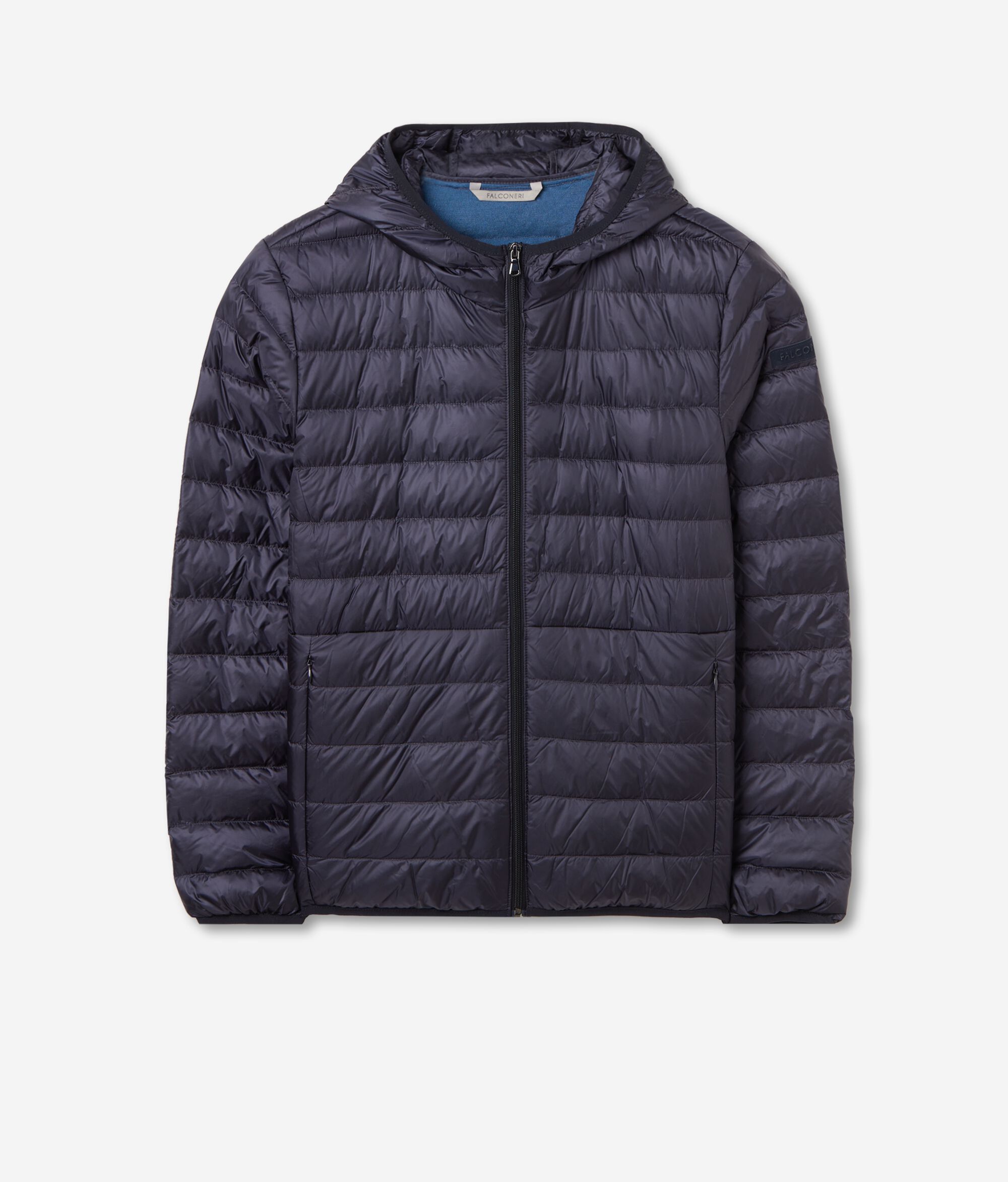 Il piumino è realizzato con imbottitura in piuma e si presenta esternamente con un tessuto tecnico di colore unito e foderato internamente in cashmere ultrafine. Il modello a manica lunga è dotato anche di un cappuccio, la chiusura presenta una zip centrale, si completa con tasche laterali la cui zip è del tutto invisibile. La sua vestibilita è regolare.