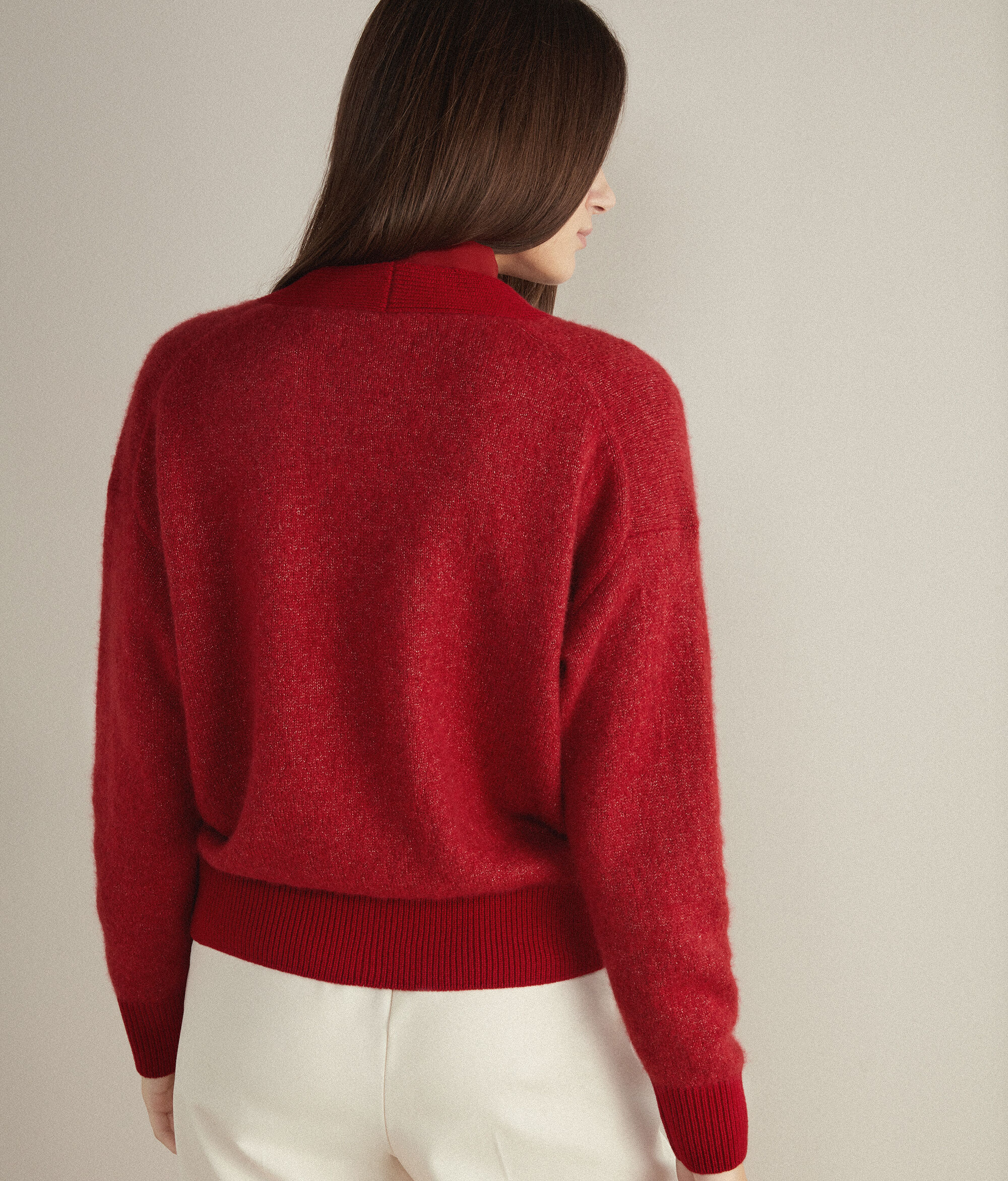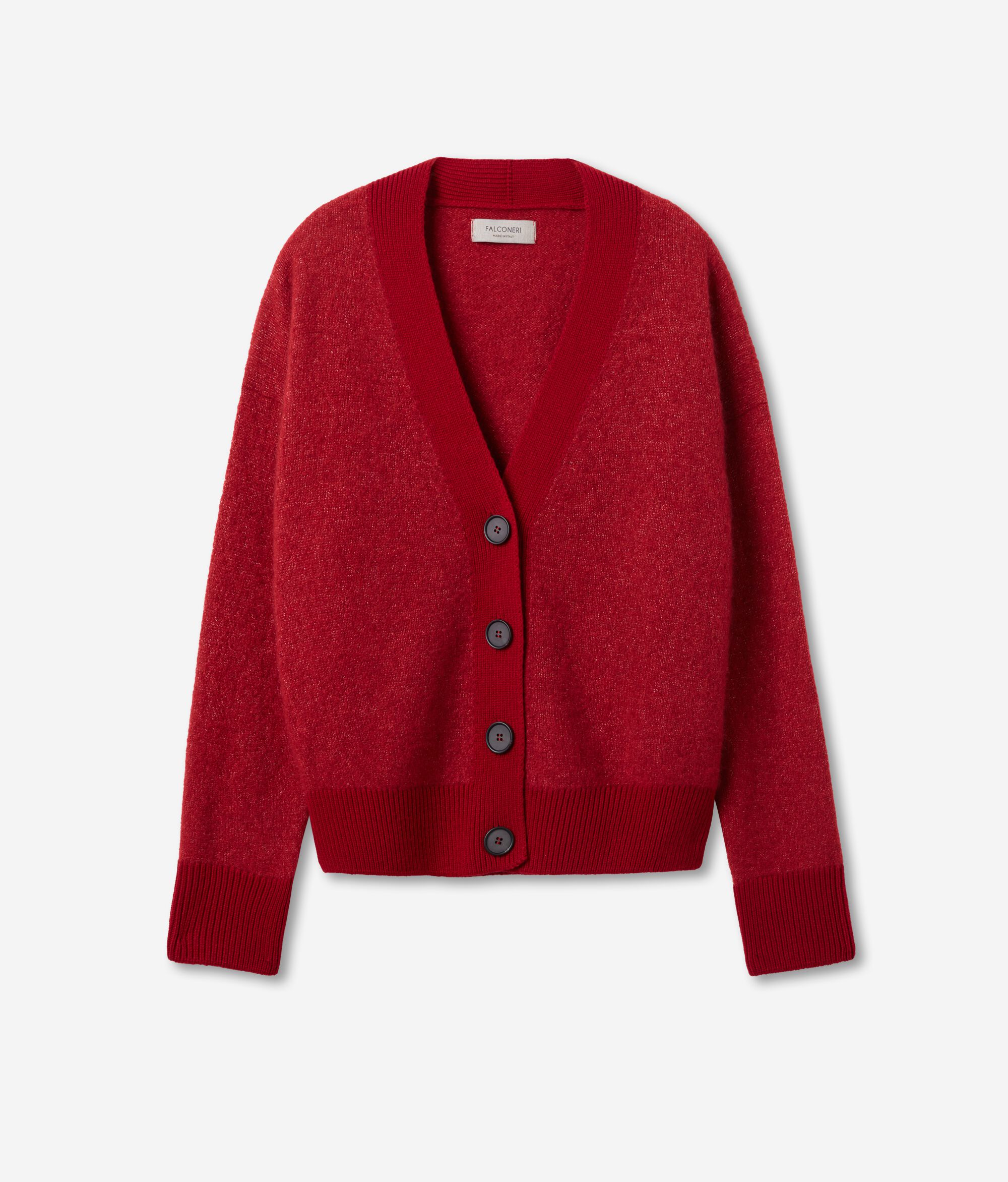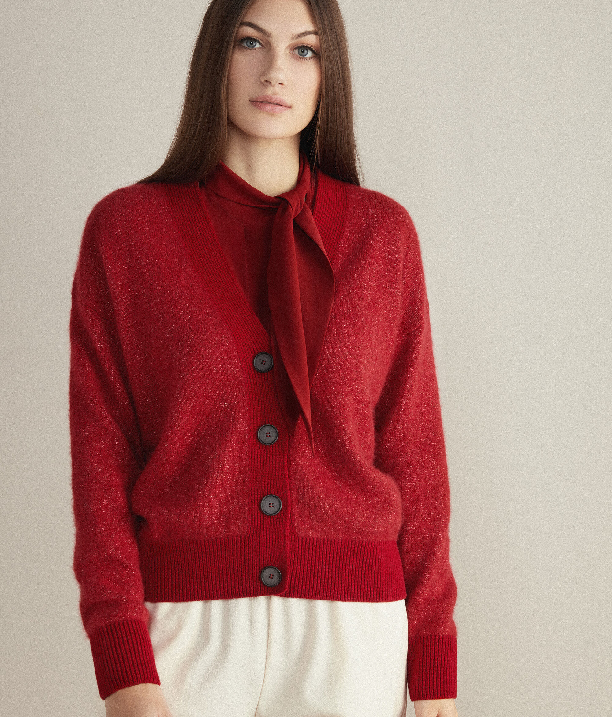 Cardigan over con profonda scollatura a V in prezioso filato di cashmere e seta dalle forme morbide, le maniche sono ampie e le spalle scese. Bottoni a vista in contrasto colore. Dettagli preziosi come polsini, scollatura e fondo a costine di cashmere ultrasoft.