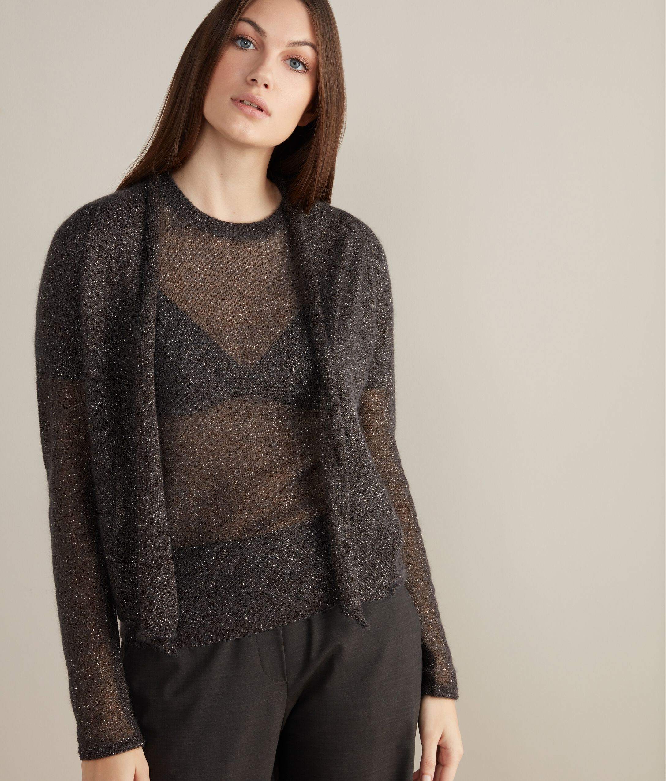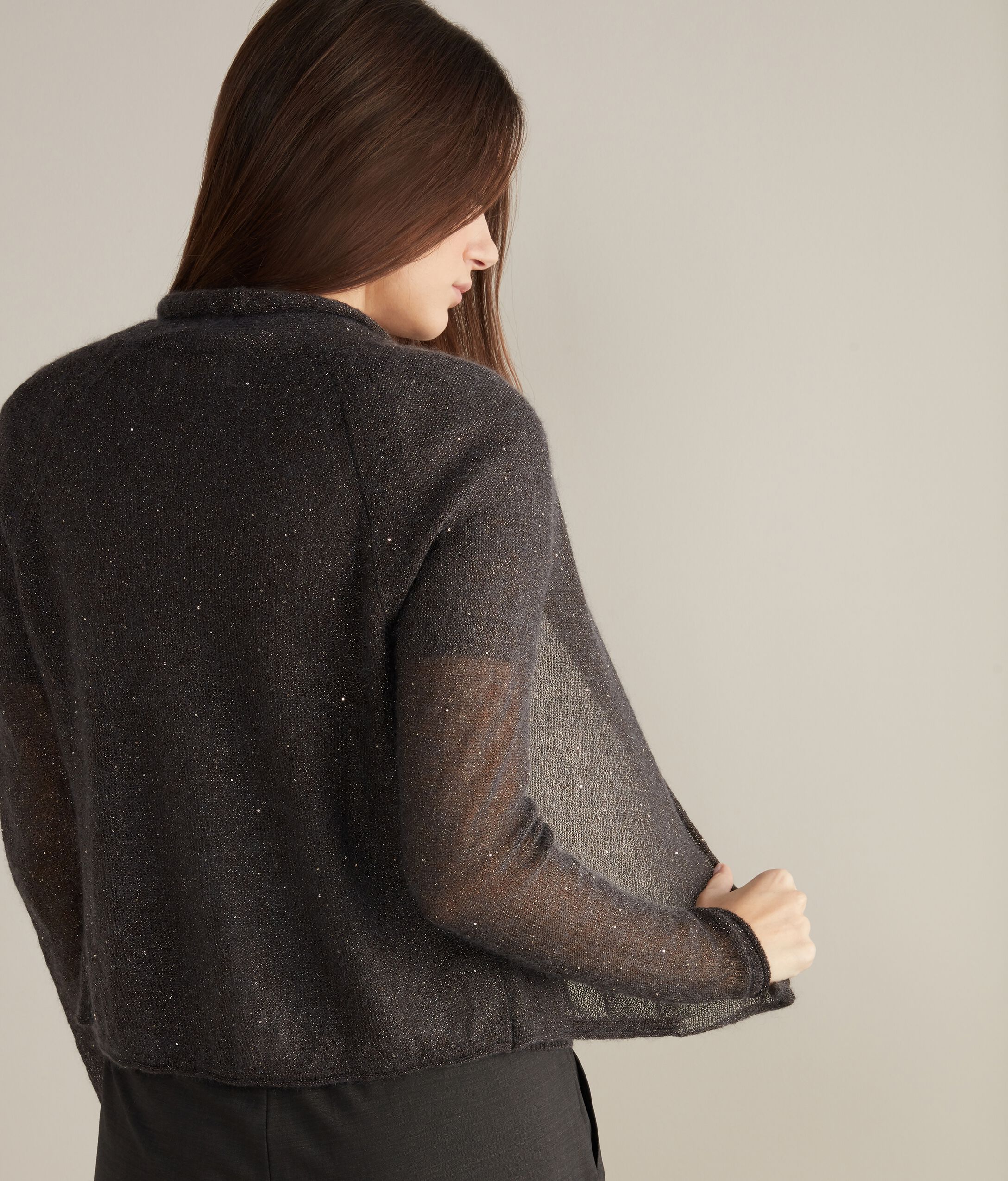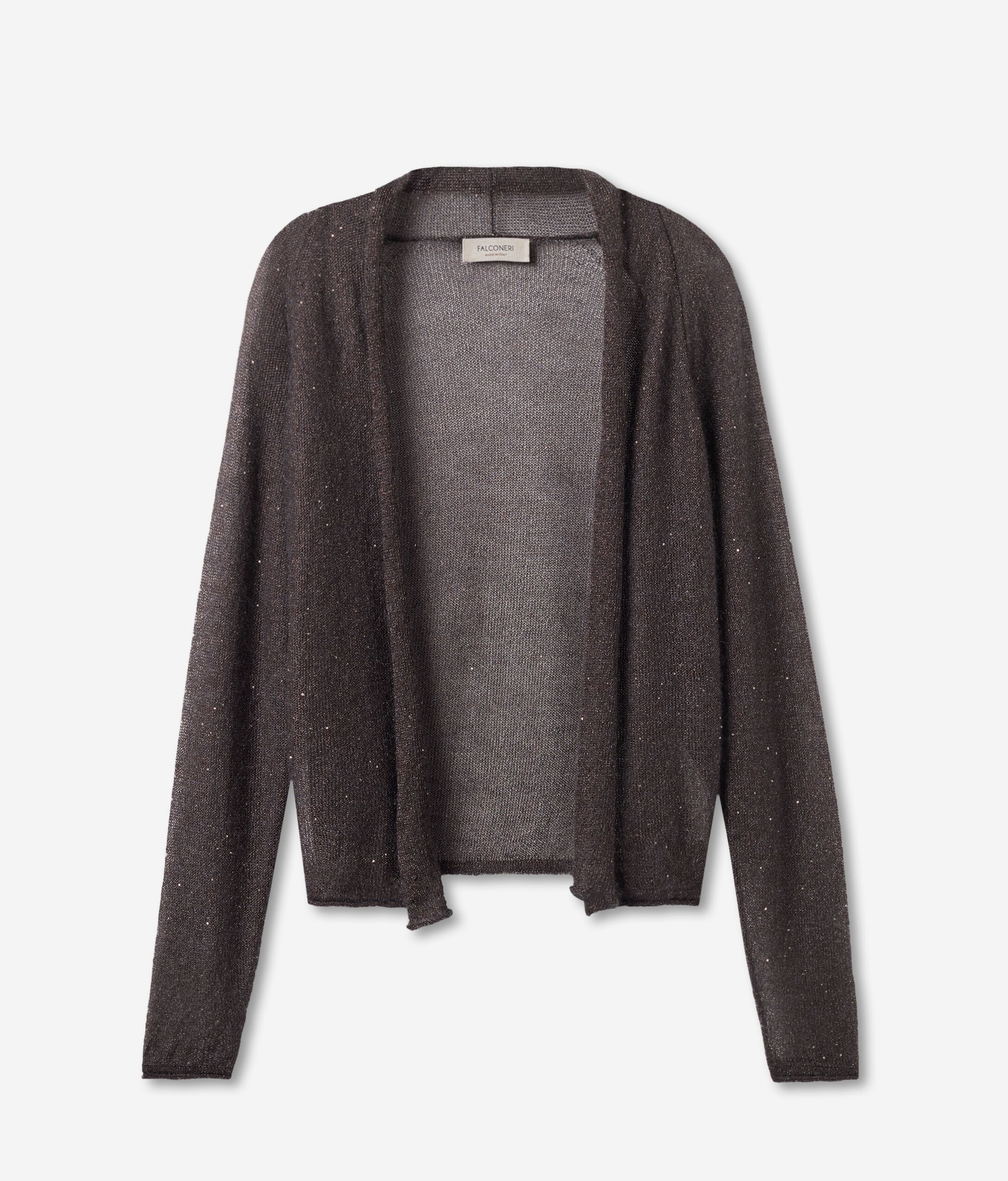 Cardigan aperto in pregiato filato semitrasparente e brillanti micropaillettes all'interno con collo a scialle e maniche a raglan. Perfetto se abbinato a DMM457A.