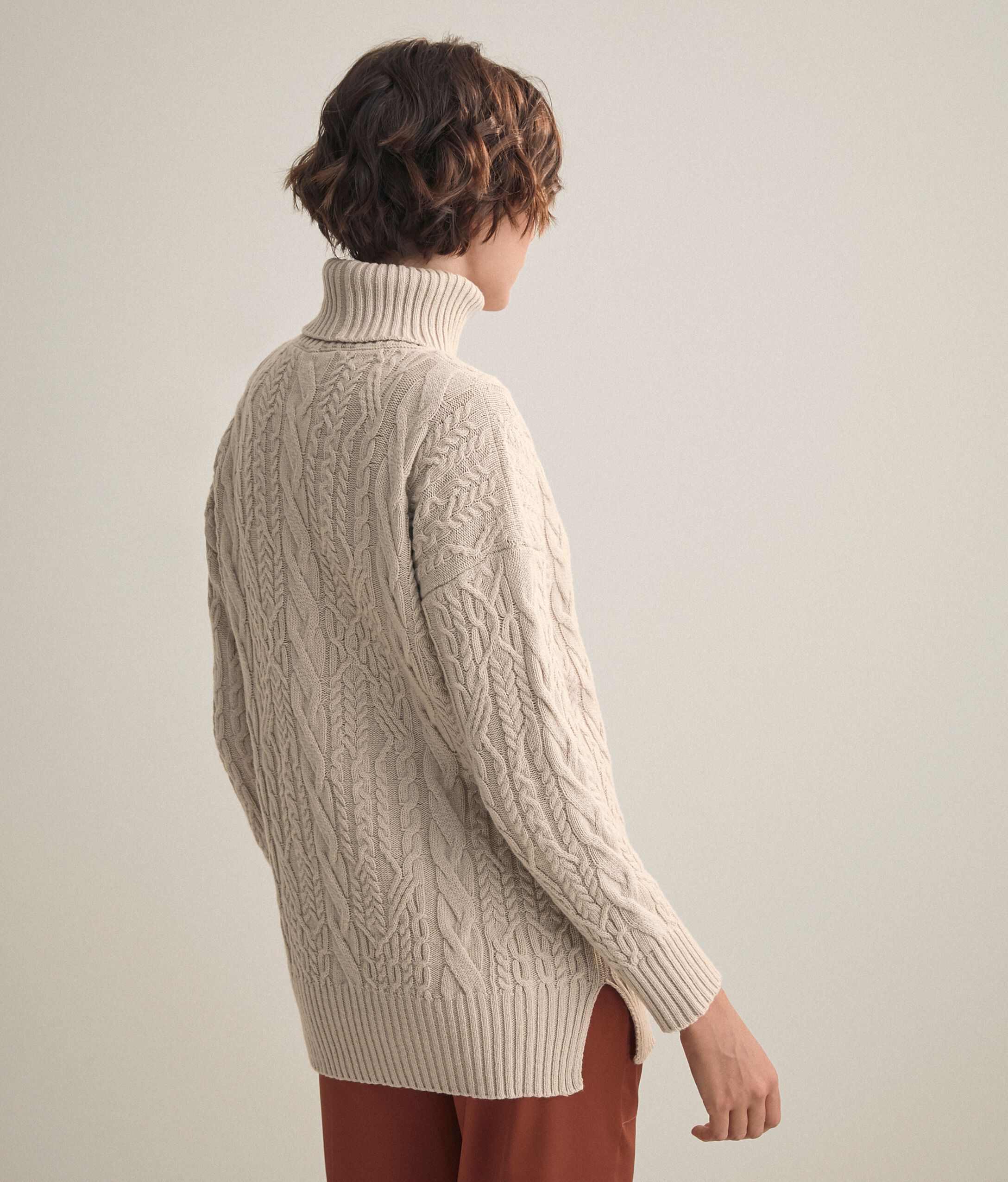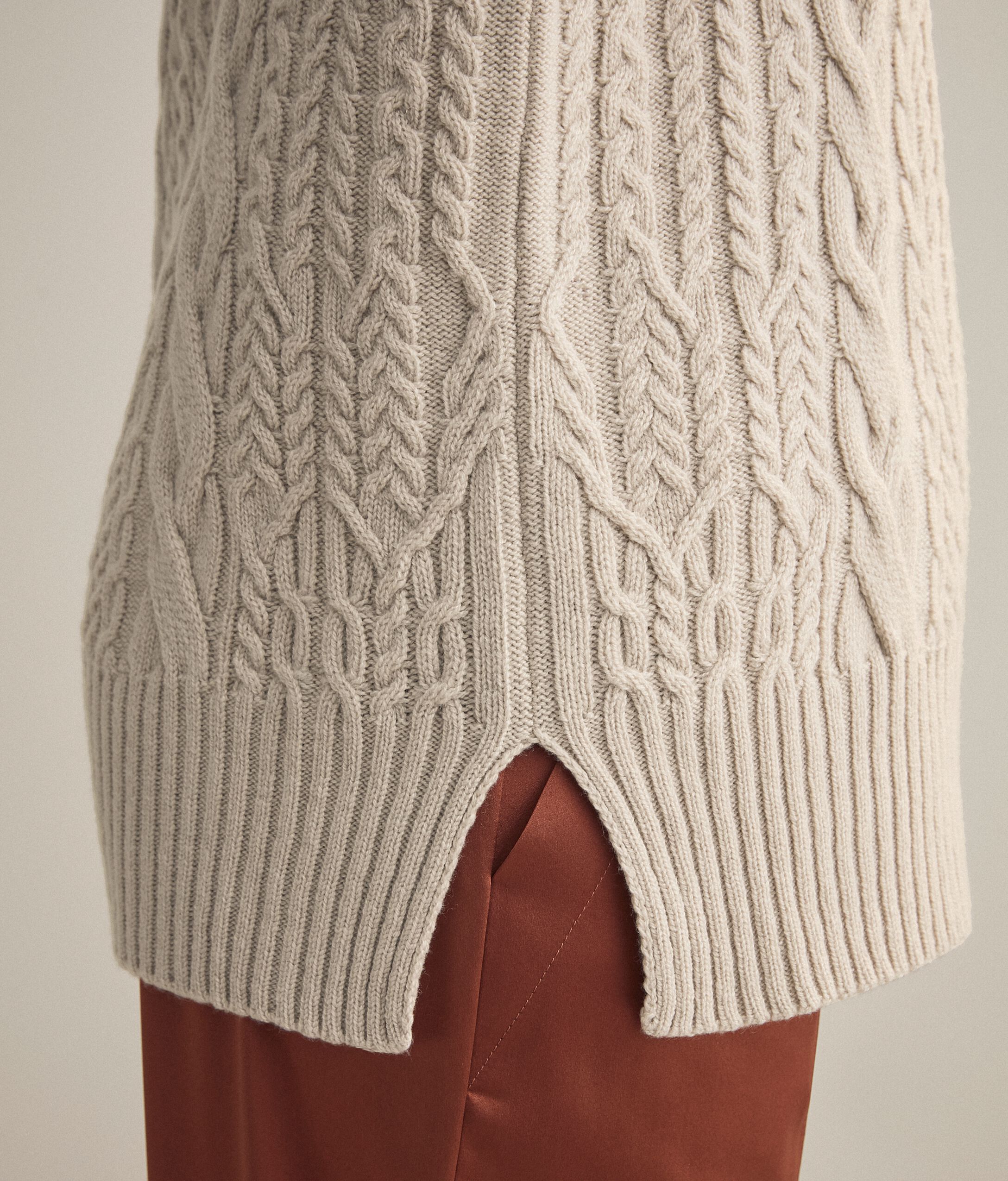 Dolcevita lungo realizzato in 100% Superior Cashmere con alti spacchi laterali, impreziosito da una lavorazione a treccia. Capo estremamente caldo, dalla vestibilità regolare. La modella è alta 179 cm e veste una taglia MPetto: 88cm / Vita: 67cm / Fianchi: 94cm