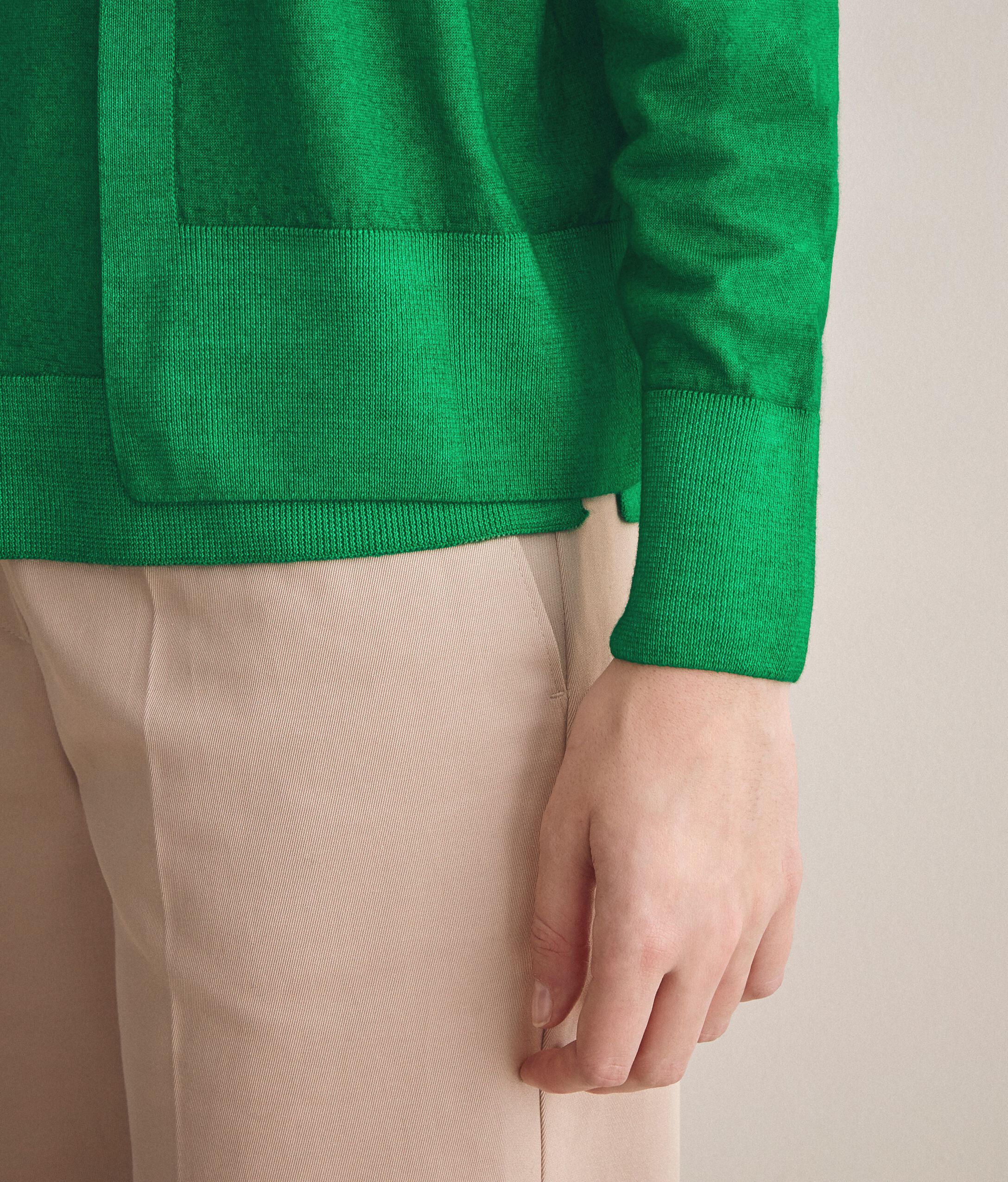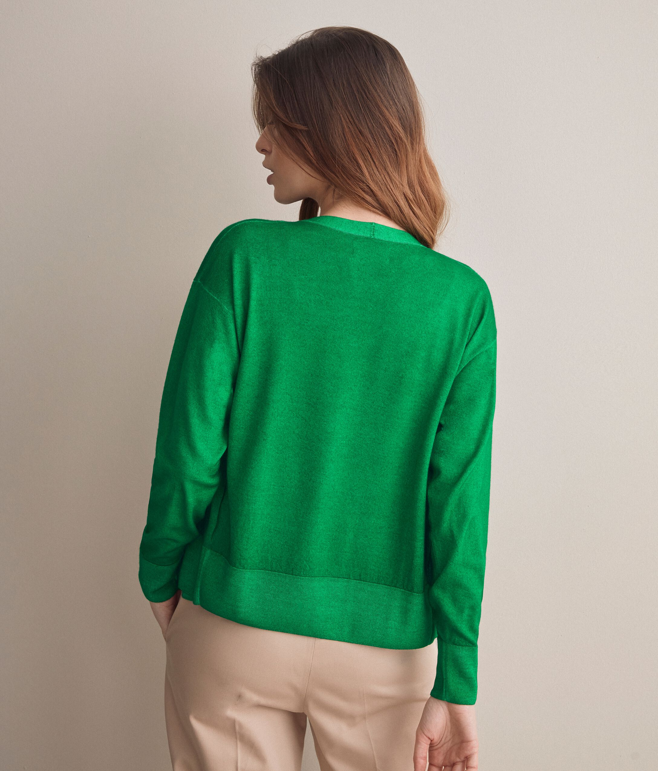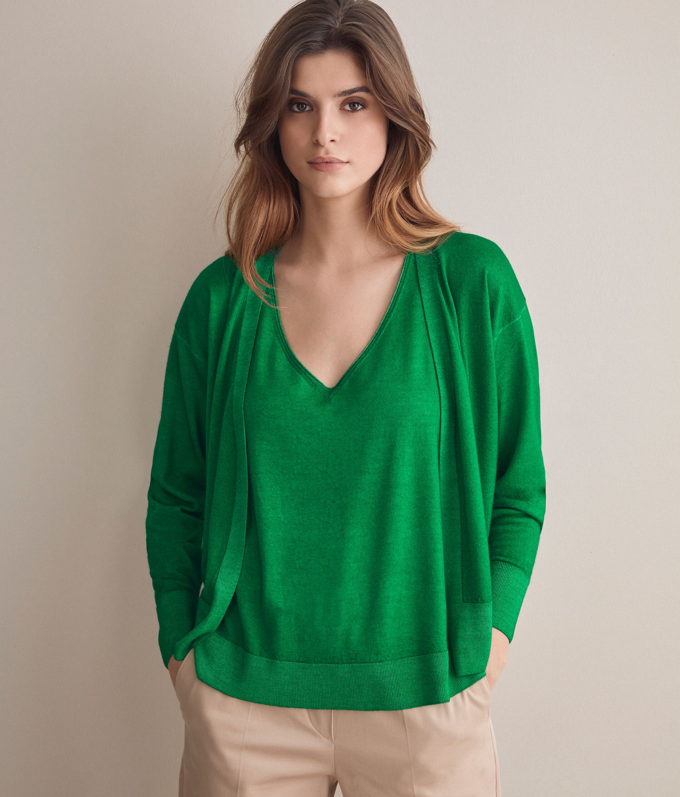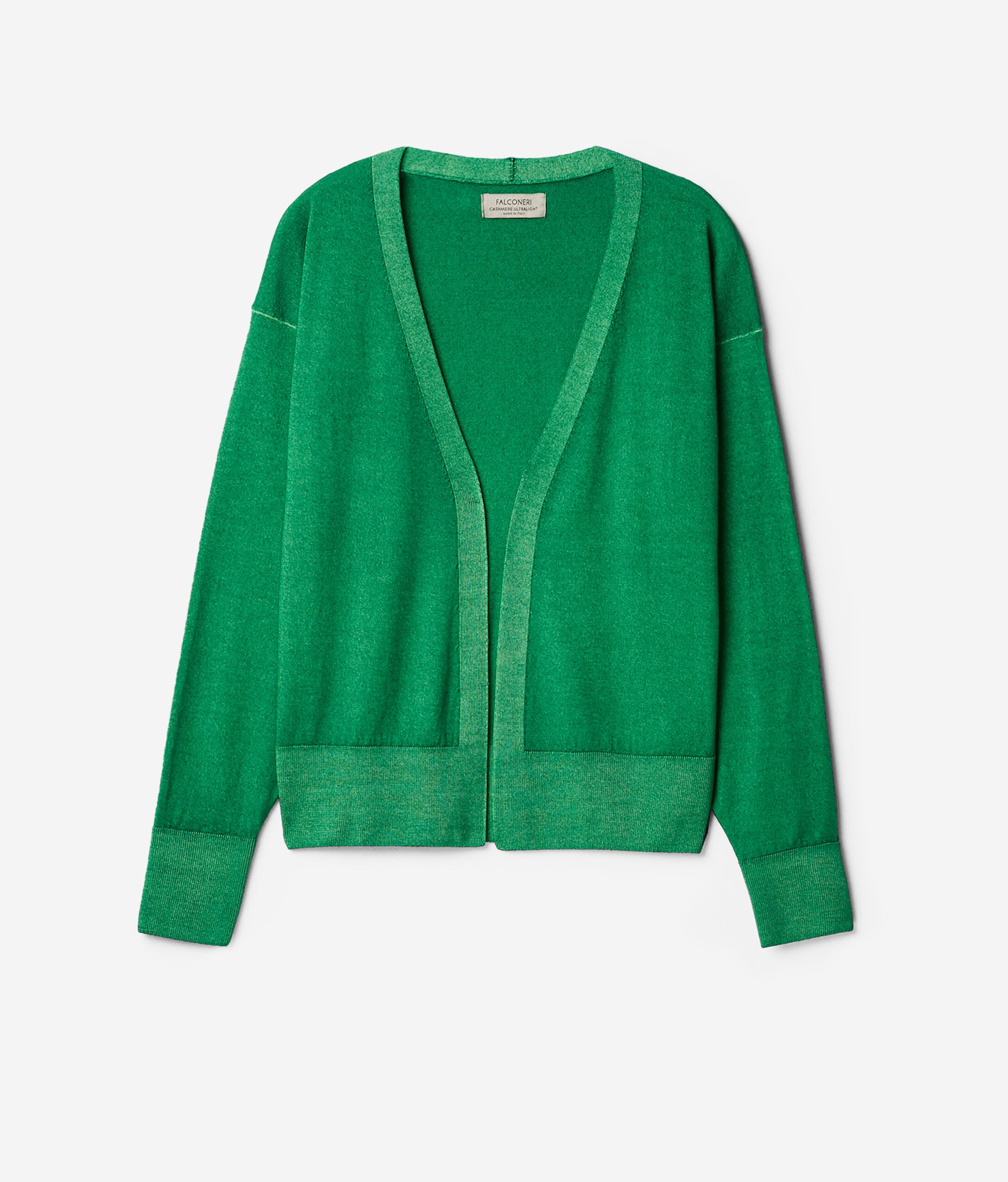 Una raffinata combinazione di classico e contemporaneo percorre lo stile di tutta la collezione Falconeri, l'amore per i materiali pregiati e la cura dei dettagli si esprimono nella scelta di filati iconici come il puro cashmere ultrafine e nell'equilibrio di forme e volumi. Questo cardigan corto senza abbottonatura valorizza le linee fluide e spontanee ed enfatizza un'immagine dinamica e fresca. Il bordo al fondo è definito da una costa alta, le maniche offrono volumi morbidi e le spalle sono lievemente abbassate. Ideale se abbinato al top DMC250B. La modella è alta 179 cm e veste una taglia MPetto: 88cm / Vita: 67cm / Fianchi: 94cm