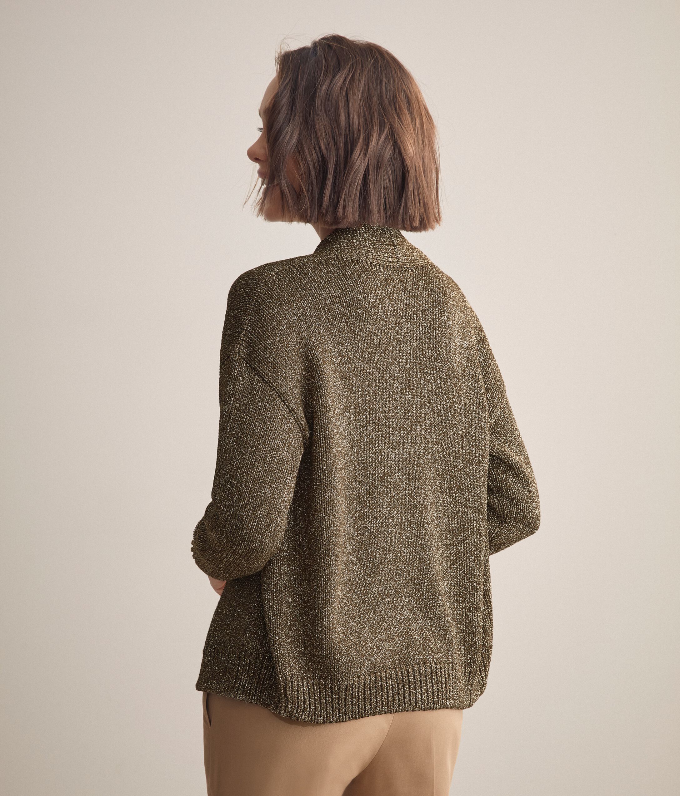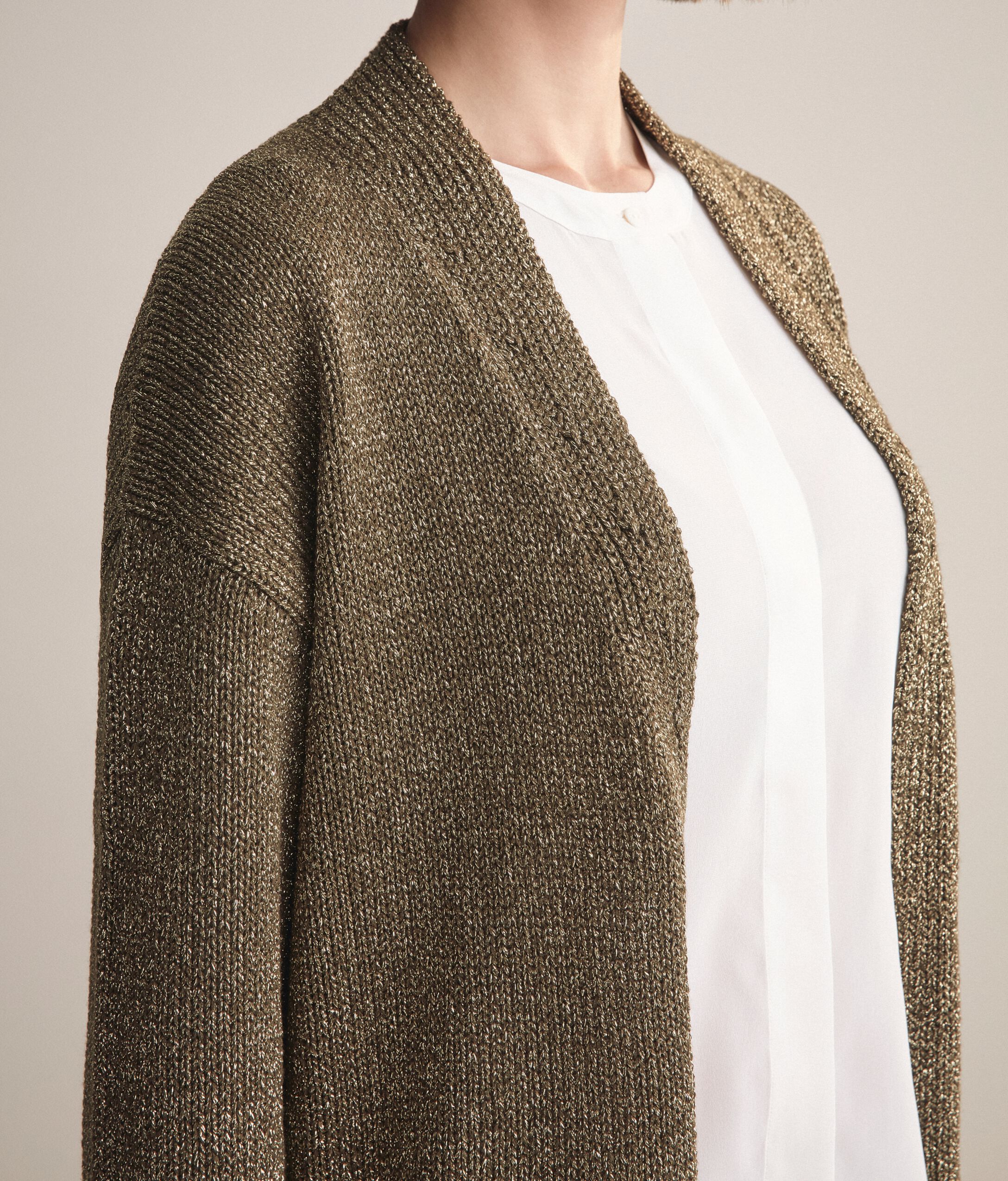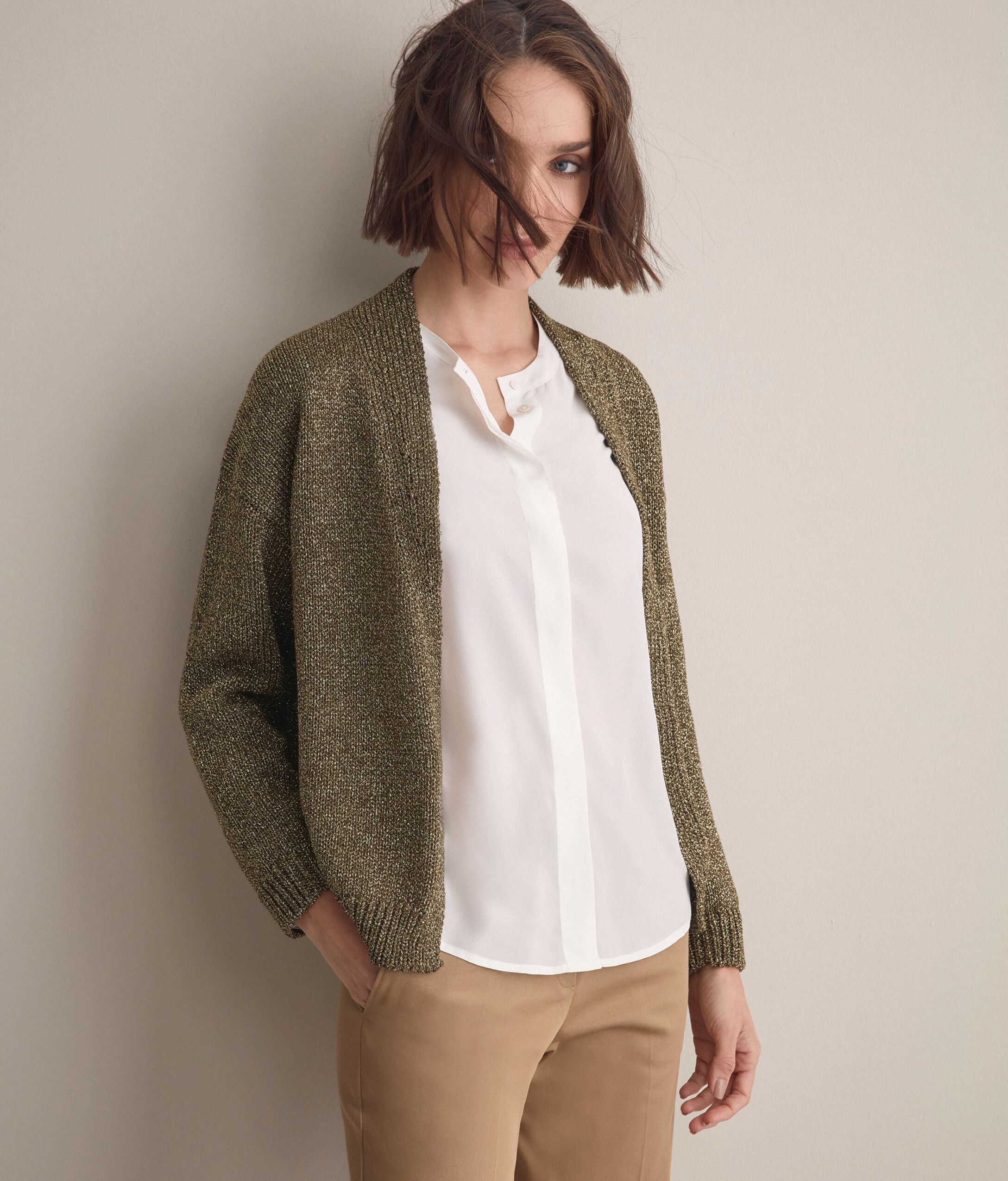 Luce e stile per questo esclusivo cardigan corto a scialle, interamente realizzato in filato lamé che illumina di brillanti riflessi un look più innovativo. La vestibilità risulta rilassata e confortevole, le spalle sono abbassate e le maniche rifinite con bordino a coste sottili. La modella è alta 179 cm e veste una taglia MPetto: 88cm / Vita: 67cm / Fianchi: 94cm