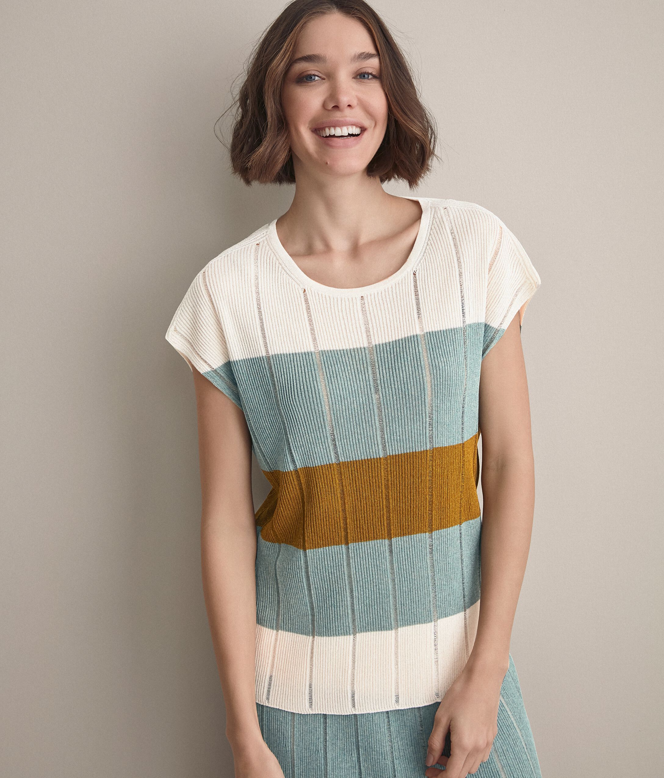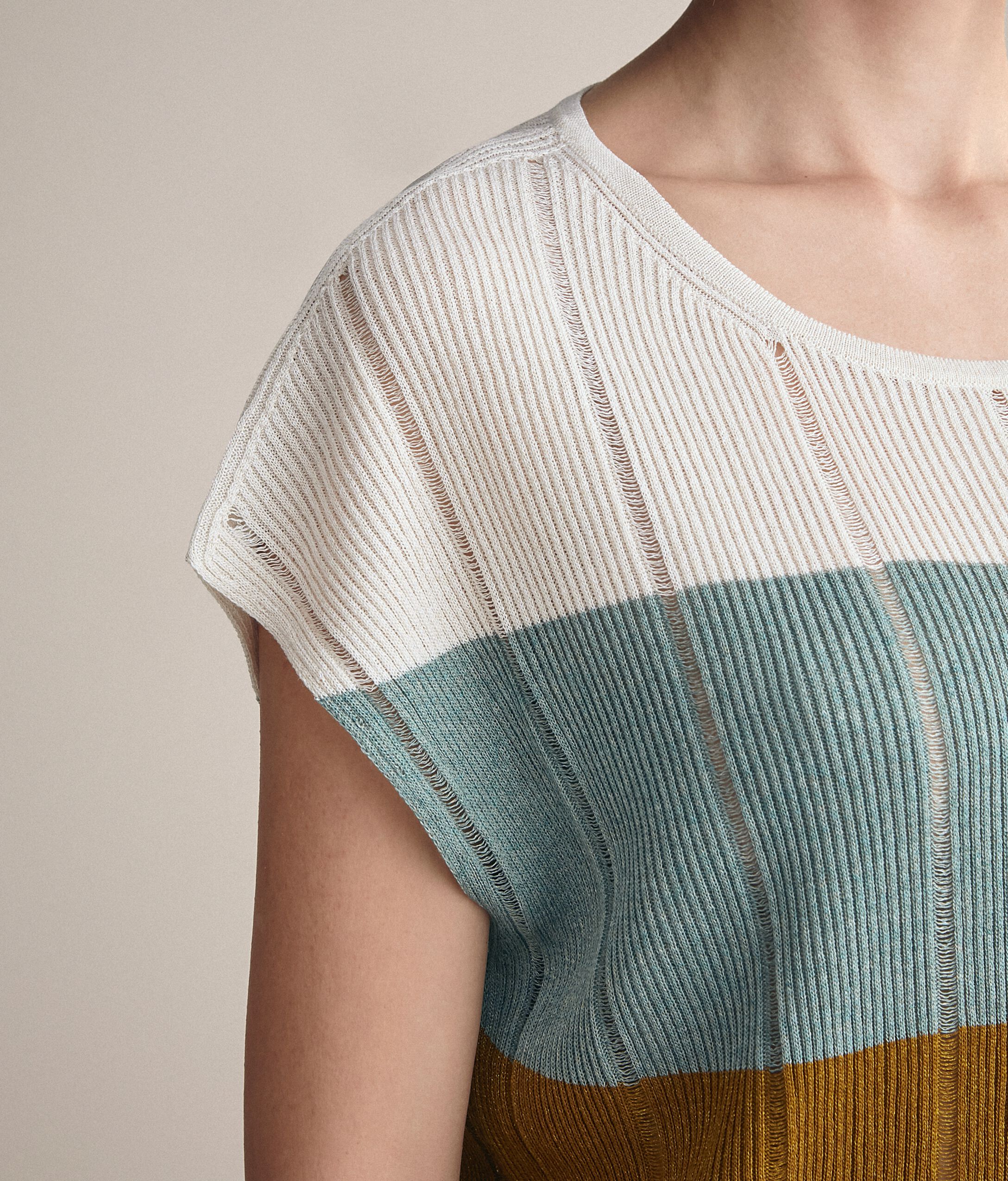 L'incontro tra pregiati materiali e lavorazioni innovative reinterpretano il gusto della maglieria Falconeri e danno vita a uno stile raffinato ed unico. La nuova maglia con scollo a barchetta e maniche a kimono in filato di viscosa lucida offre una lavorazione di fili flottanti a righe che disegna una silhouette femminile e raffinata. Ideale se abbinata alla gonna lunga DGL455A per un look effetto abito. La modella è alta 179 cm e veste una taglia MPetto: 88cm / Vita: 67cm / Fianchi: 94cm