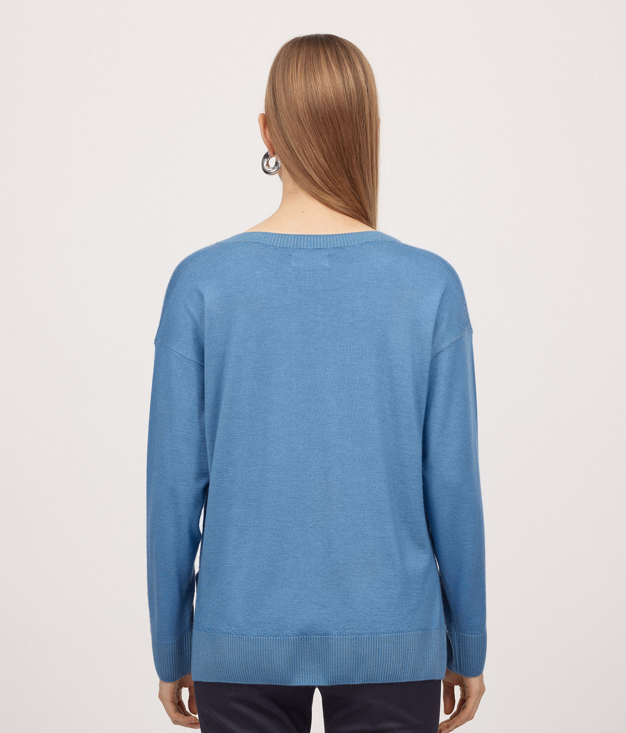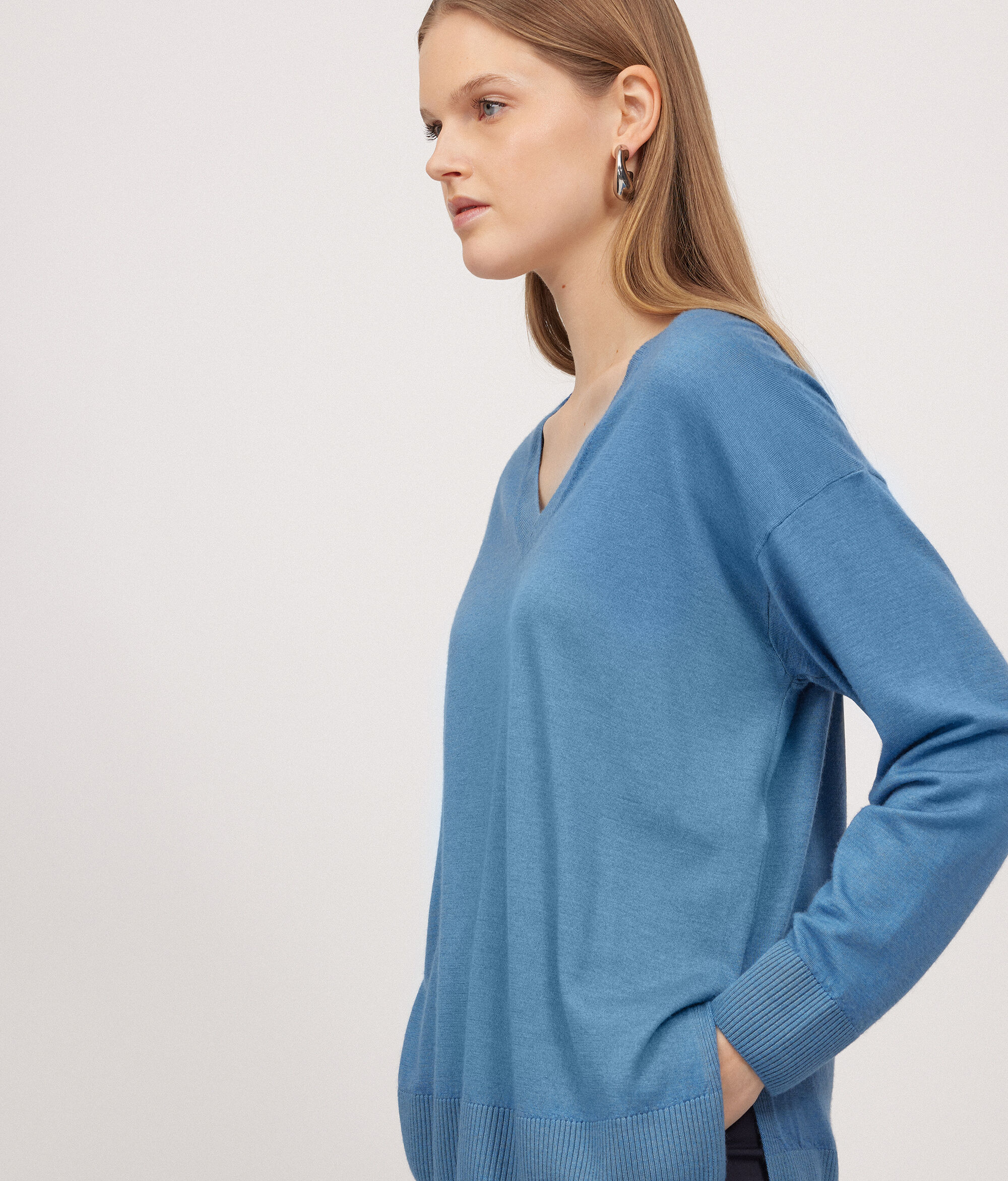 La maglia a scollo a V realizzata in cashmere ultrafine è un modello a manica lunga che si caratterizza da una lavorazione a costina sullo scollo, sui polsi e sul fondo. La sua peculiarità sono gli spacchi laterali. Le spalle sono leggermente scese e sua vestibilità è morbida.