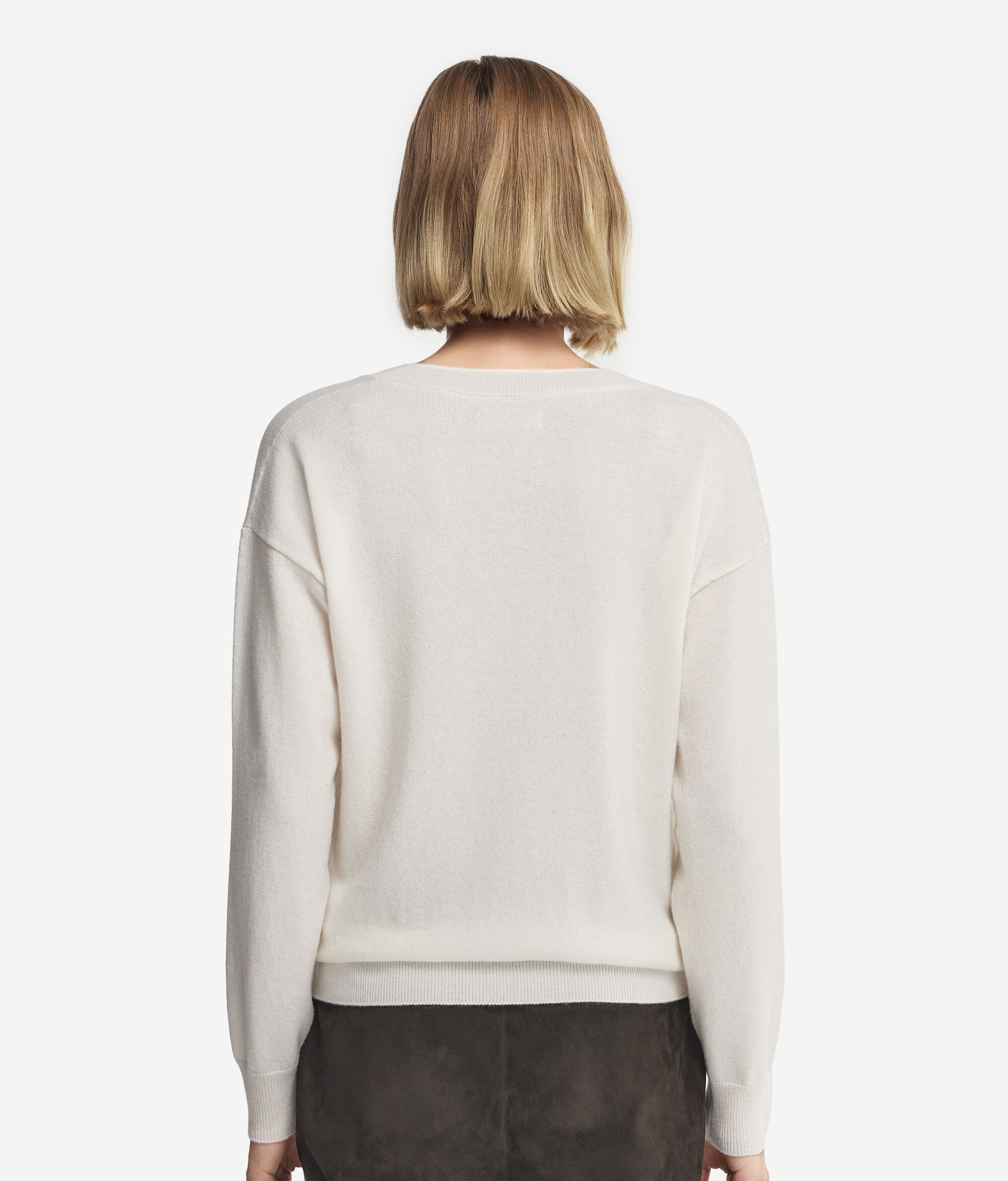 Realizzata in soffice Cashmere Ultrasoft, questa maglia dallo scollo a V diventerà il pezzo chiave del tuo guardaroba durante le giornate più fresche. Il bordo, i polsini e lo scollo sono impreziositi da una lavorazione a costine che aggiunge un tocco di raffinatezza. Le spalle scese e la sua vestibilità morbida conferiscono un fit rilassato e naturale che risponde ad uno stile attuale e contemporaneo.