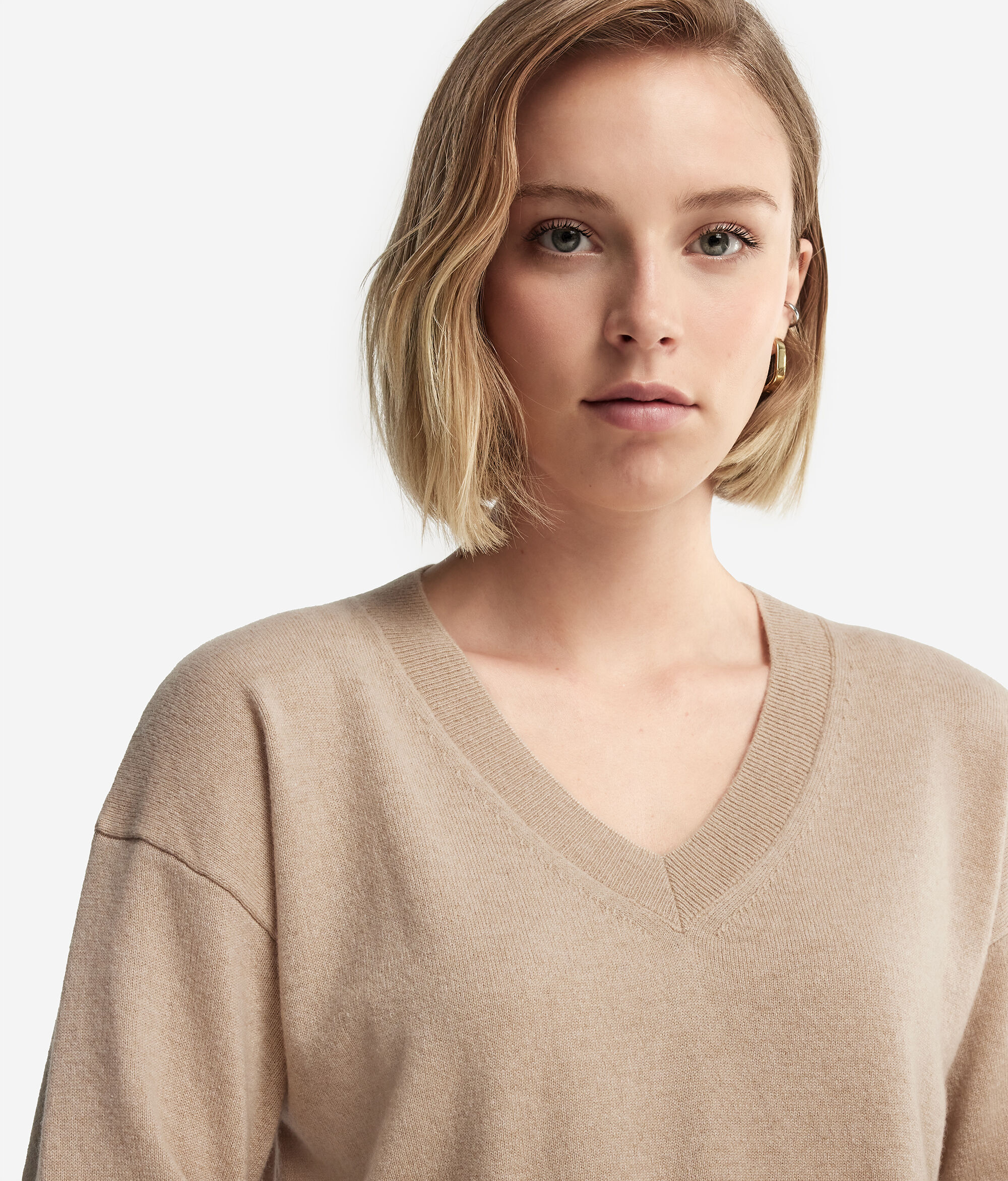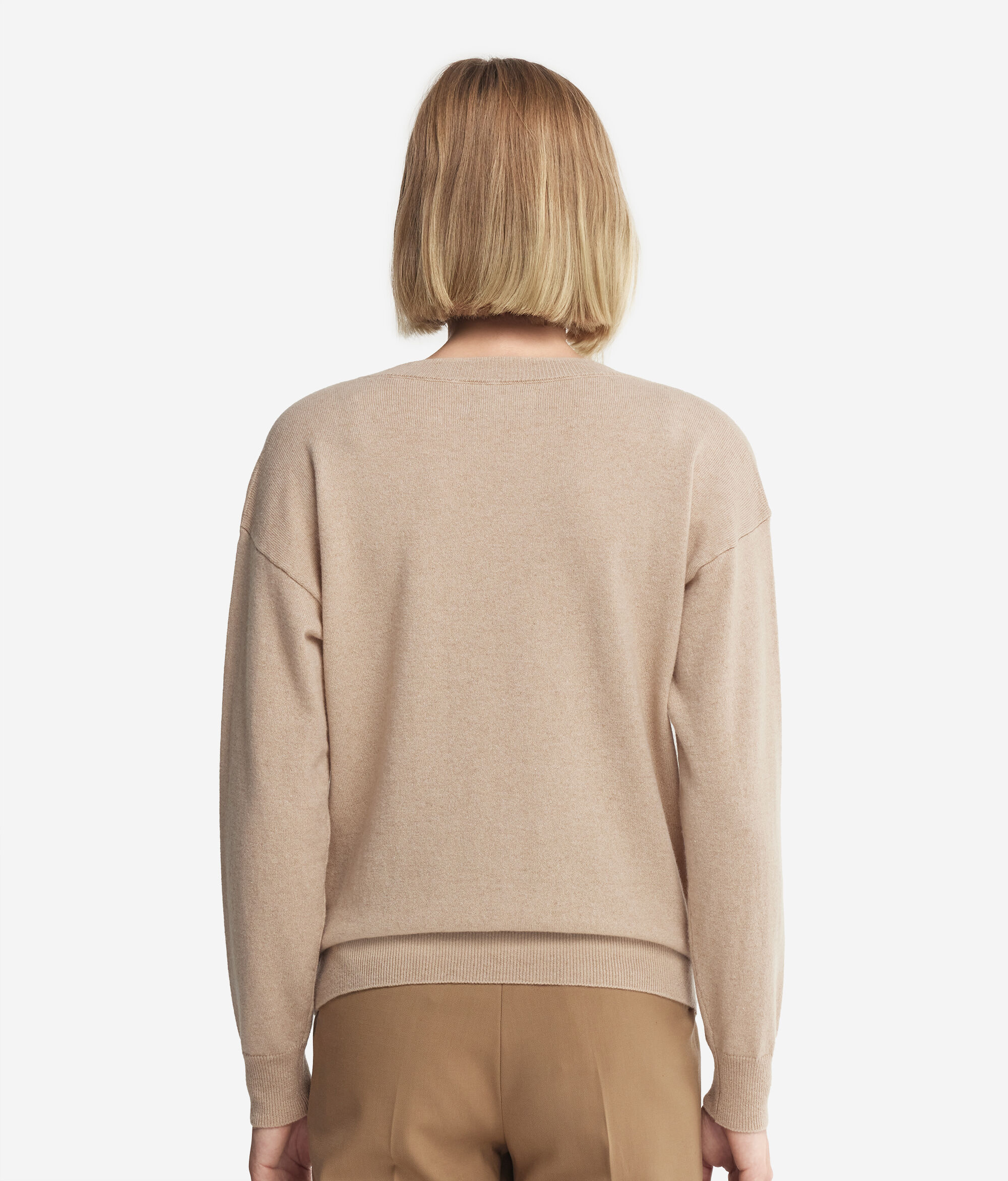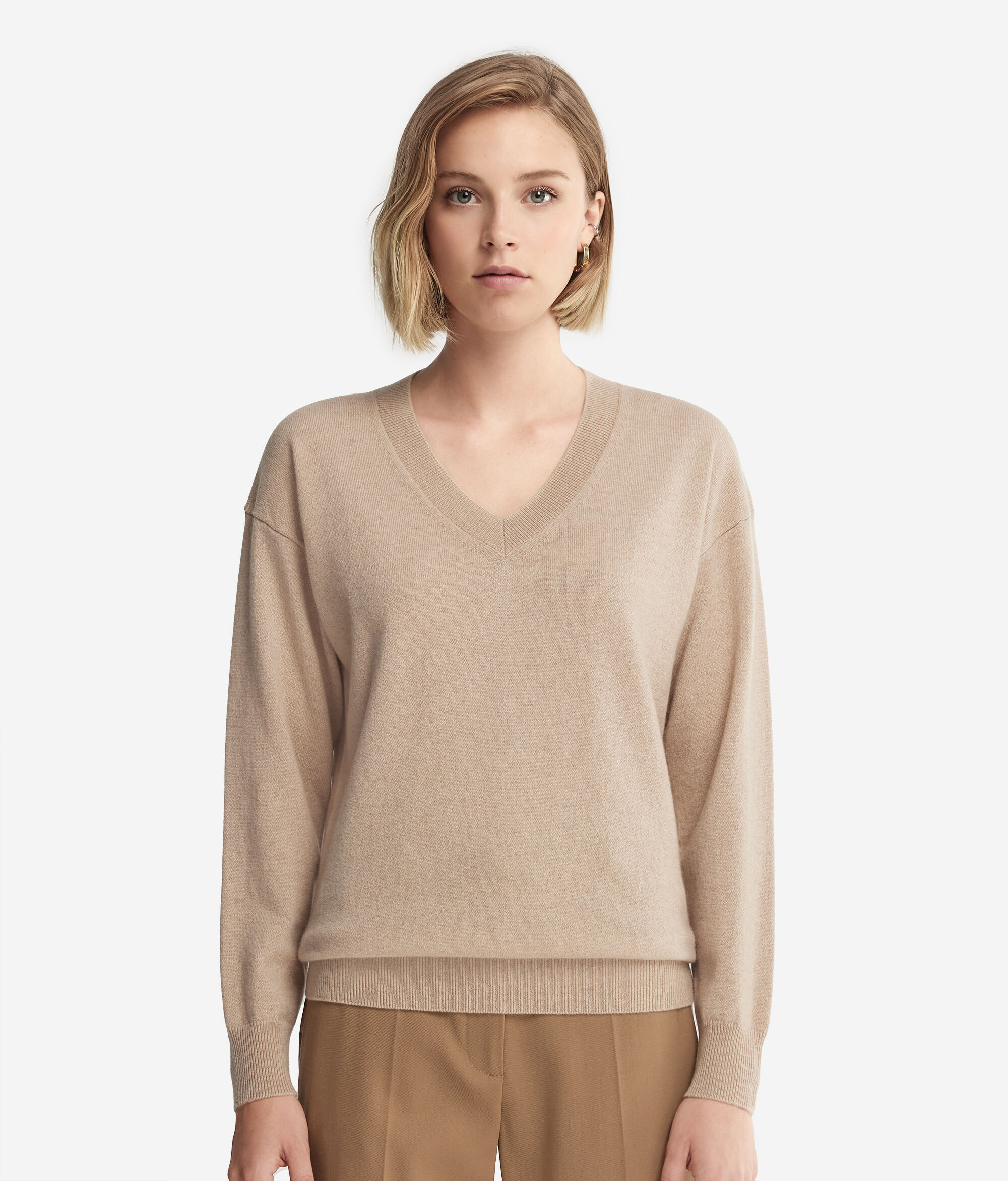 Realizzata in soffice Cashmere Ultrasoft, questa maglia dallo scollo a V diventerà il pezzo chiave del tuo guardaroba durante le giornate più fresche. Il bordo, i polsini e lo scollo sono impreziositi da una lavorazione a costine che aggiunge un tocco di raffinatezza. Le spalle scese e la sua vestibilità morbida conferiscono un fit rilassato e naturale che risponde ad uno stile attuale e contemporaneo.