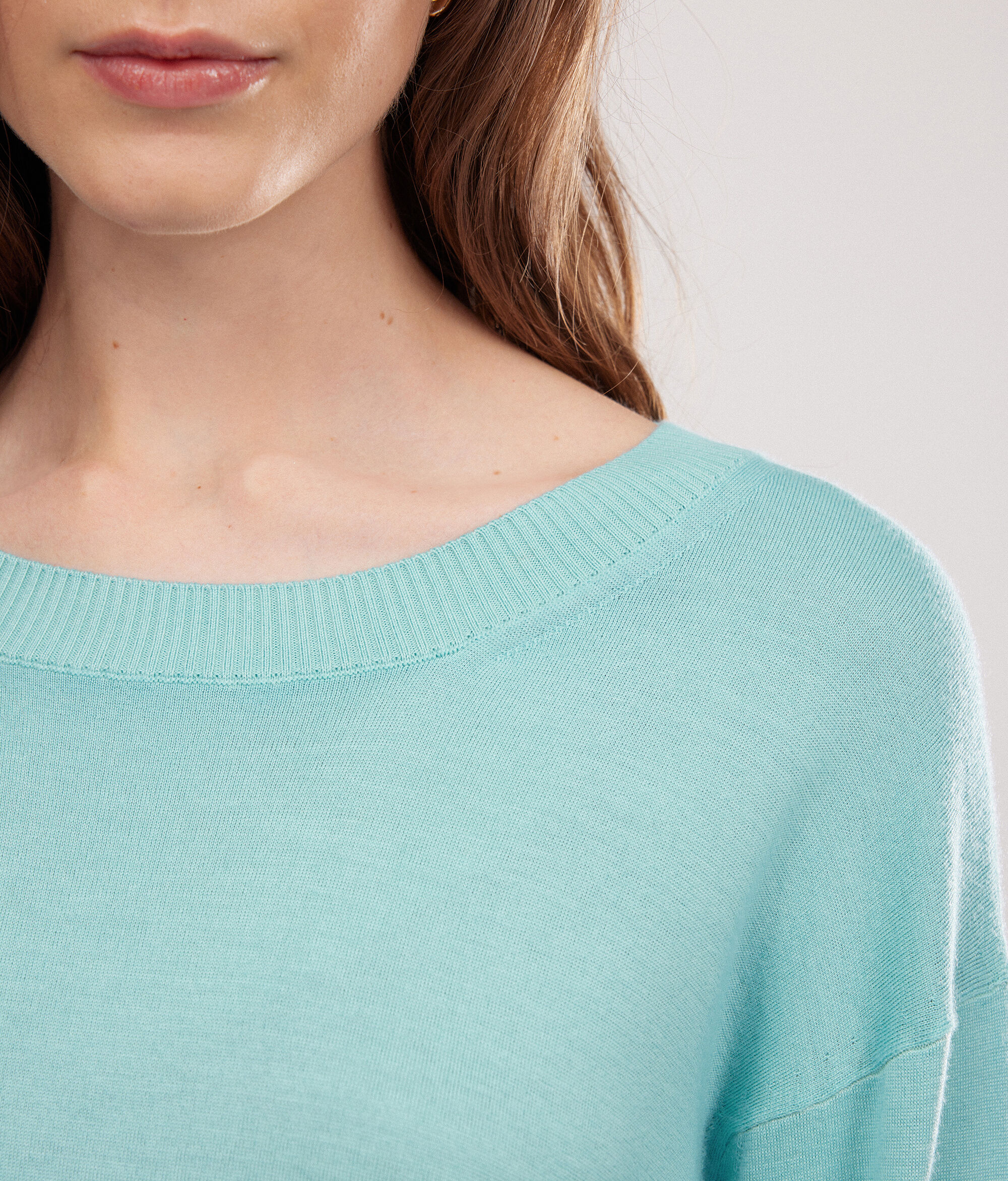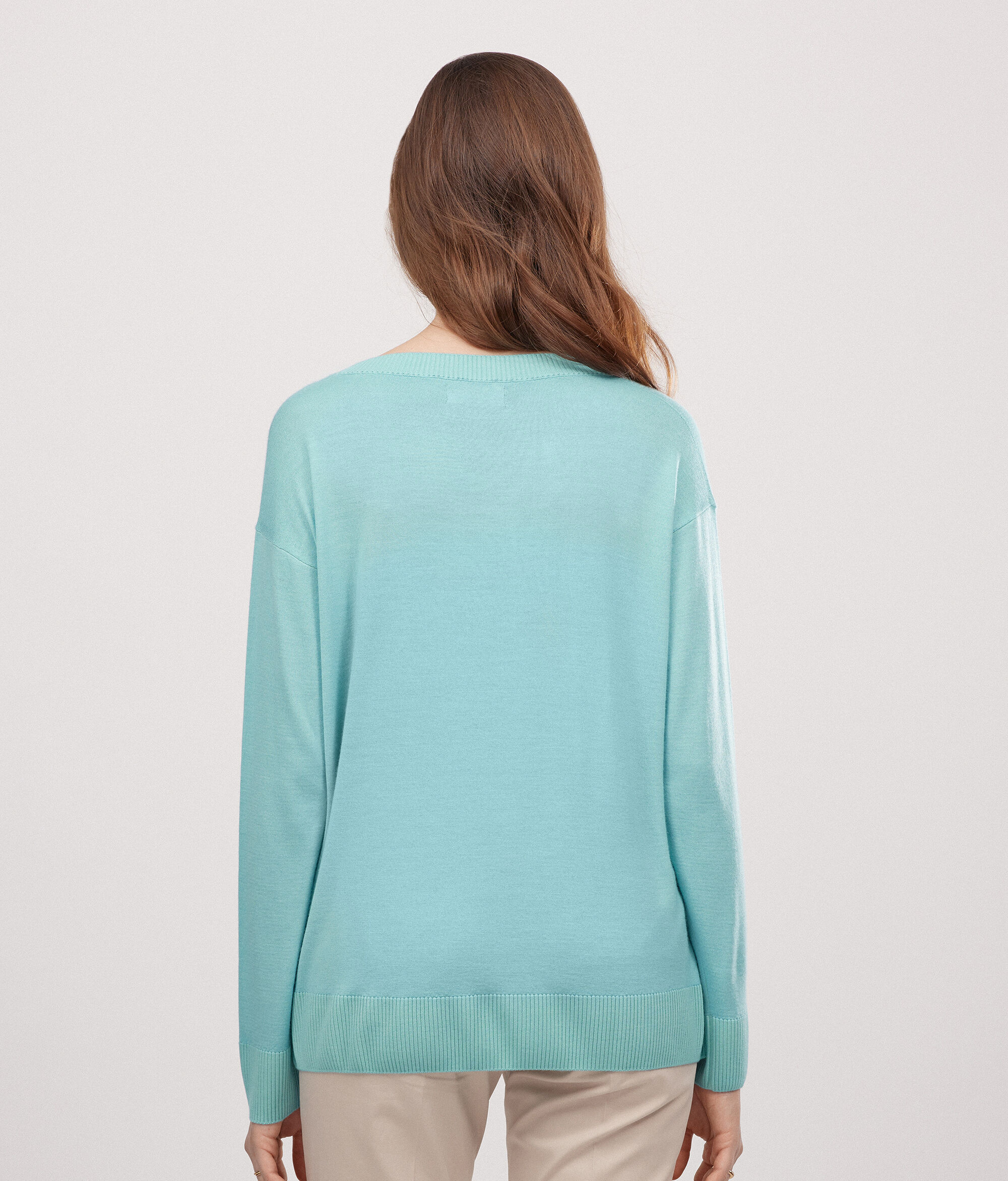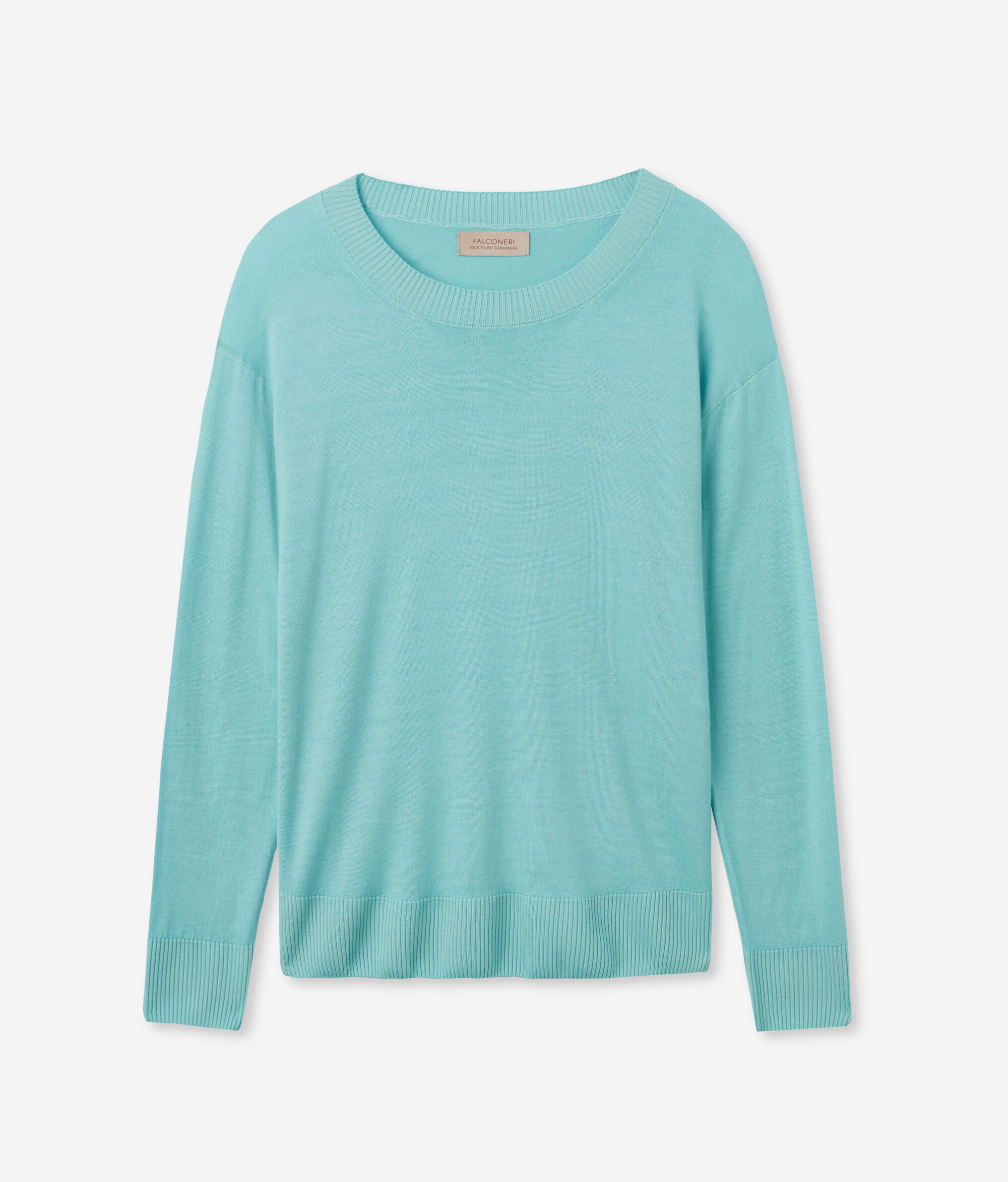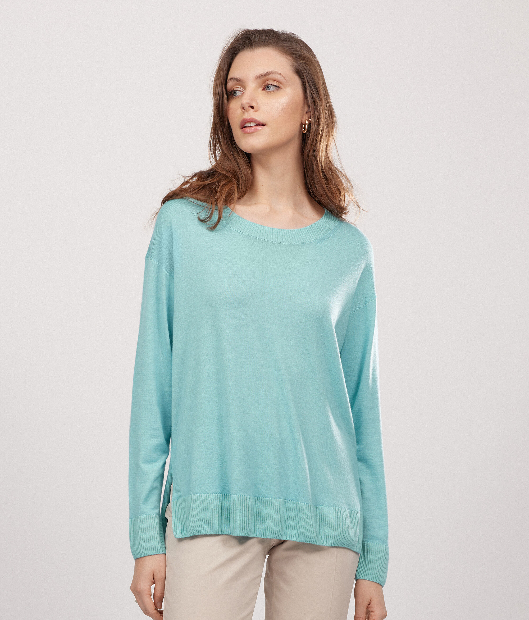 La maglia girocollo realizzata in cashmere ultrafine è un modello a manica lunga che si caratterizza da una lavorazione a costina sullo scollo, sui polsi e sul fondo. La sua peculiarità sono gli spacchi laterali. Le spalle sono leggermente scese e sua vestibilità è morbida.