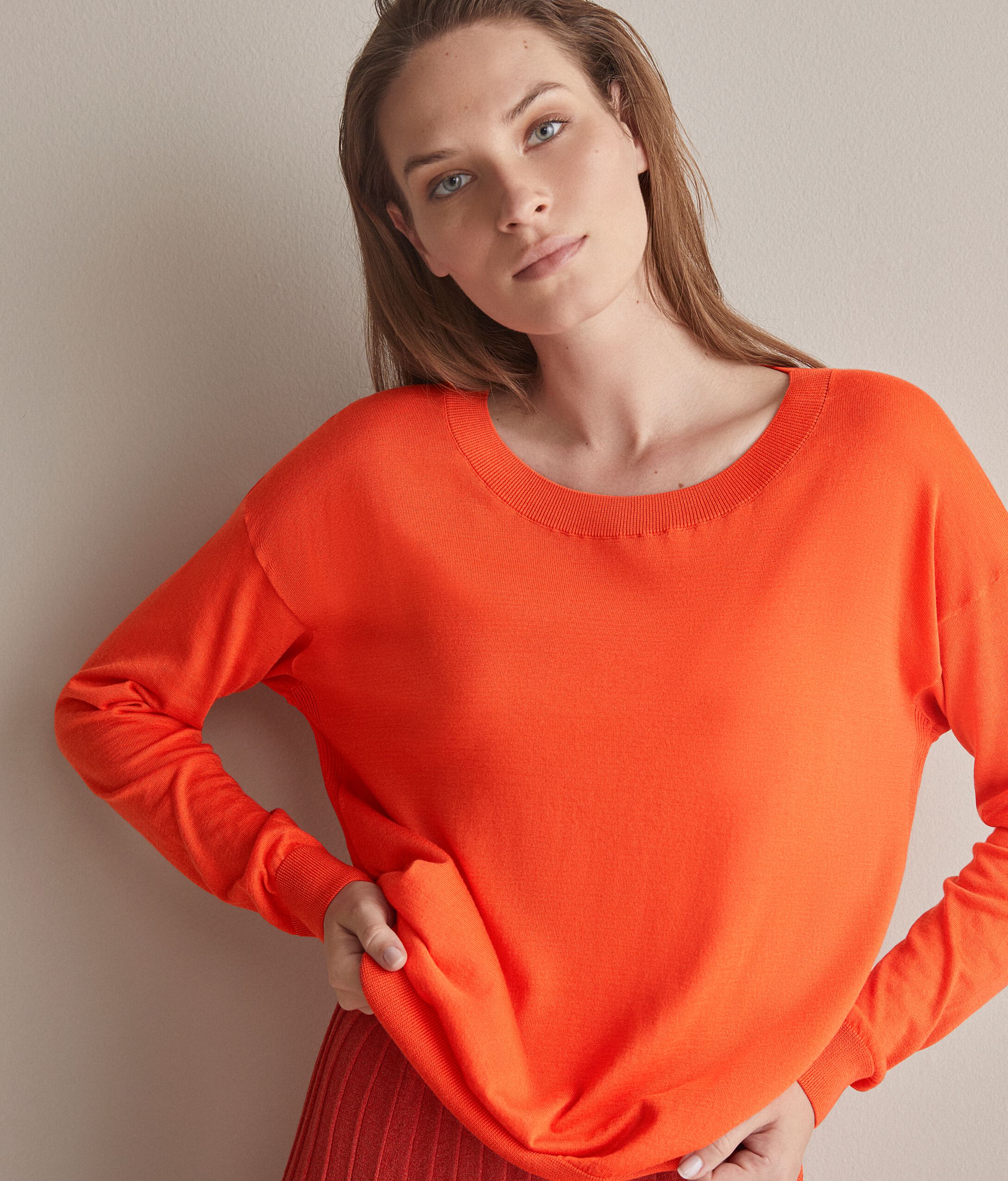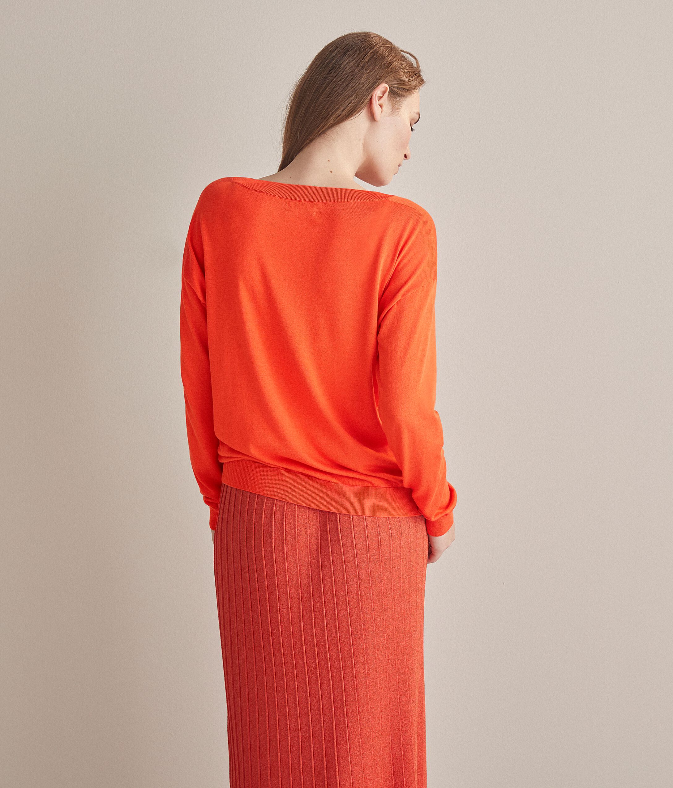 Il pregio della seta e del cotone impreziosisce le forme morbide di questa maglia con ampio girocollo e conferiscono alla texture una mano fluida e piacevole all'indosso. La versatilità d'uso la rende capo unico ed indispensabile perfetto su qualsiasi abbinamento.