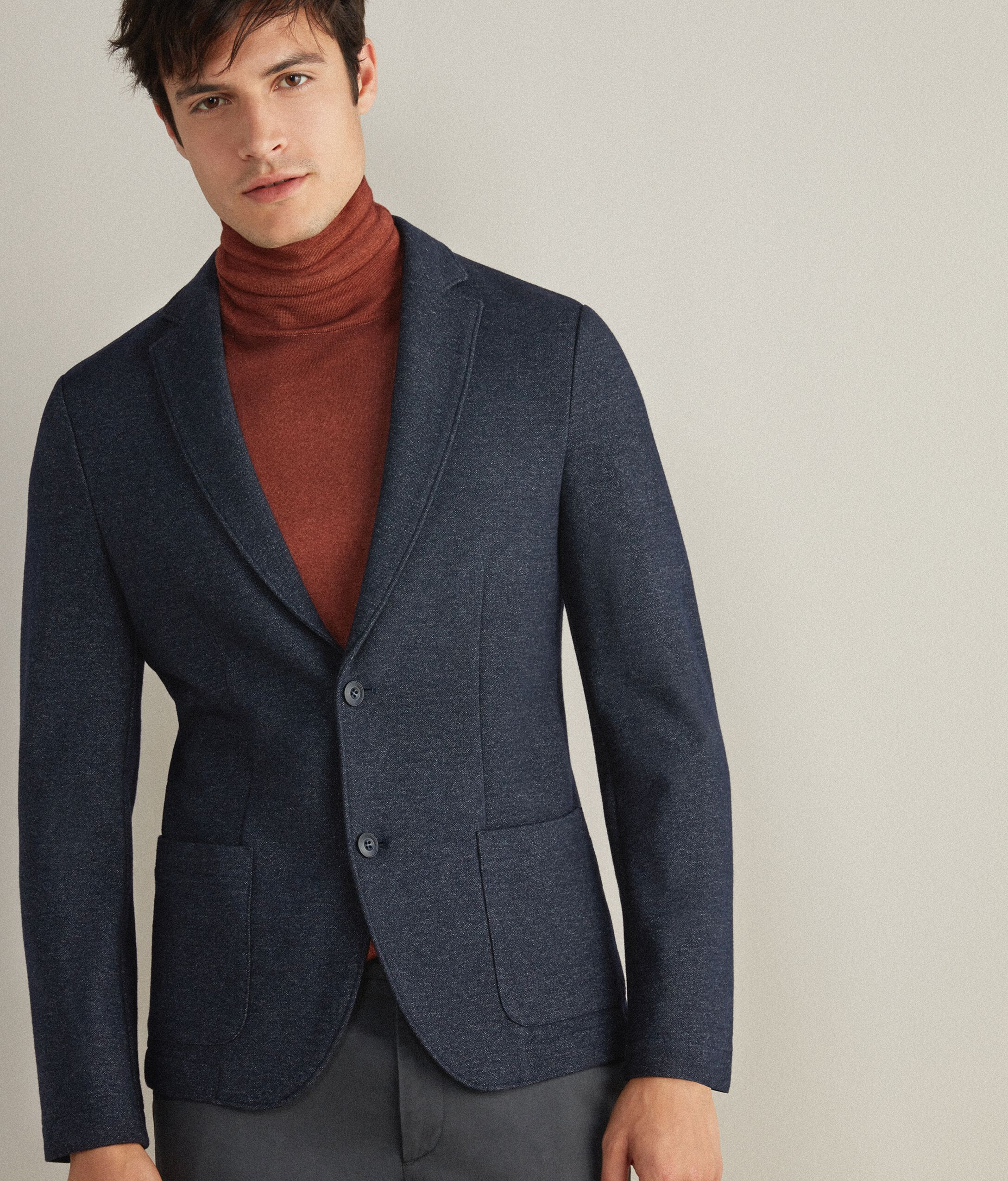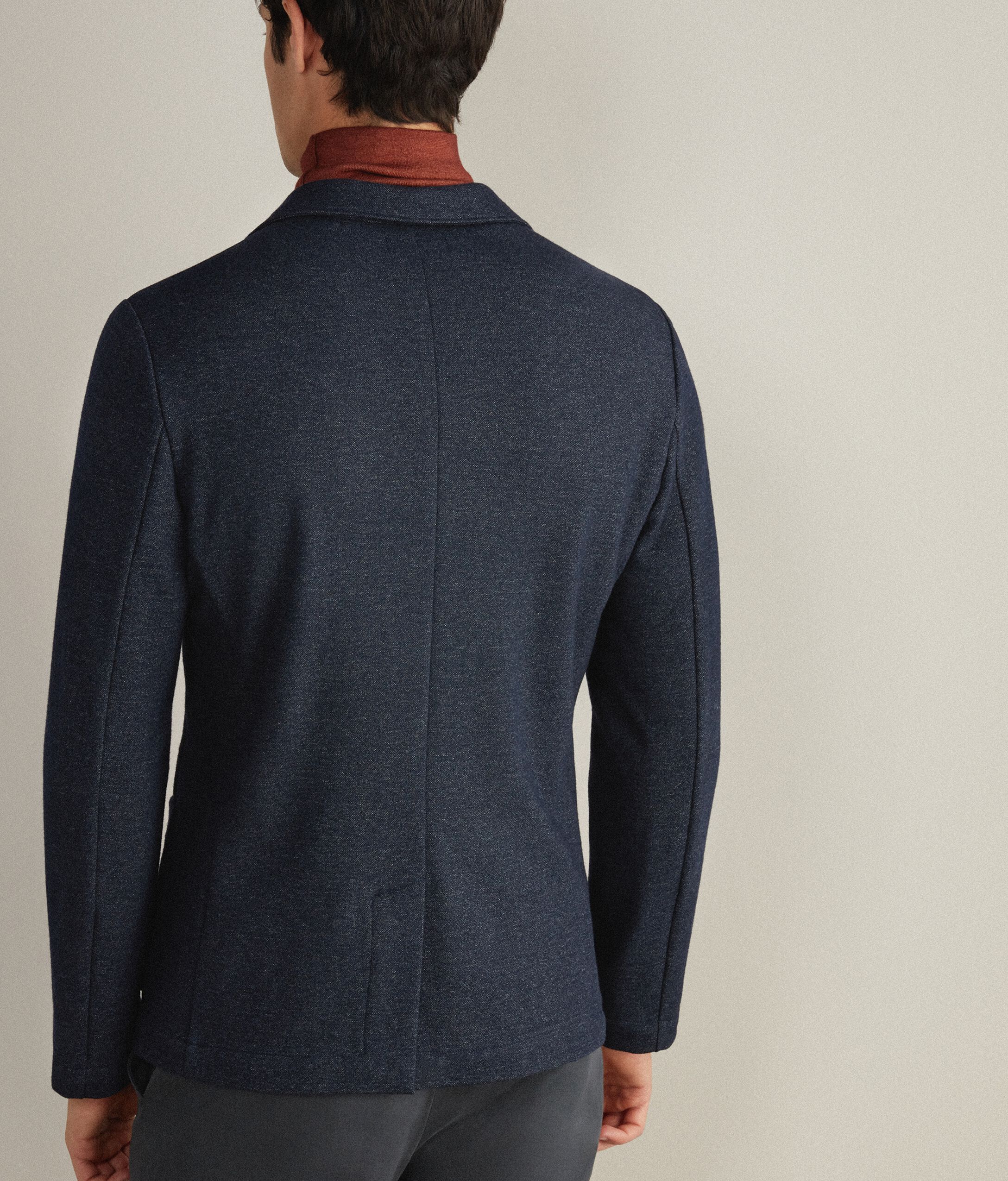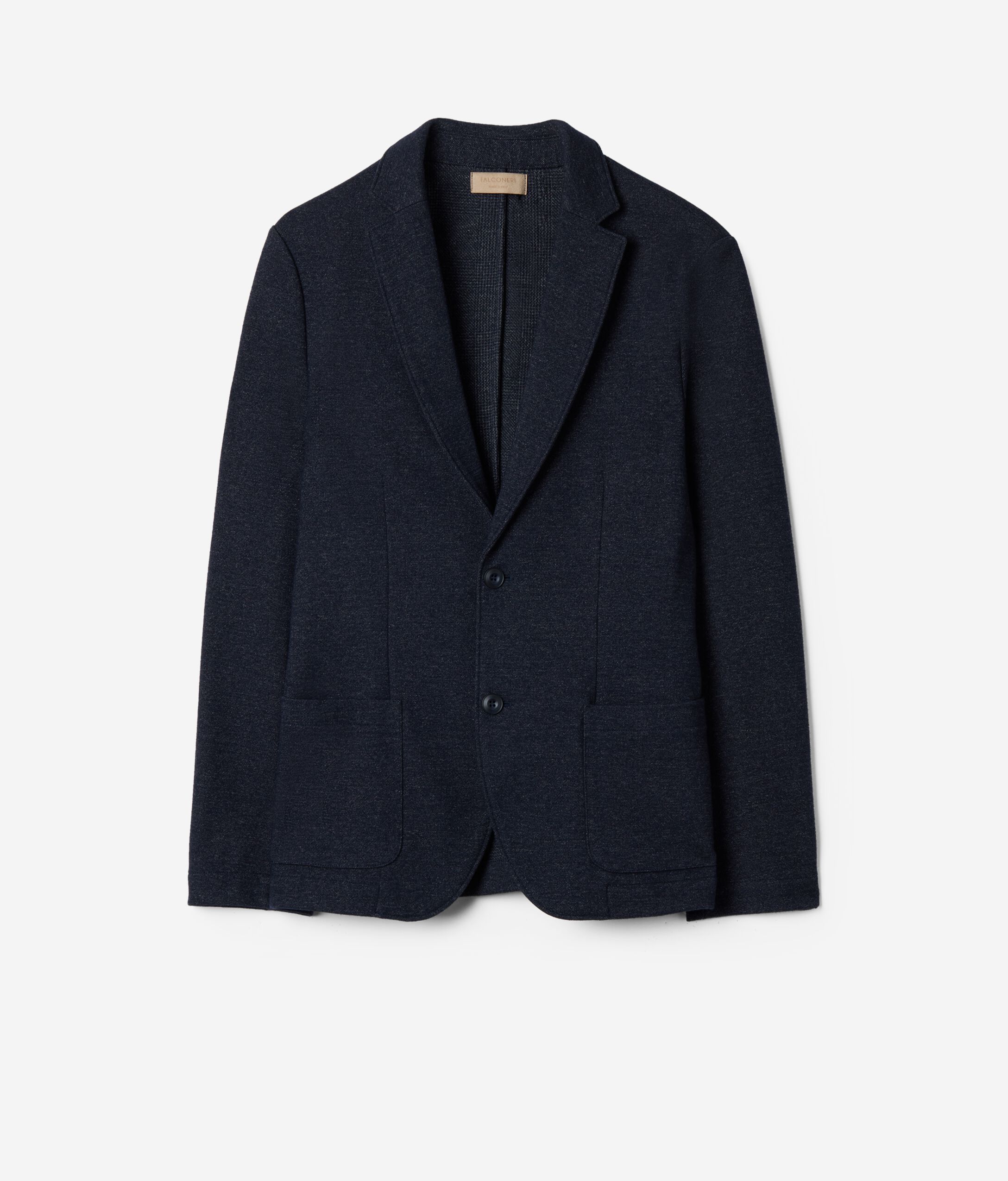 Giacca in jersey di lana jacquard con microfantasia puntinata, rifinita all'interno con fantasia check molto fusa nei colori. Tasche a toppa. Può essere indossata abbinandola con maglia dolcevita soft cashmere.