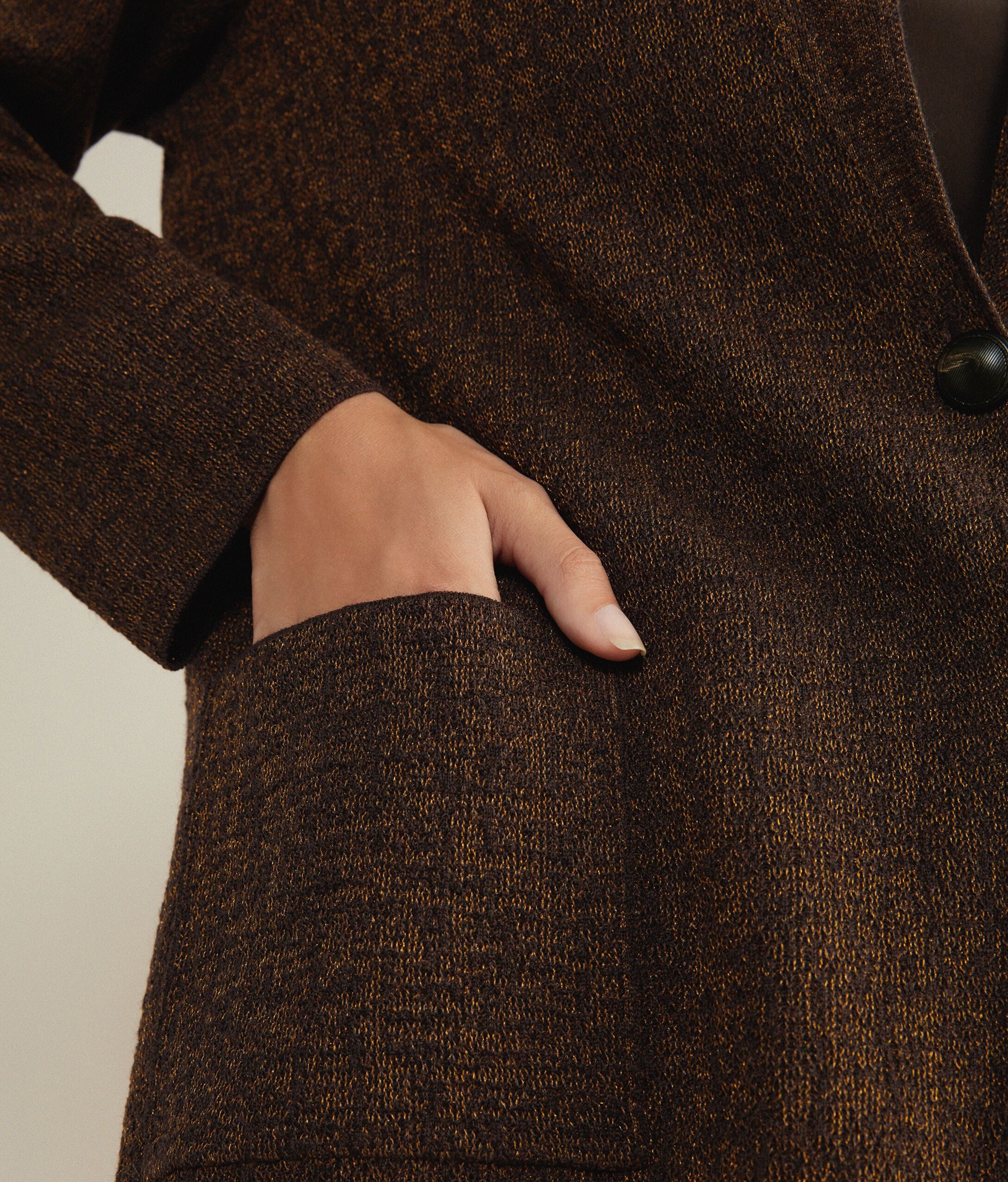 Giacca in maglia di lana e filato lucido con lavorazione jacquard effetto graffiato. Chiusura con bottone leggermente laterale e tasche applicate.