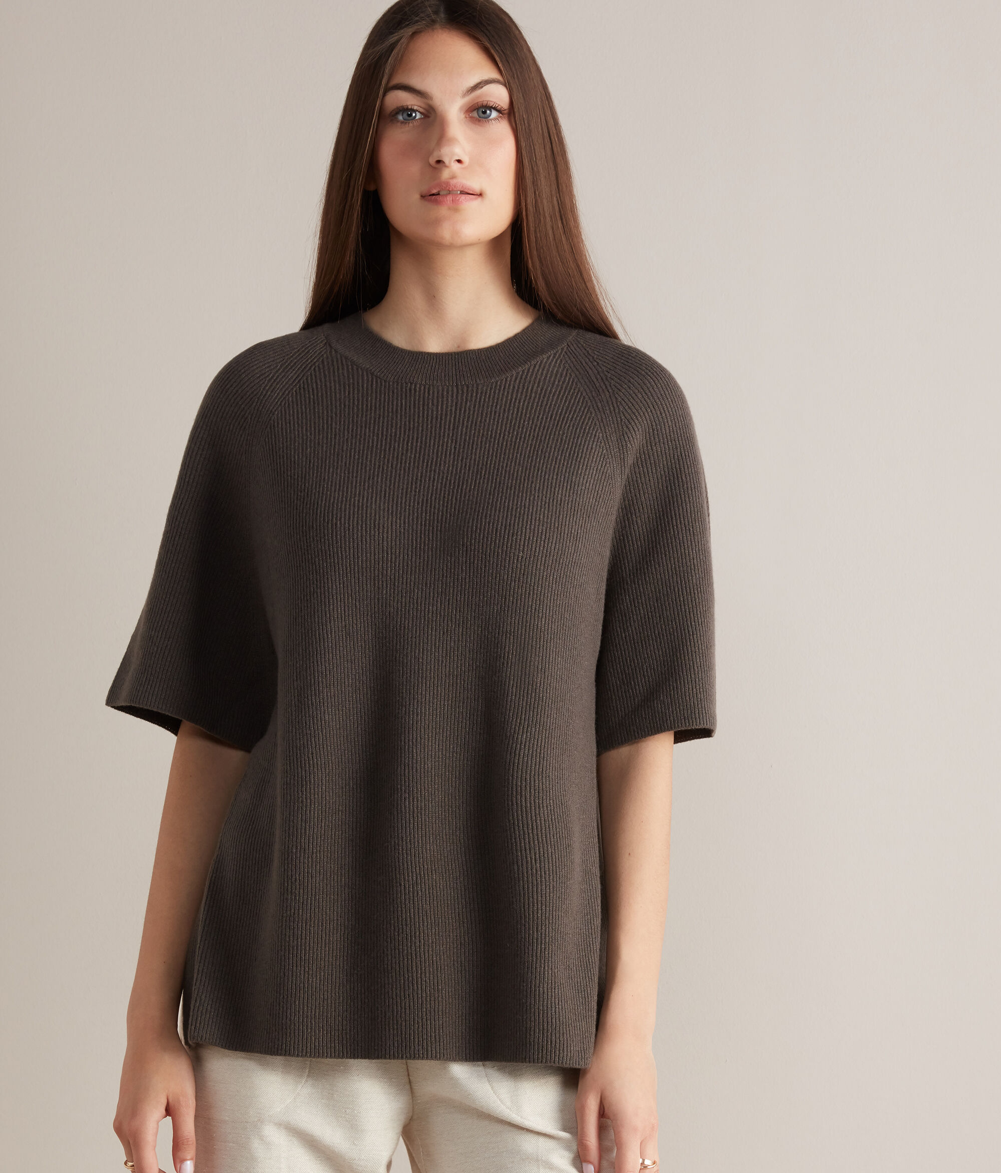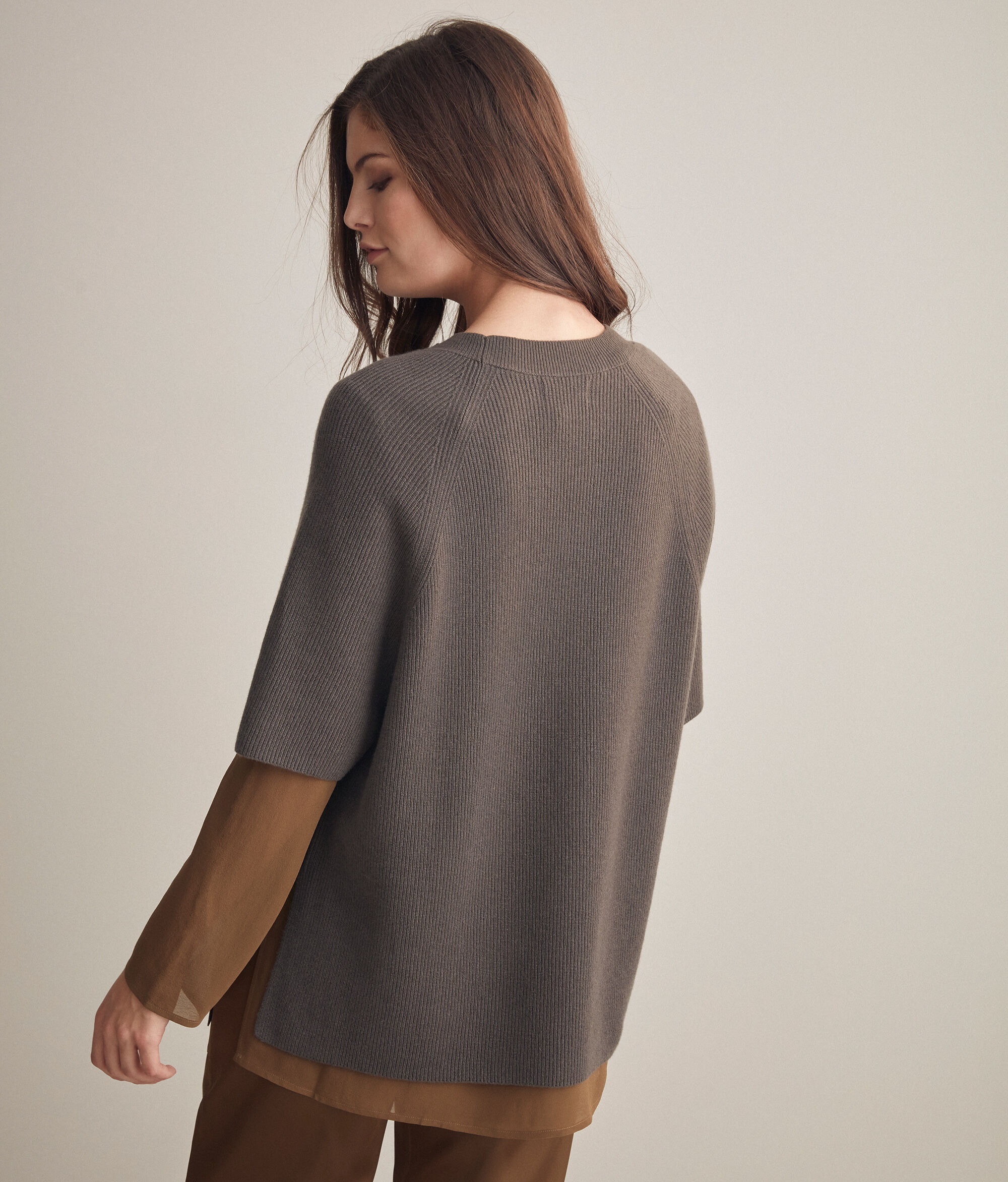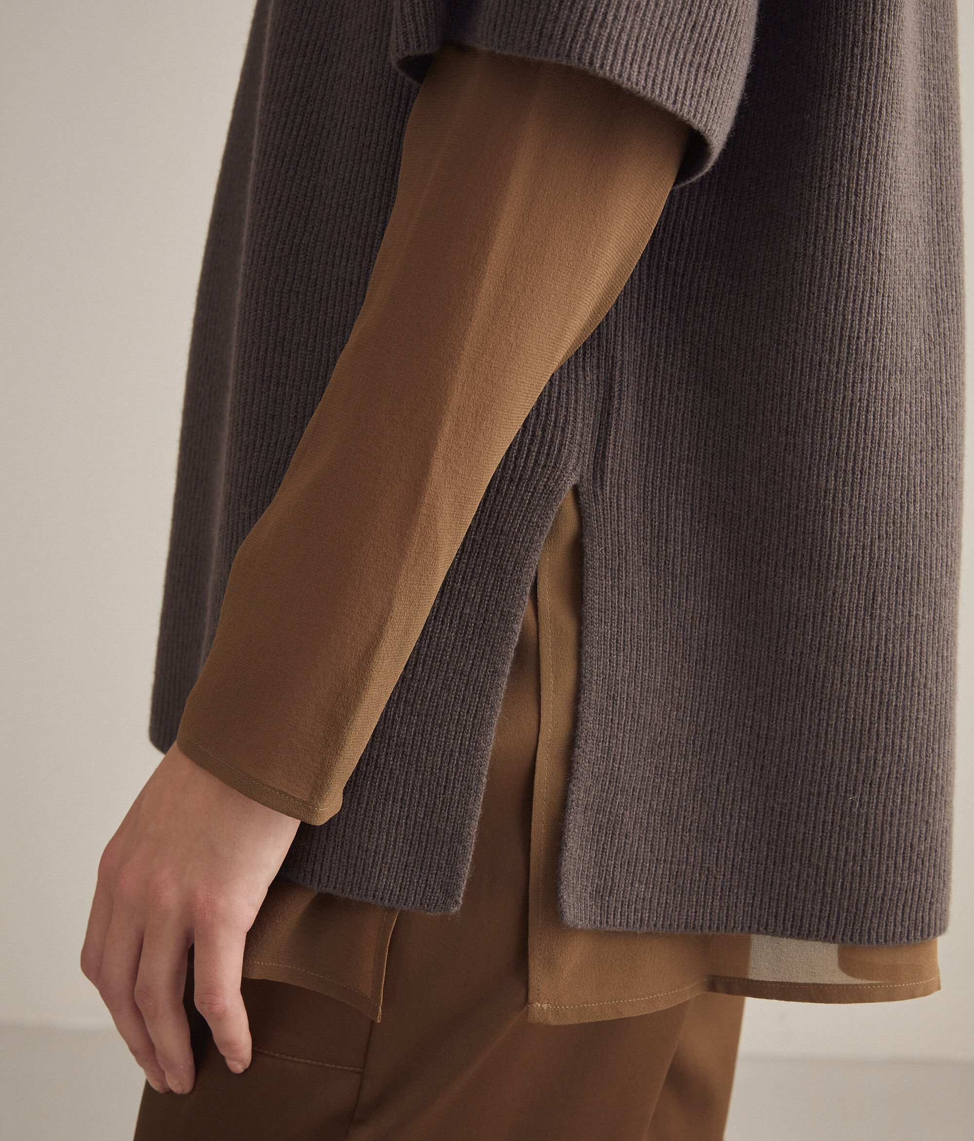 Maglia cappa girocollo realizzata in Superior Cashmere e impreziosita da lavorazione a costina con spacchi laterali. Capo caldo ed iconico dalla vestibilità morbida, utilizzabile sia come maglia che come cappa. La modella è alta 179 cm e veste una taglia MPetto: 88cm / Vita: 67cm / Fianchi: 94cm