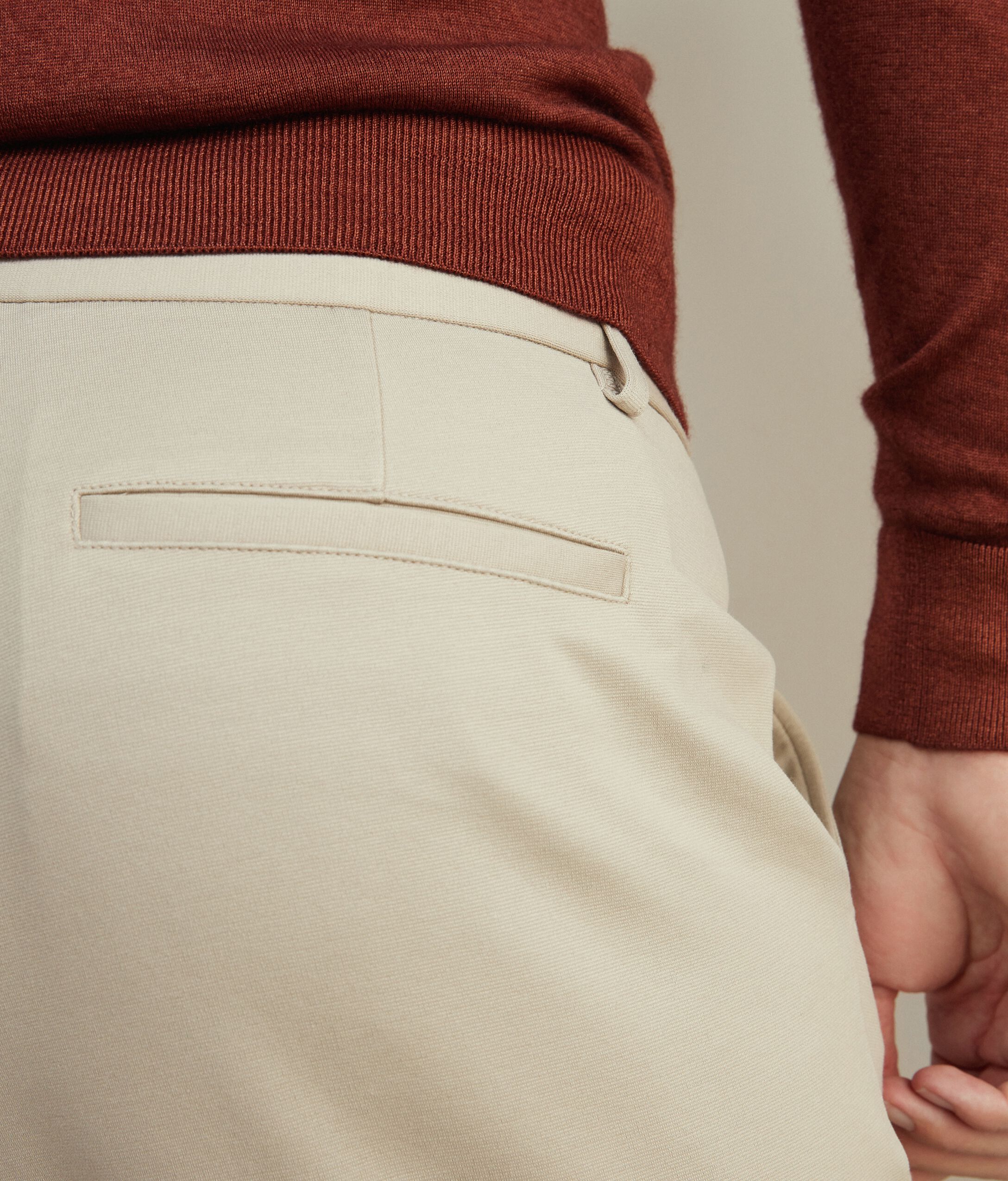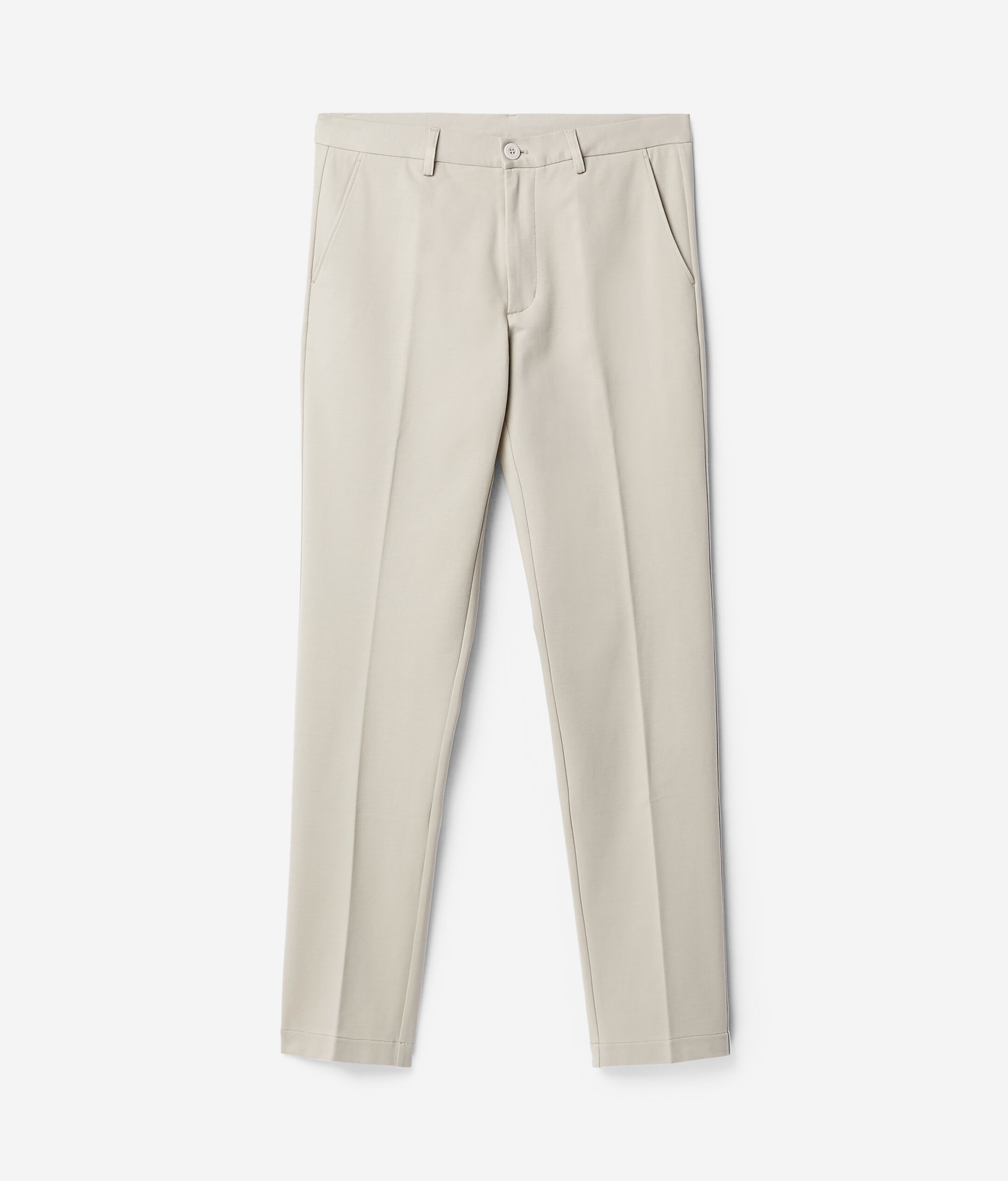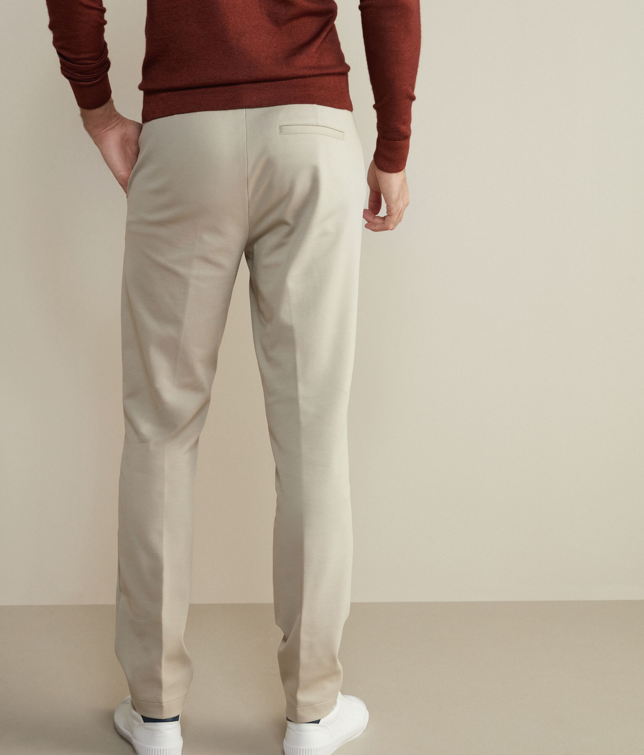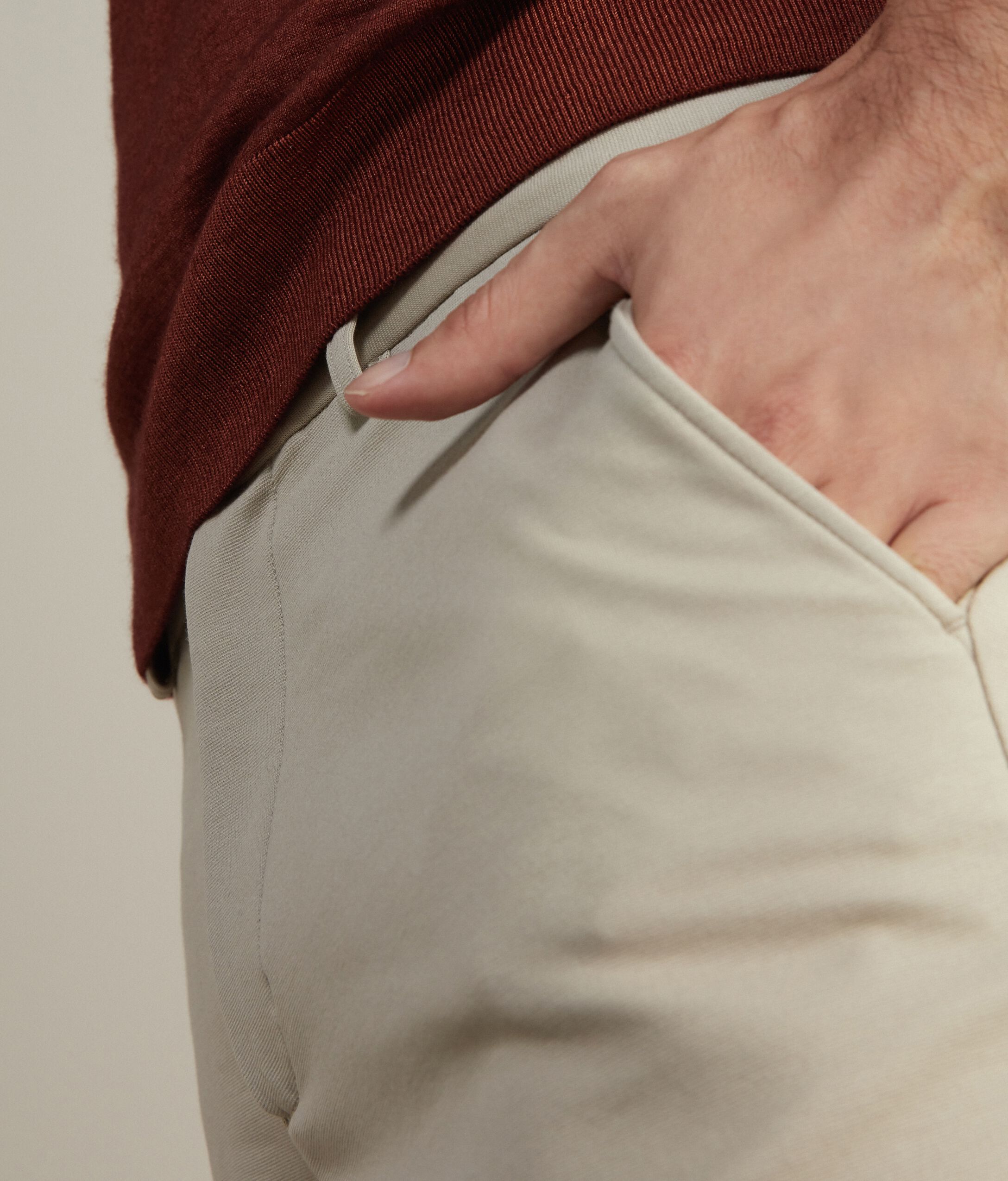 Il pregio delle fibre naturali e l'attenzione per i tagli si coniugano in un pantalone estremamente confortevole dal gusto classico. Un cotone elasticizzato particolarmente confortevole valorizza uno stile pratico, ideale per la quotidianità. La vestibilità è accostata al corpo. Il pantalone è dotato di tasche laterali e apertura con zip. Il modello è alto 184 cm e veste una taglia 50Petto: 98cm / Vita: 82cm / Fianchi: 99cm