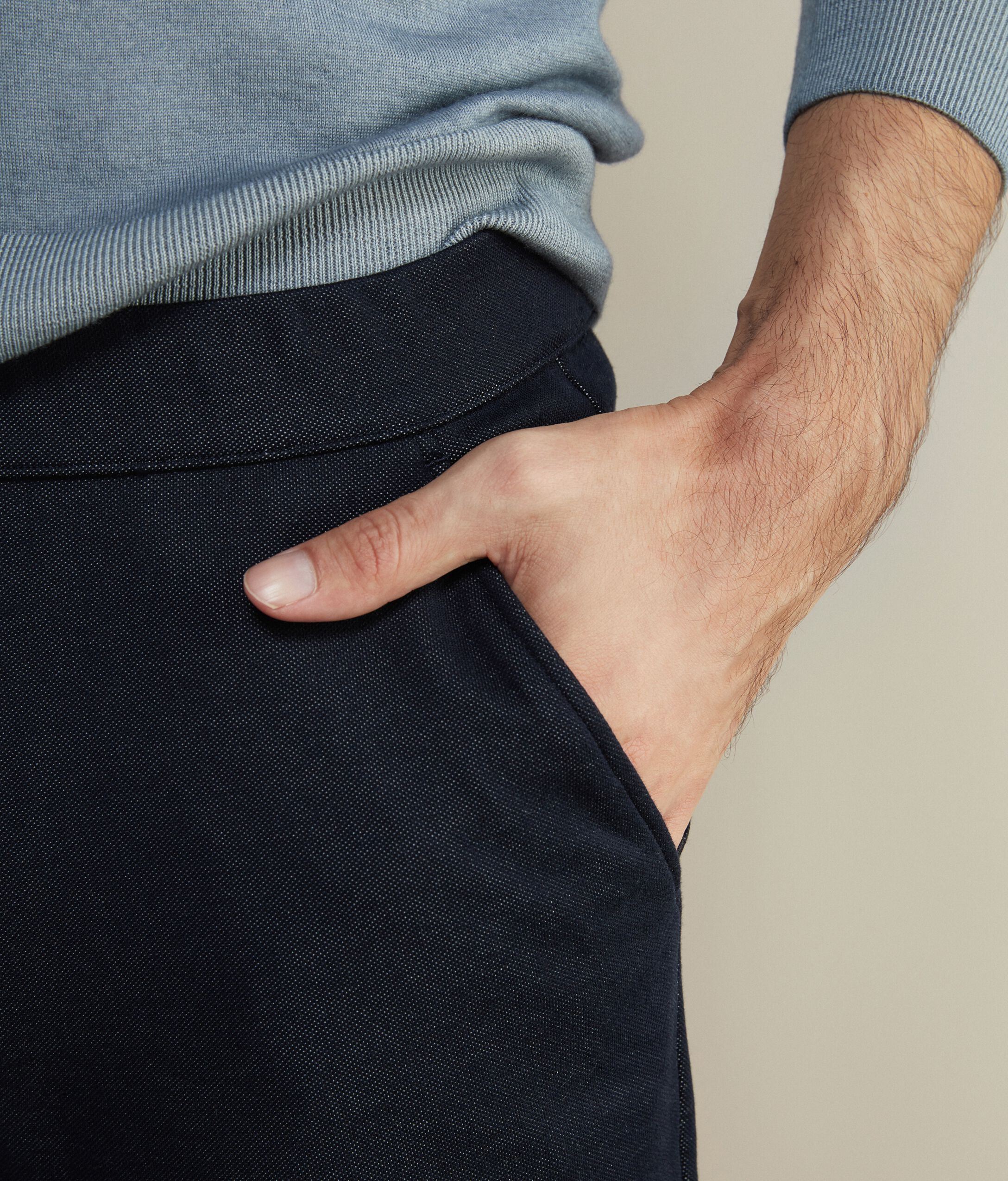 Pantalone realizzato in cotone dall'effetto denim. Presenta elastico in vita e personalizzazione con uno stemma in alcantara sul taschino dietro.