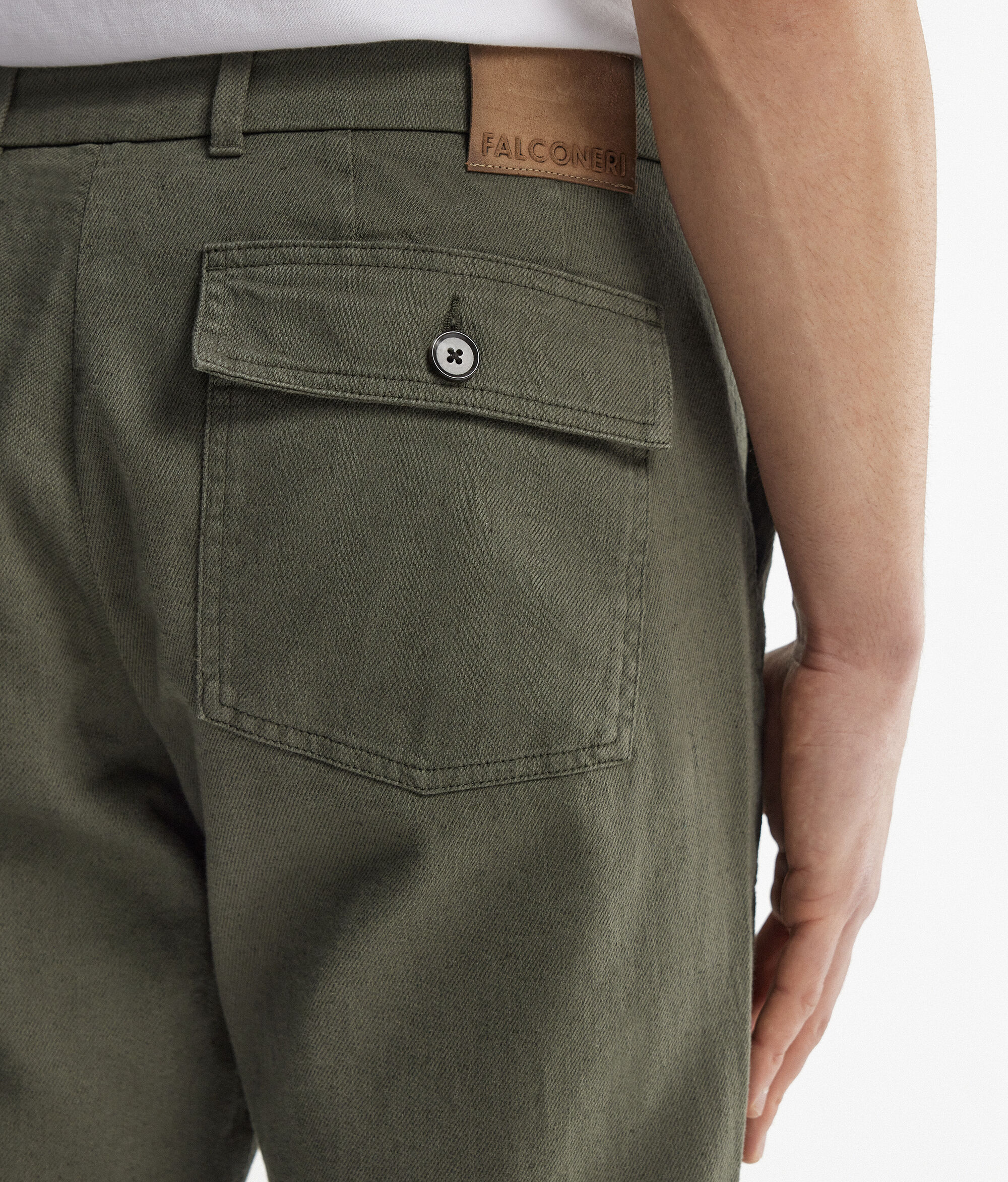 •Tasche ampie sul davanti e tasca applicata con aletta e bottone sul dietro