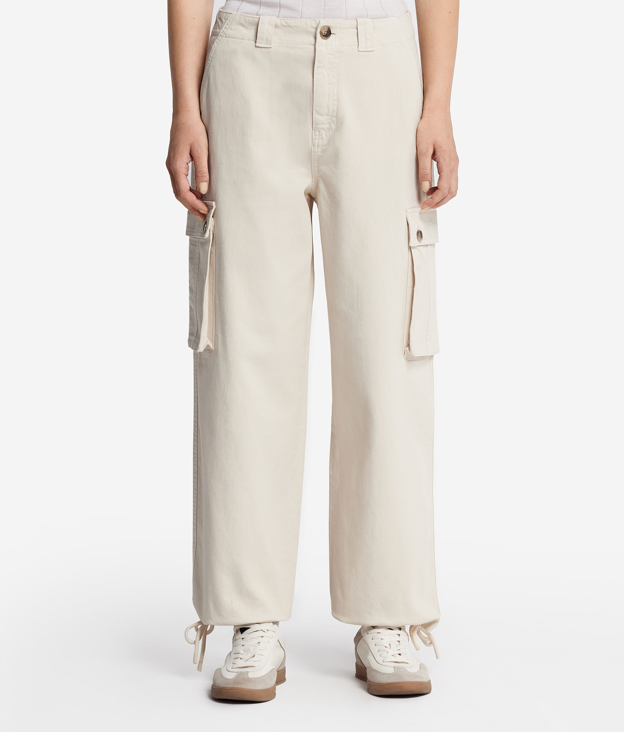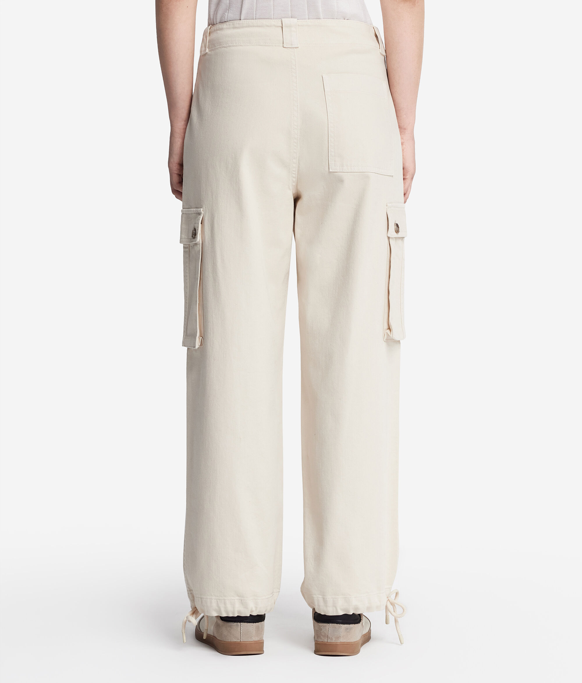 Realizzato interamente in cotone, questo pantalone cargo rappresenta un capo essenziale per il guardaroba che unisce la qualità allo stile. Il design è caratterizzato da ampie tasche applicate su entrambi i lati e da una chiusura frontale con zip. La sua vestibilità morbida conferisce un fit rilassato e naturale che risponde ad uno stile contemporaneo. Un dettaglio distintivo è il fondo con cordone, che permette di arricciare la caviglia donando un tocco personalizzato e originale.