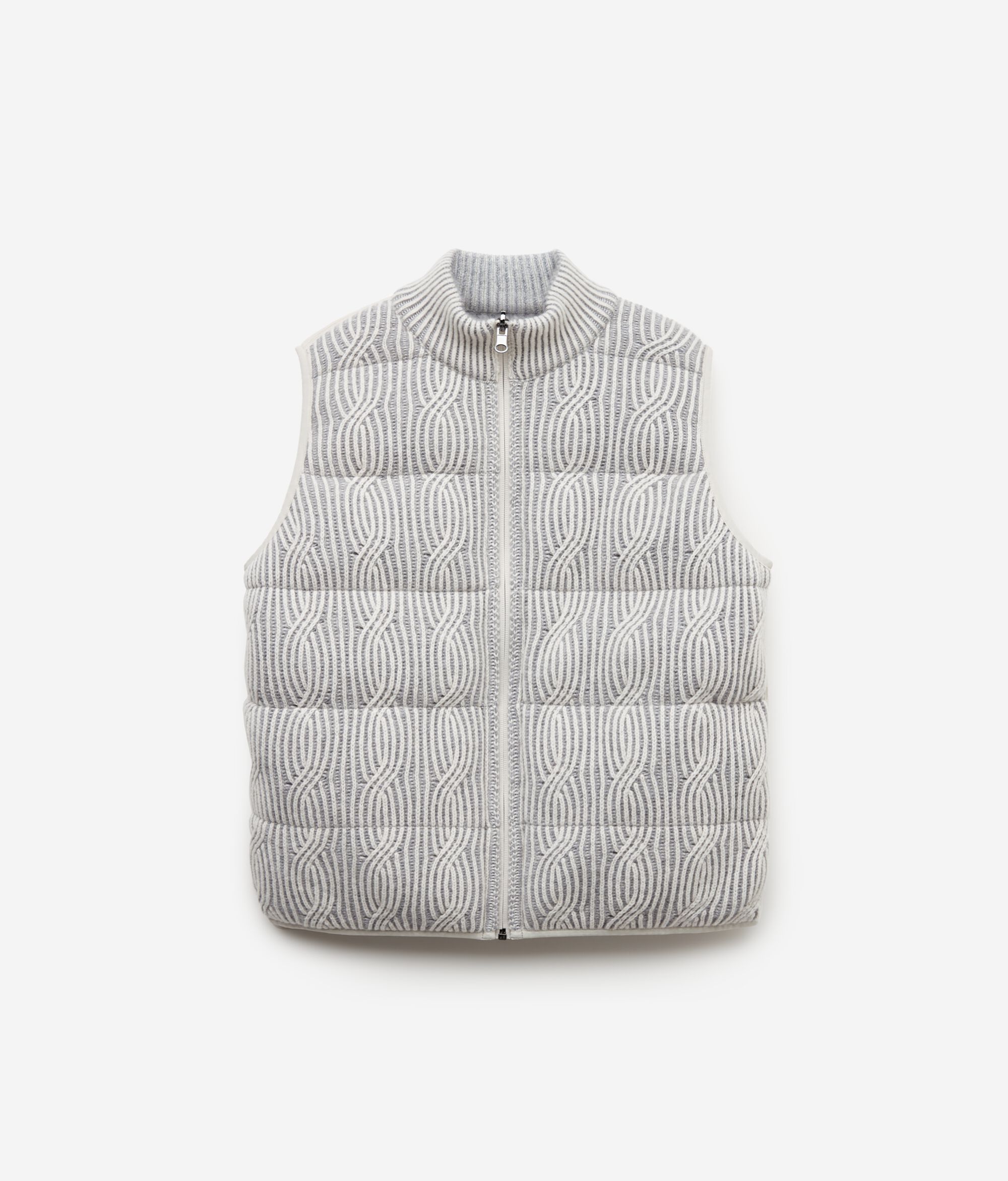 Scopri l'eleganza e la morbidezza di questo piumino smanicato e reversibile. L'interno, in tessuto tecnico, assicura una protezione ottimale nelle giornate più fresche, mentre l'esterno in Cashmere Ultrasoft con una lavorazione a trecce e coste bicolore offre una sensazione unica di morbidezza e calore. La pratica chiusura con zip lo rende versatile e funzionale, perfetto per chi cerca un capo esclusivo senza rinunciare a stile ed eleganza.