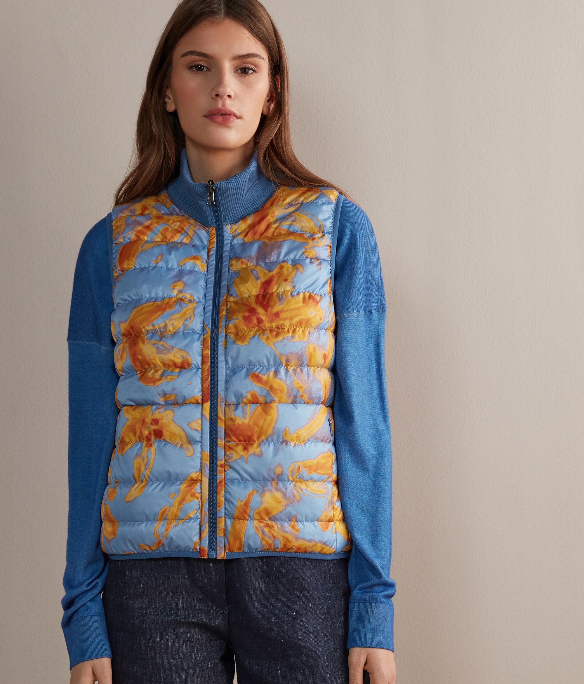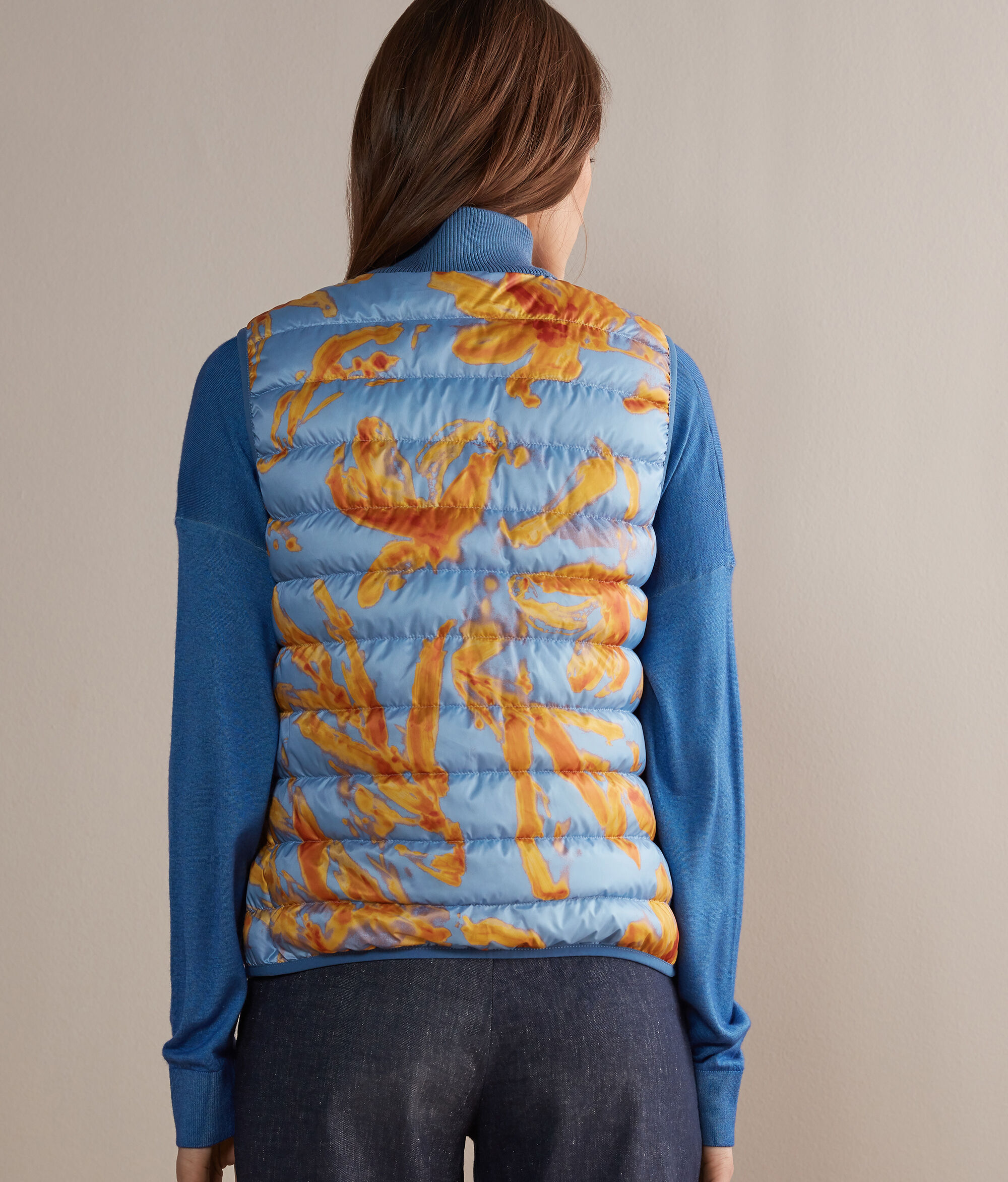 Falconeri propone un'ulteriore versione del piumino smanicato della collezione donna. Il dettaglio del collo alto in cashmere ultrafine arricchisce lo stile sportivo di questo capo per un connubio perfetto tra funzionalità ed eleganza. Grazie alla sua caratteristica double-face, potrai sempre scegliere che stile indossare. Ideale per la stagione di passaggio, aggiungerà un tocco di classe ai tuoi outfit!