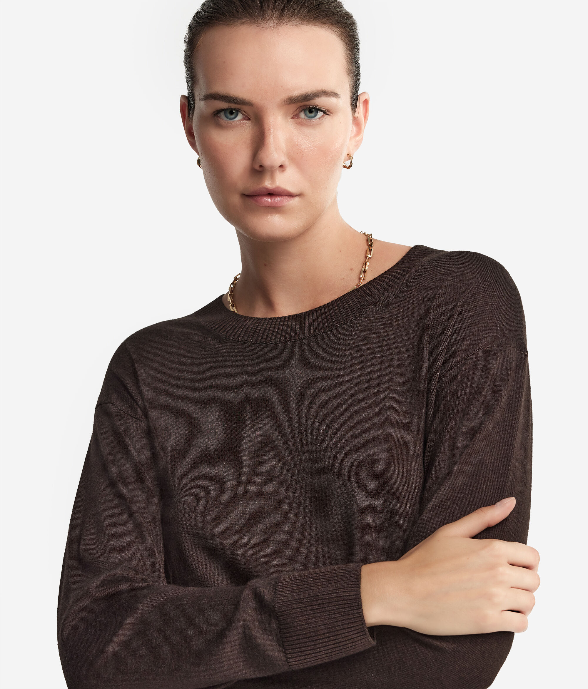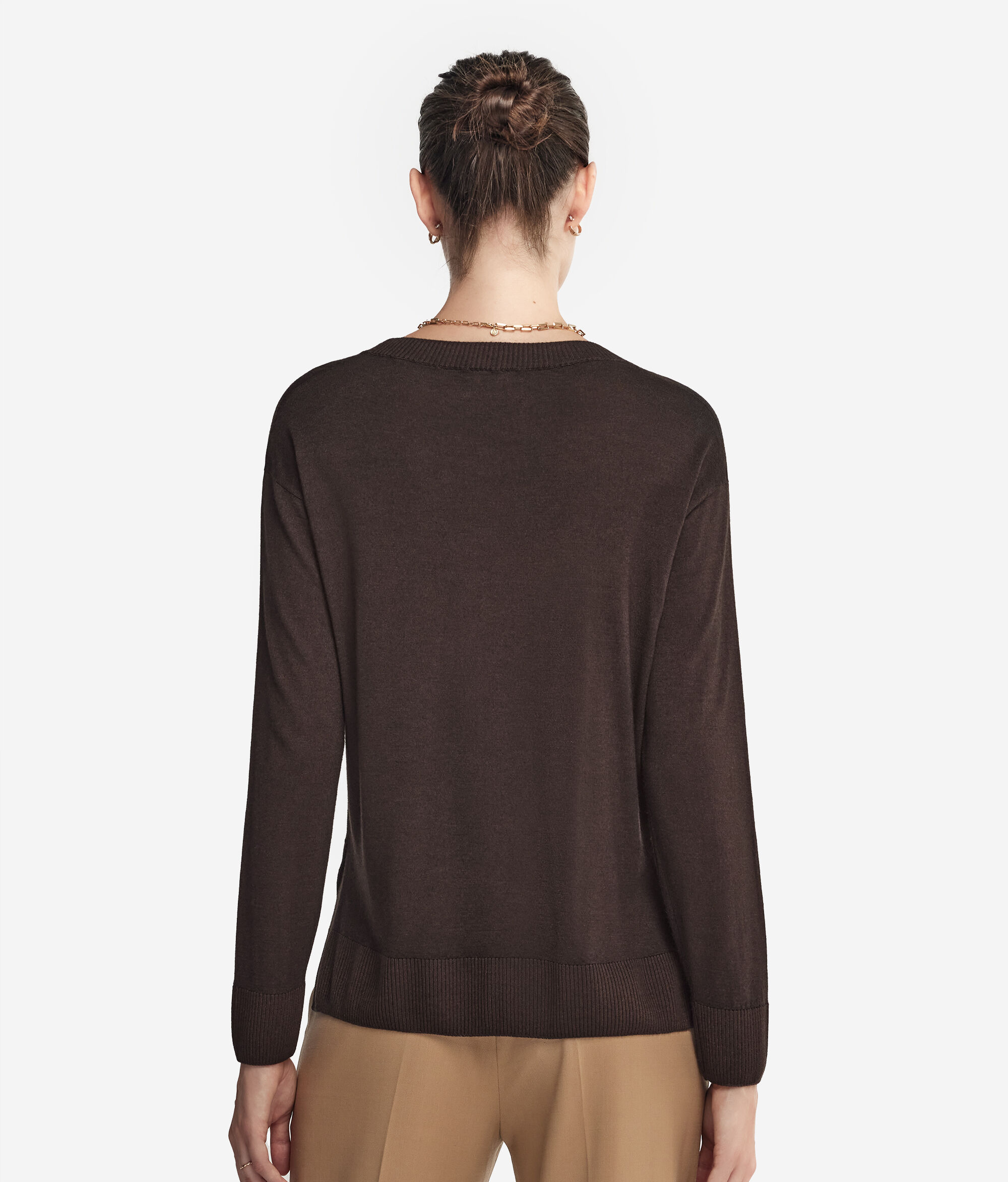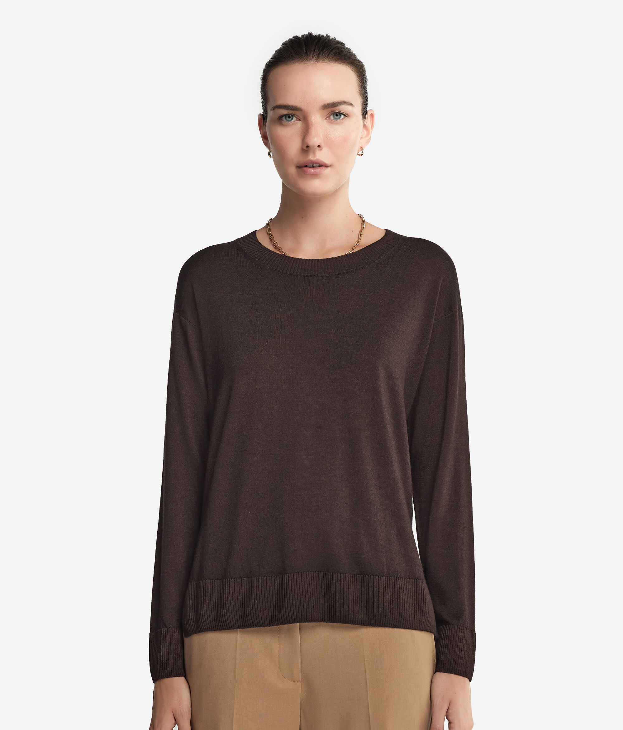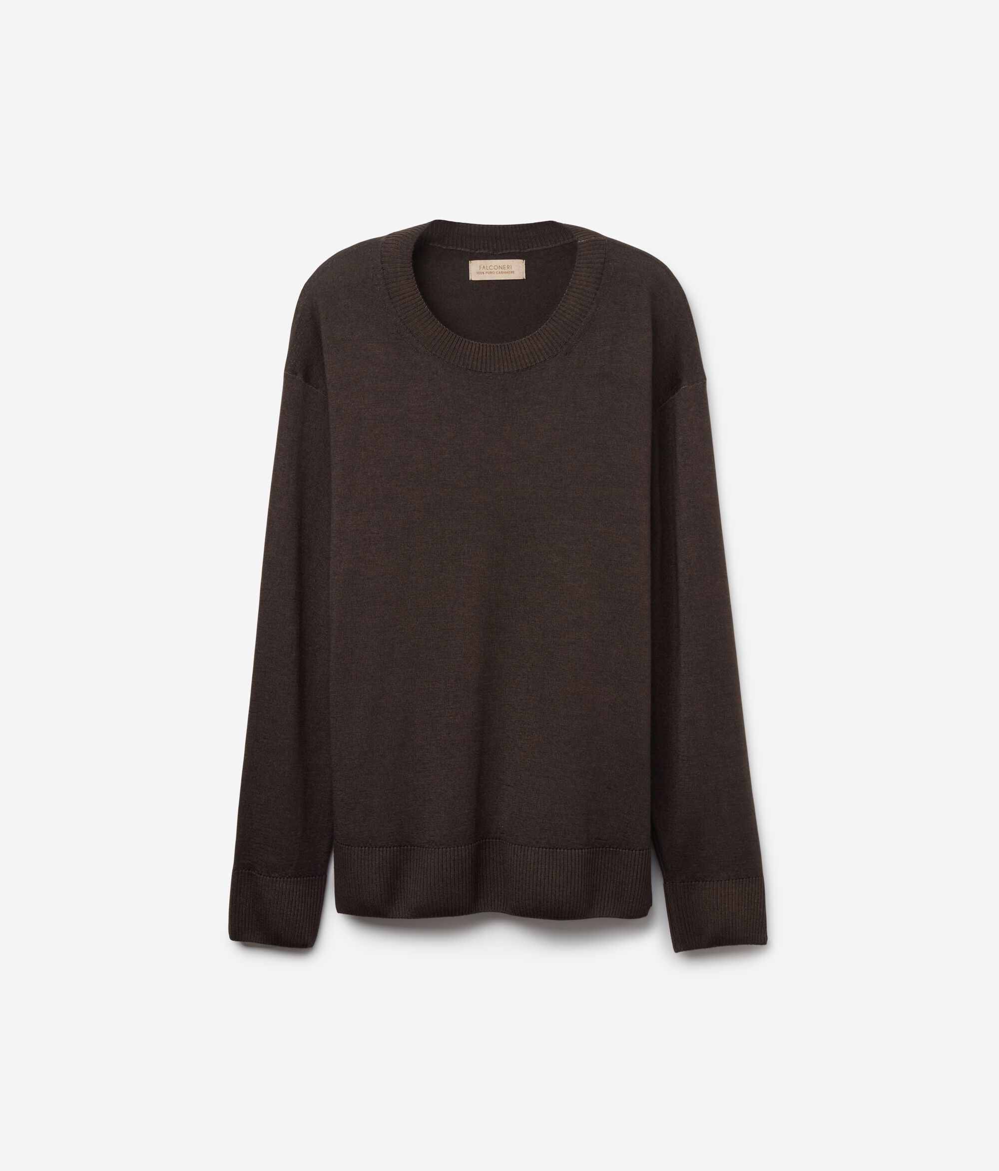 La maglia girocollo realizzata in cashmere ultrafine è un modello a manica lunga che si caratterizza da una lavorazione a costina sullo scollo, sui polsi e sul fondo. La sua peculiarità sono gli spacchi laterali. Le spalle sono leggermente scese e sua vestibilità è morbida.
